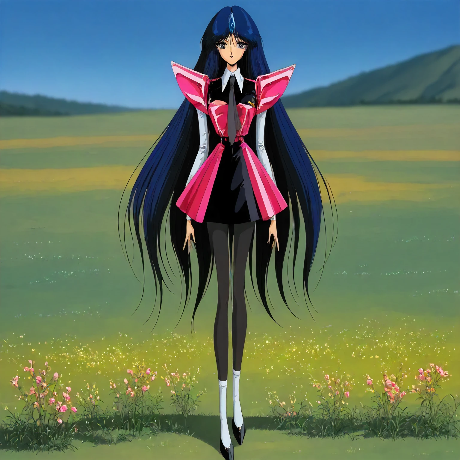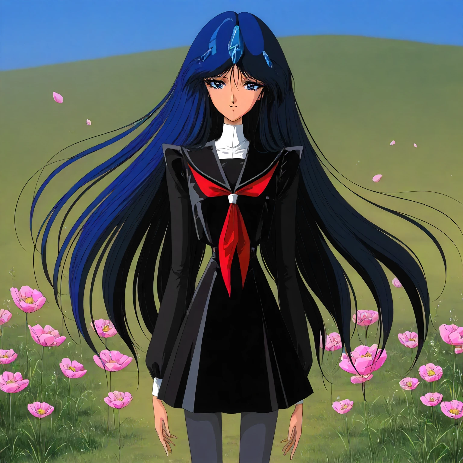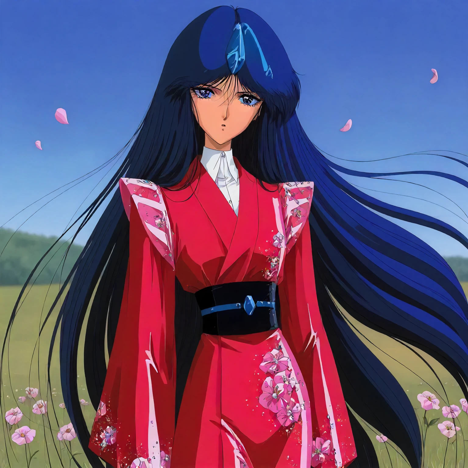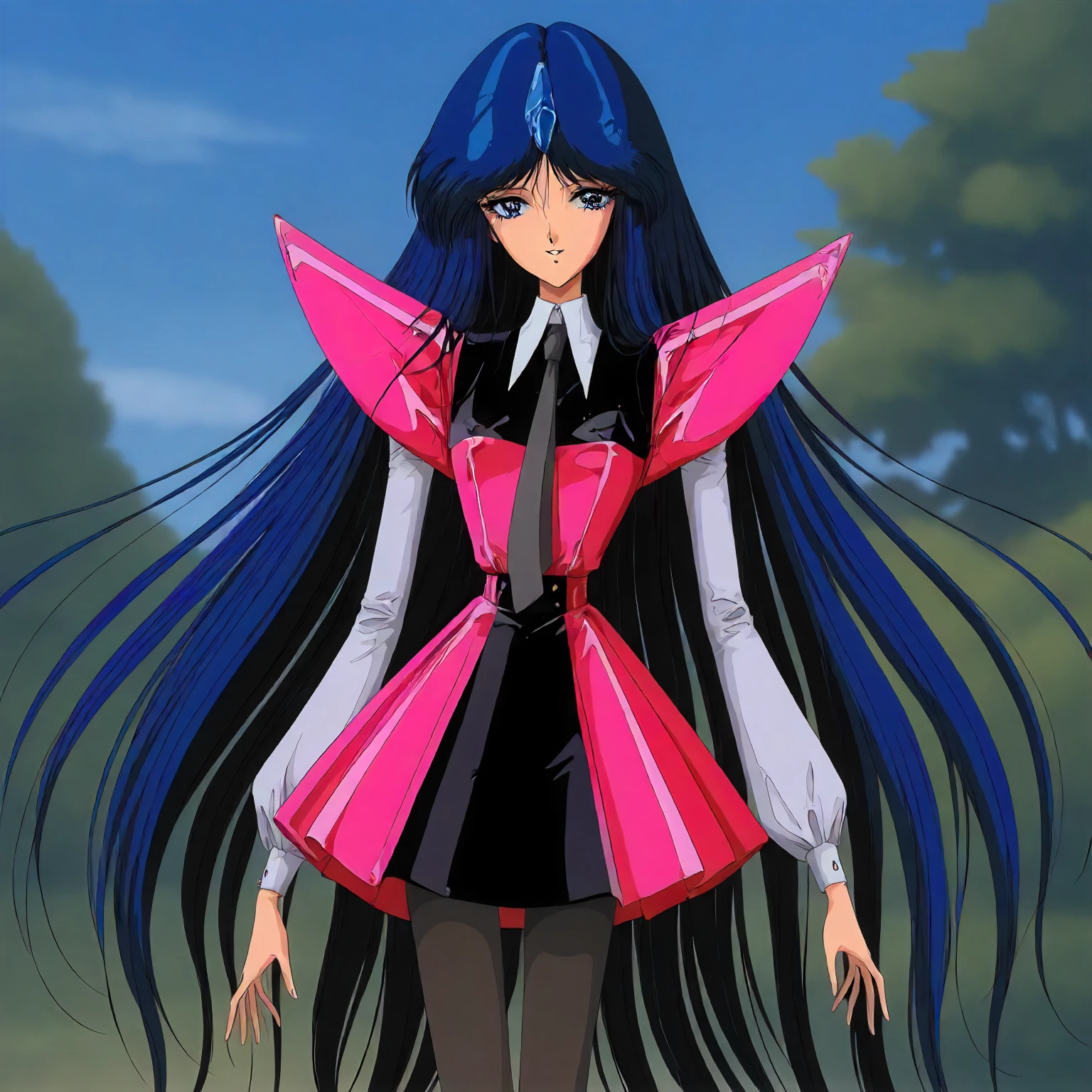 anime coloring,retro artstyle, fatima_clotho\(five_star_story\),1girl,black-blue hair,long hair,head jewel,blue eyes,skinny,skinny,