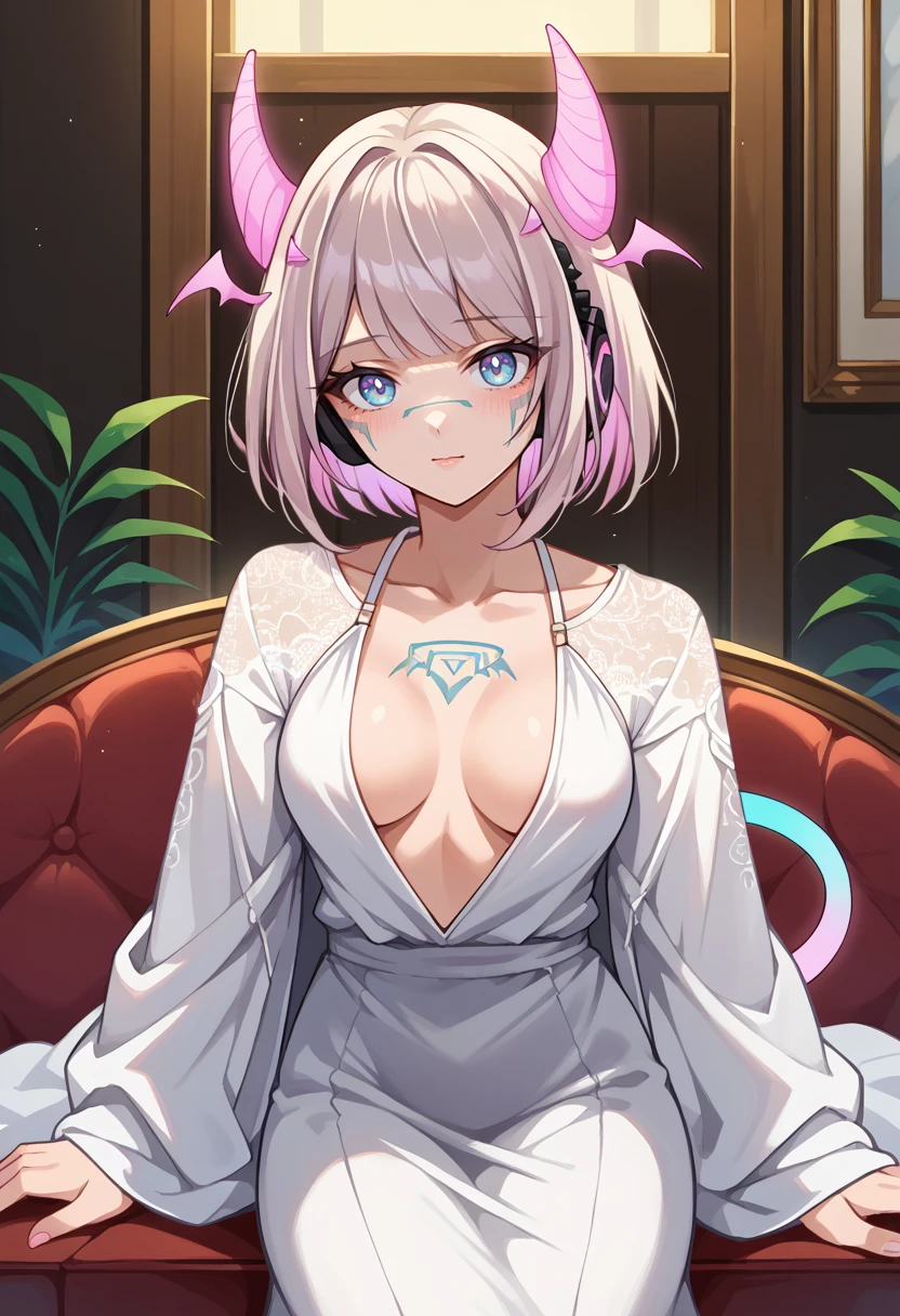 MotherV3, short hair, multicolored eyes, pink horns, head wings, facial mark, headphones, tailDefault outfit: