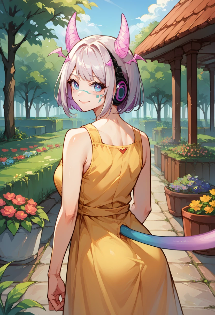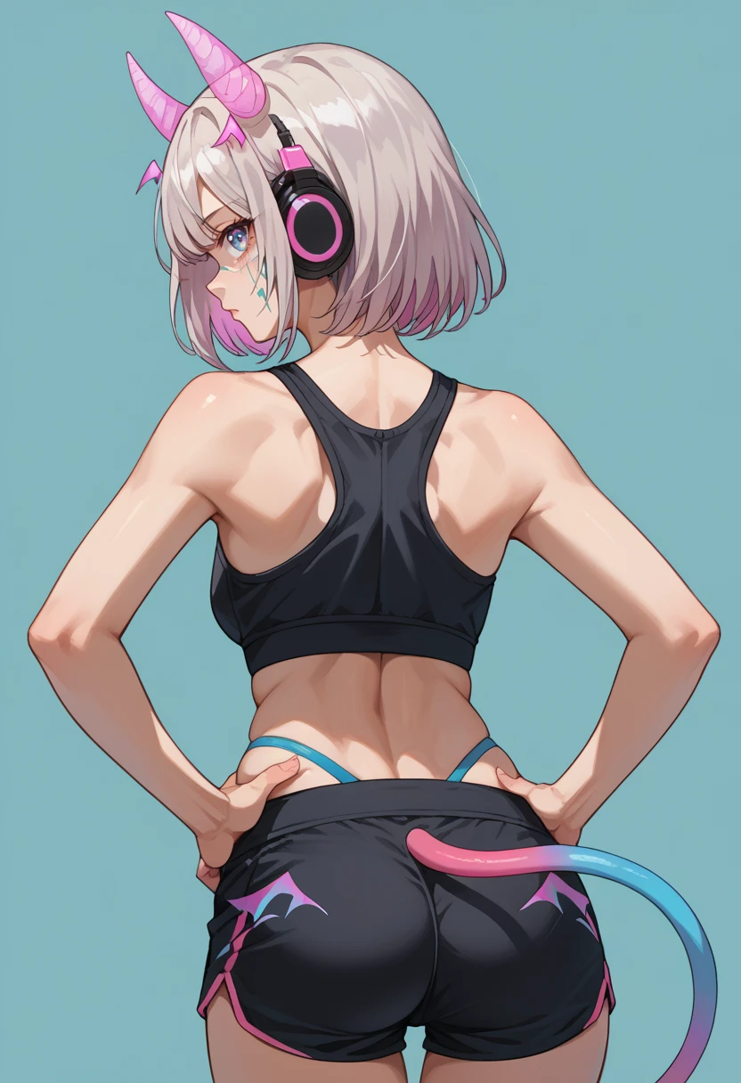 MotherV3, short hair, multicolored eyes, pink horns, head wings, facial mark, headphones, tail