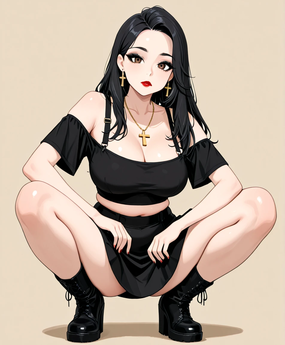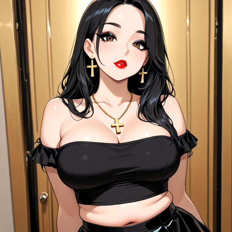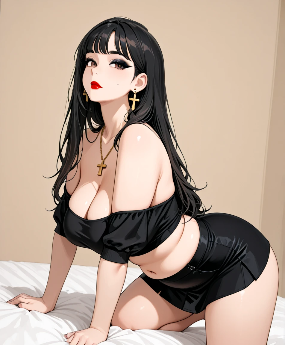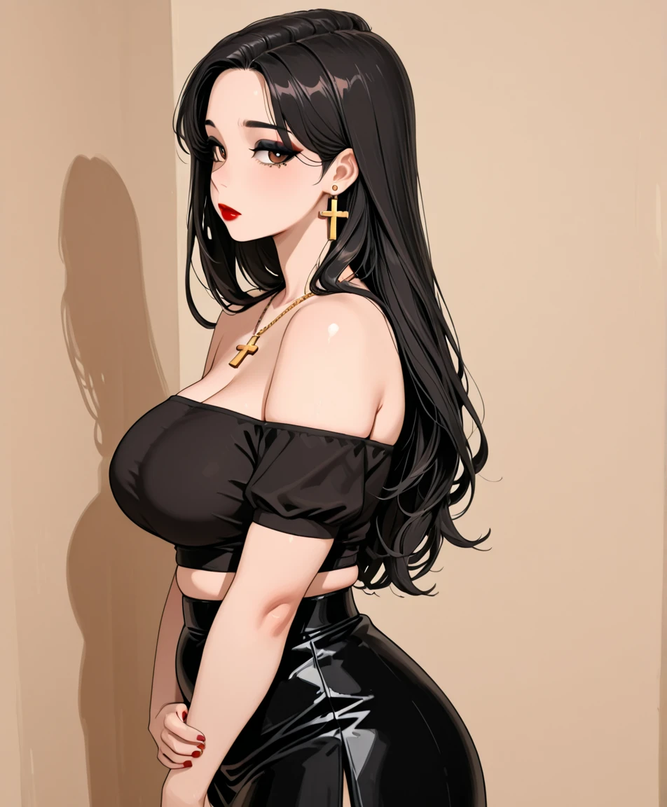 Cassandra is a woman of enigmatic allure, suspended between sacred symbolism and modern seduction. Her long black hair frames a defined, expressive face illuminated by gold accessories that reinterpret religious iconography through a contemporary, high-fashion lens. She wears structured, glossy black clothing that enhances her silhouette and creates a striking contrast with the ornate golden environments that often surround her.