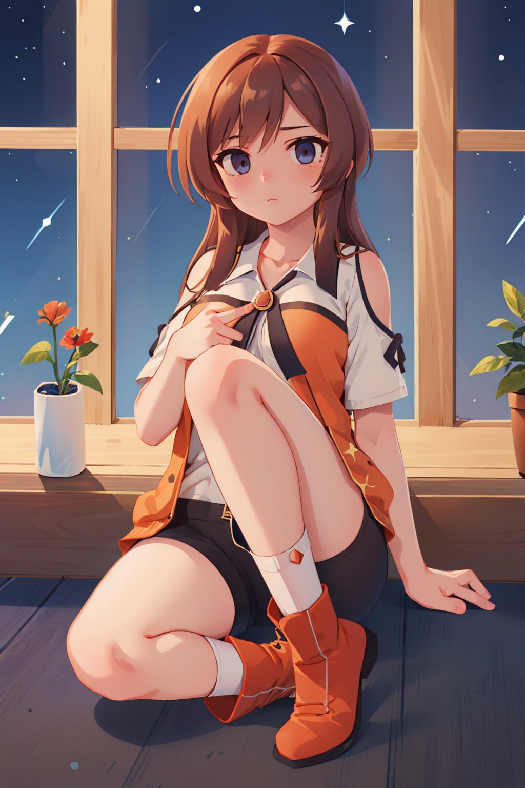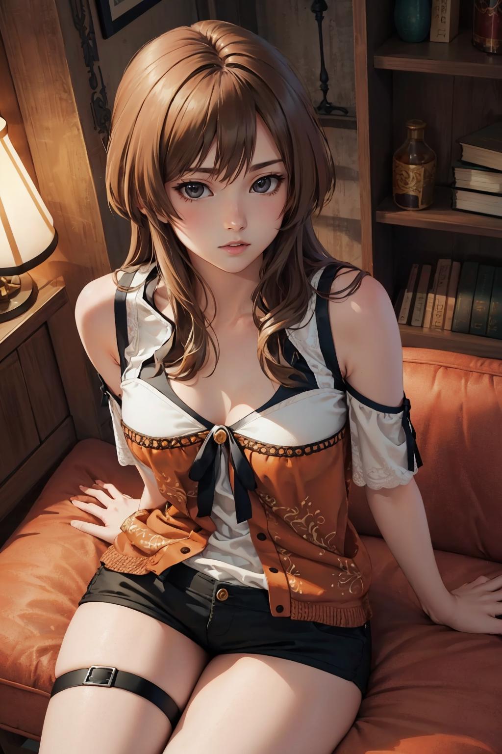 Add "shirt, short shorts, thigh strap" for her typical look.