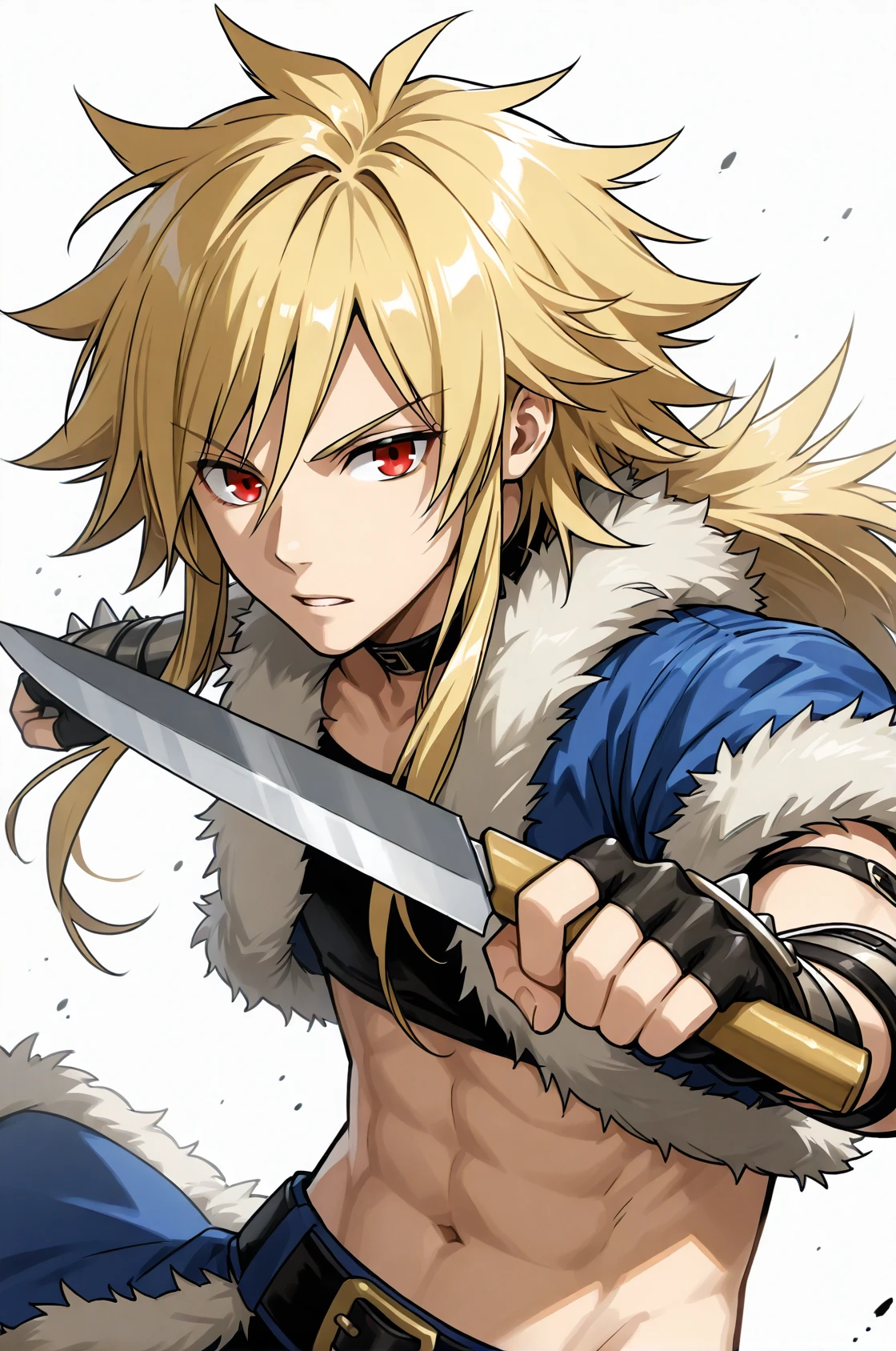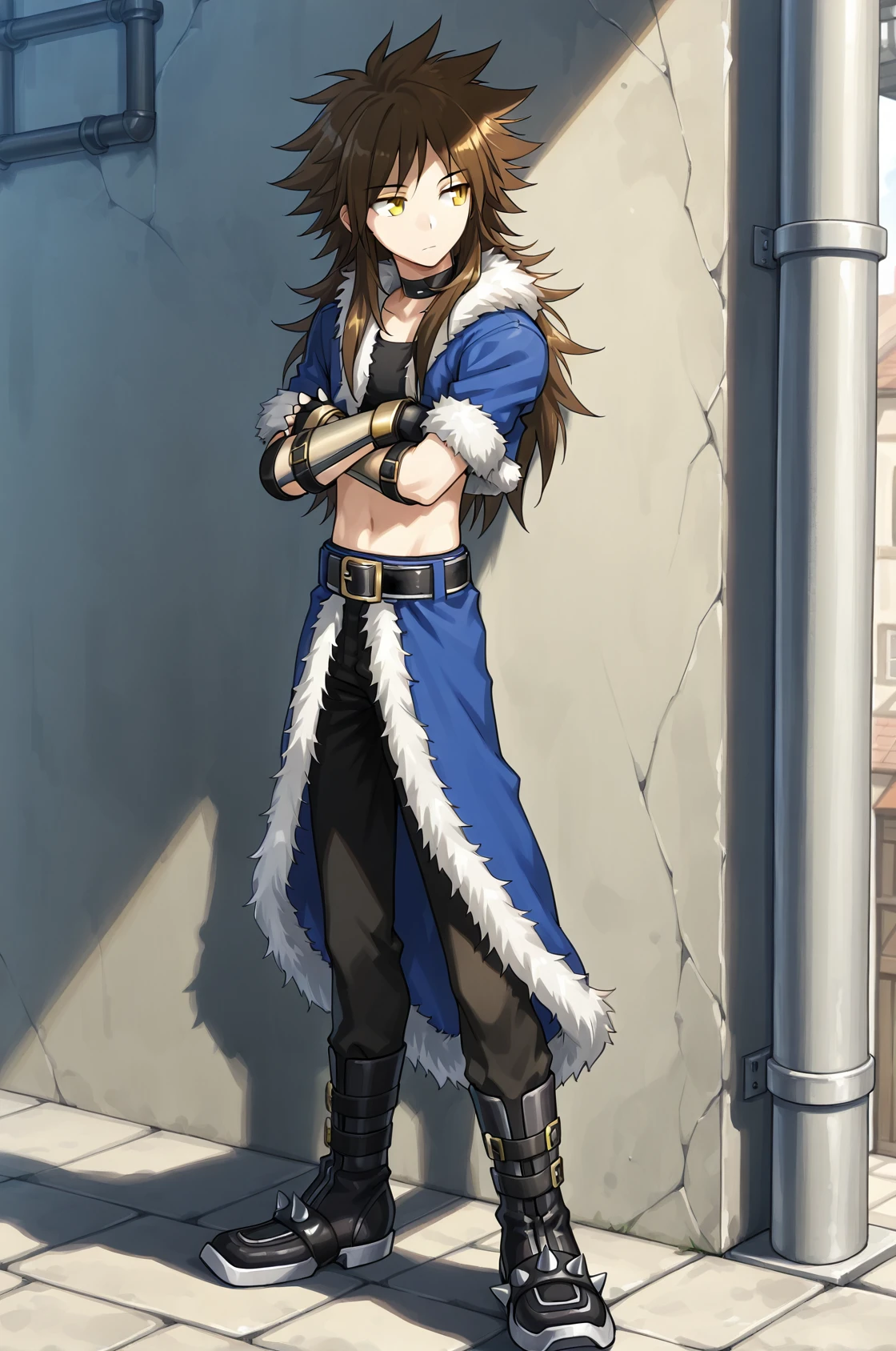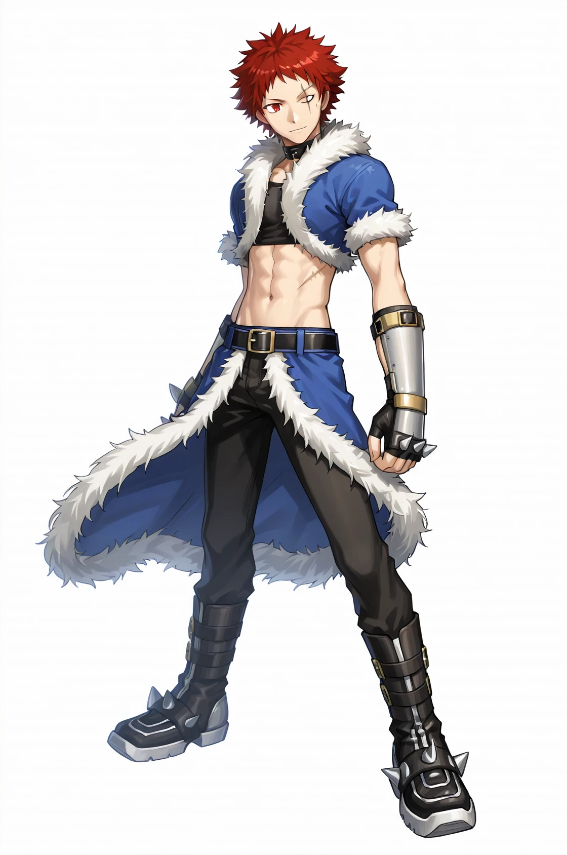 prompt: stalkROMale, fingerless gloves, arm guards, fur trim, black collar, midriff, black crop top, blue cropped jacket, blue waist cape, belt, navel, black pants, black boots