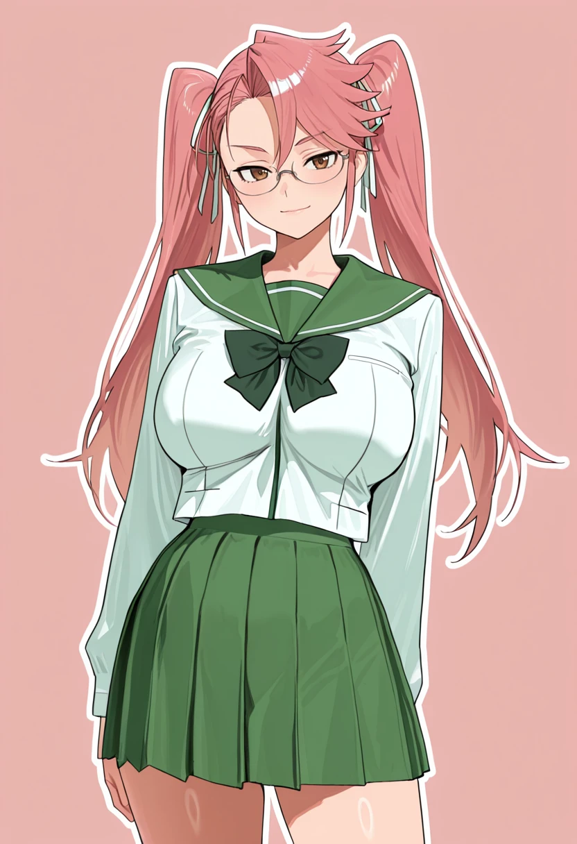 T4k4g1s4y4sknsfw, pink hair, brown eyes, hair ribbon, glasses, twintails, long hair,