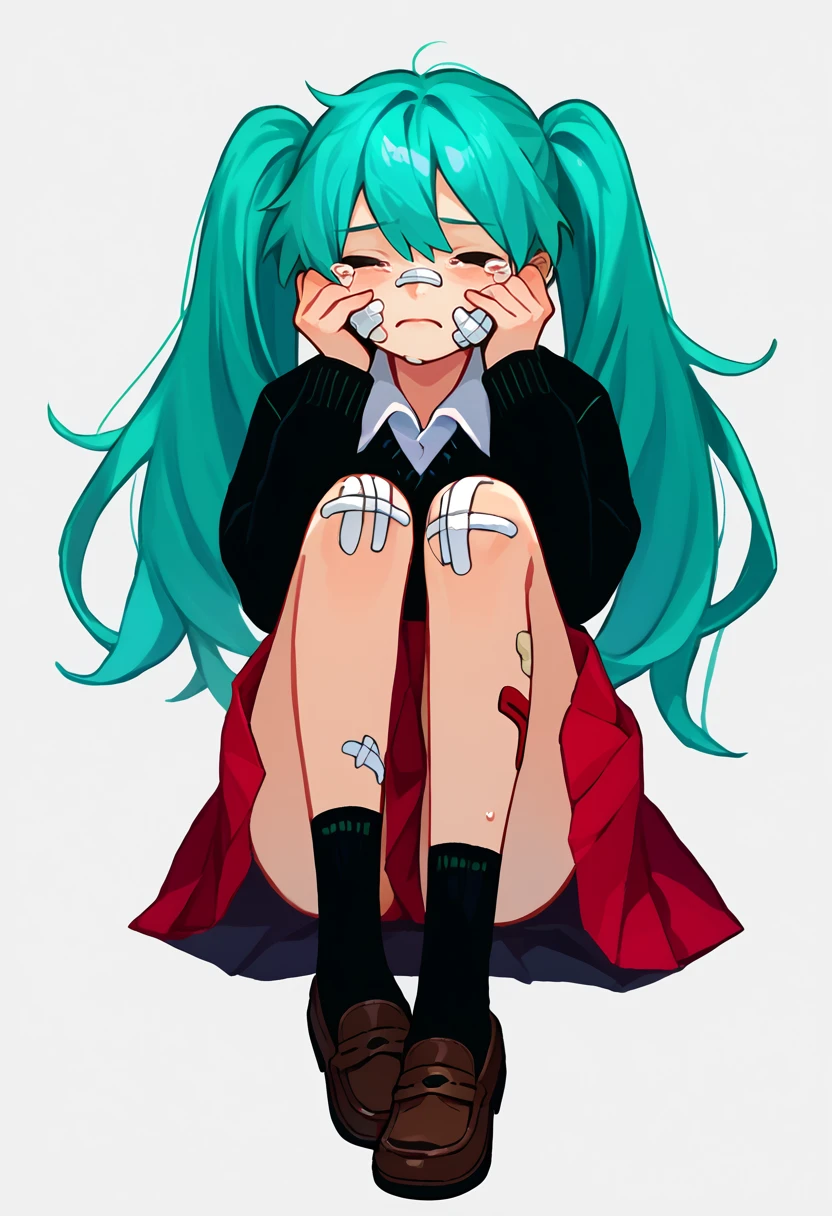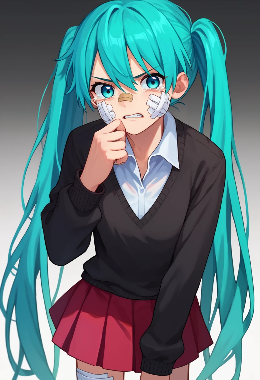 rollinggirlmiku, bandaid on face, aqua hair, twintails, aqua eyes