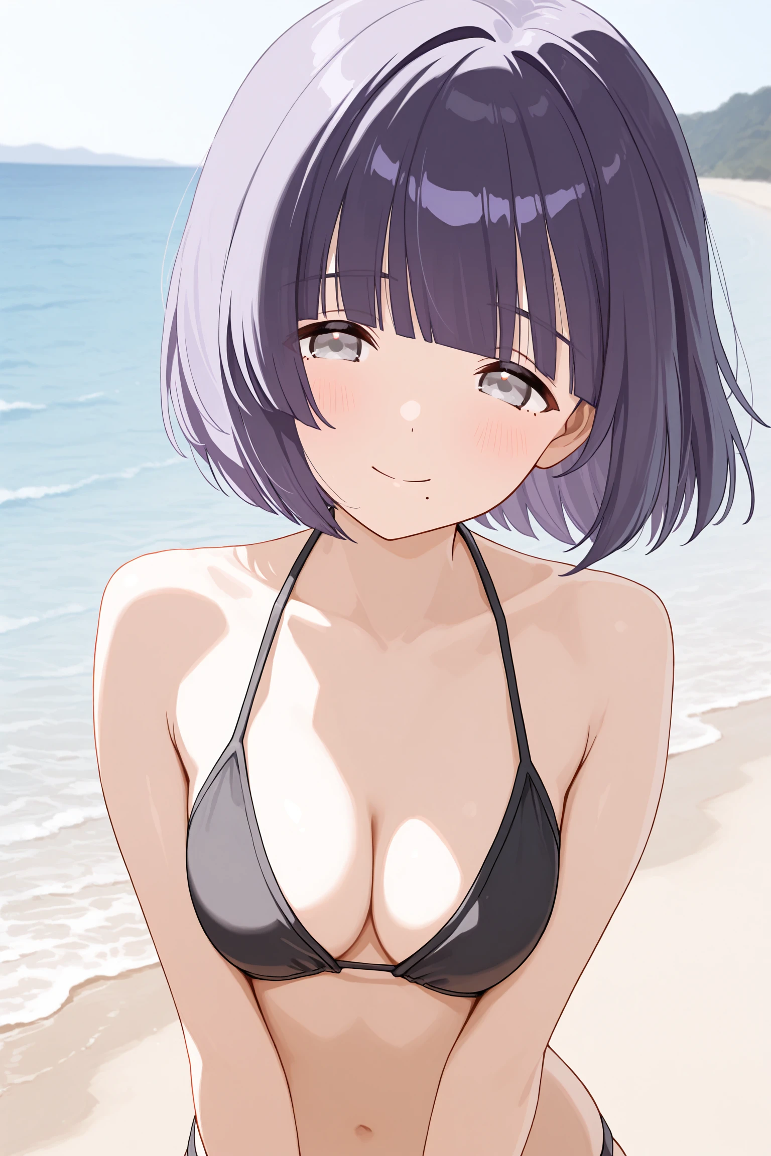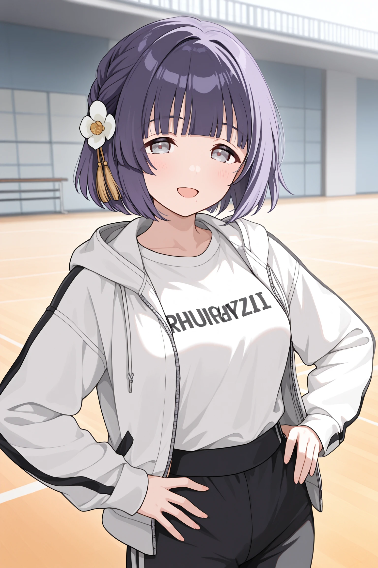 purple hair, blunt bangs, flower hair ornament, hair yellow ribbon, braid, short hair, grey eyes, mole under mouth
