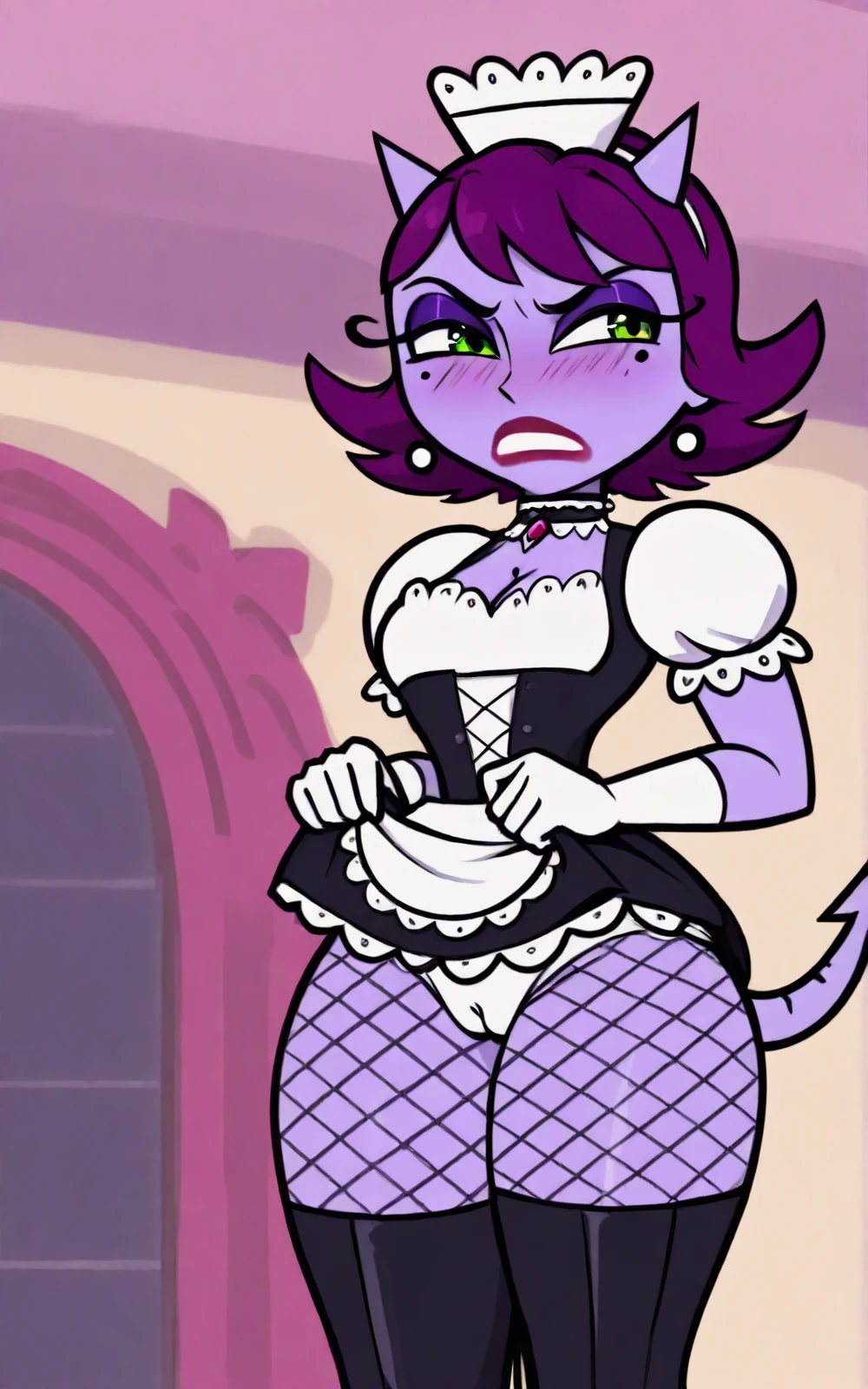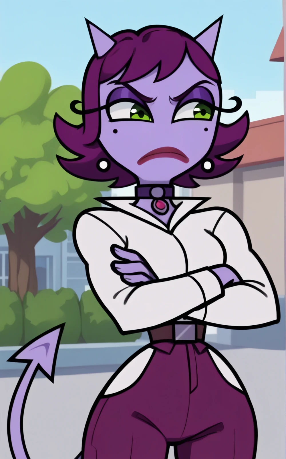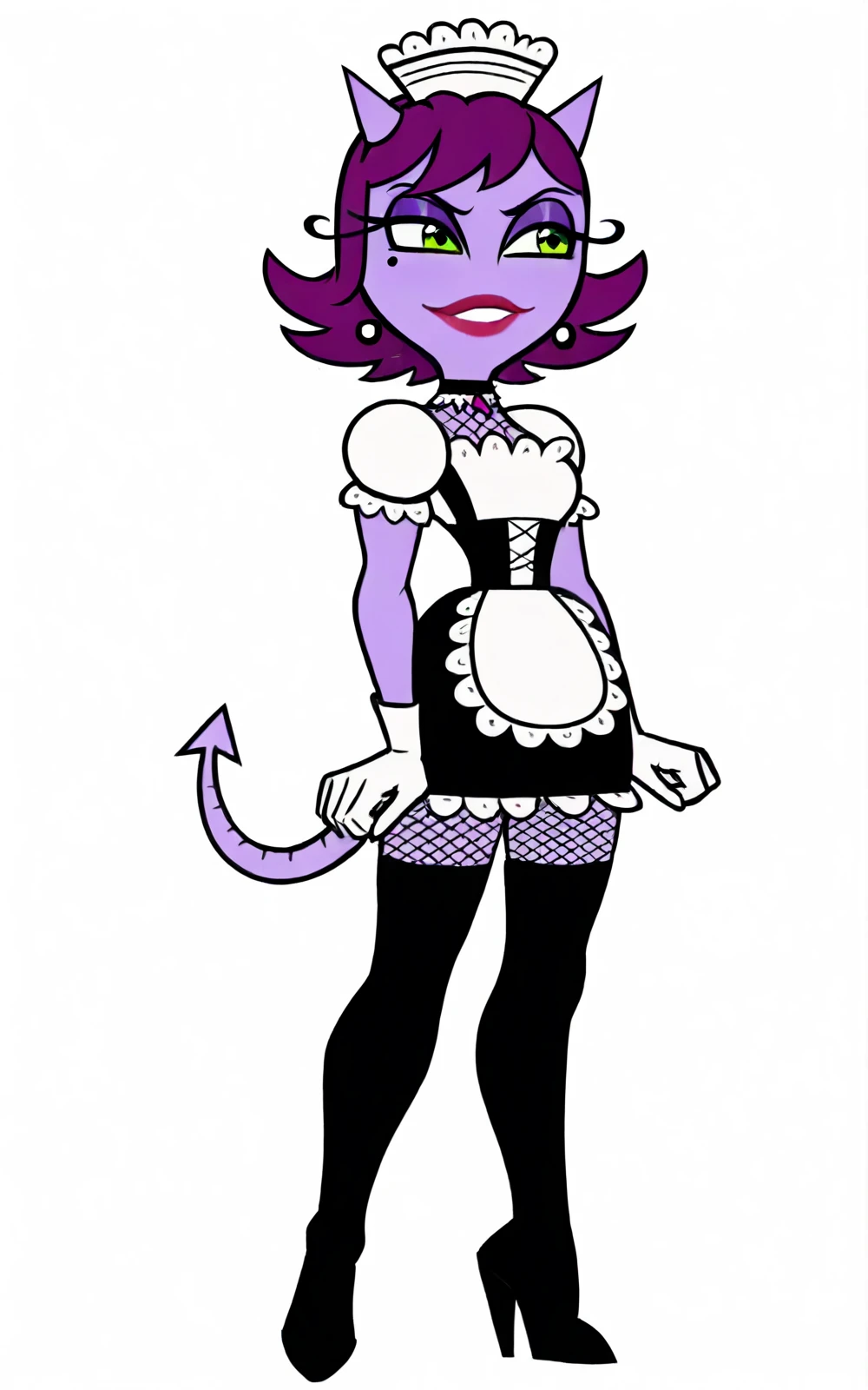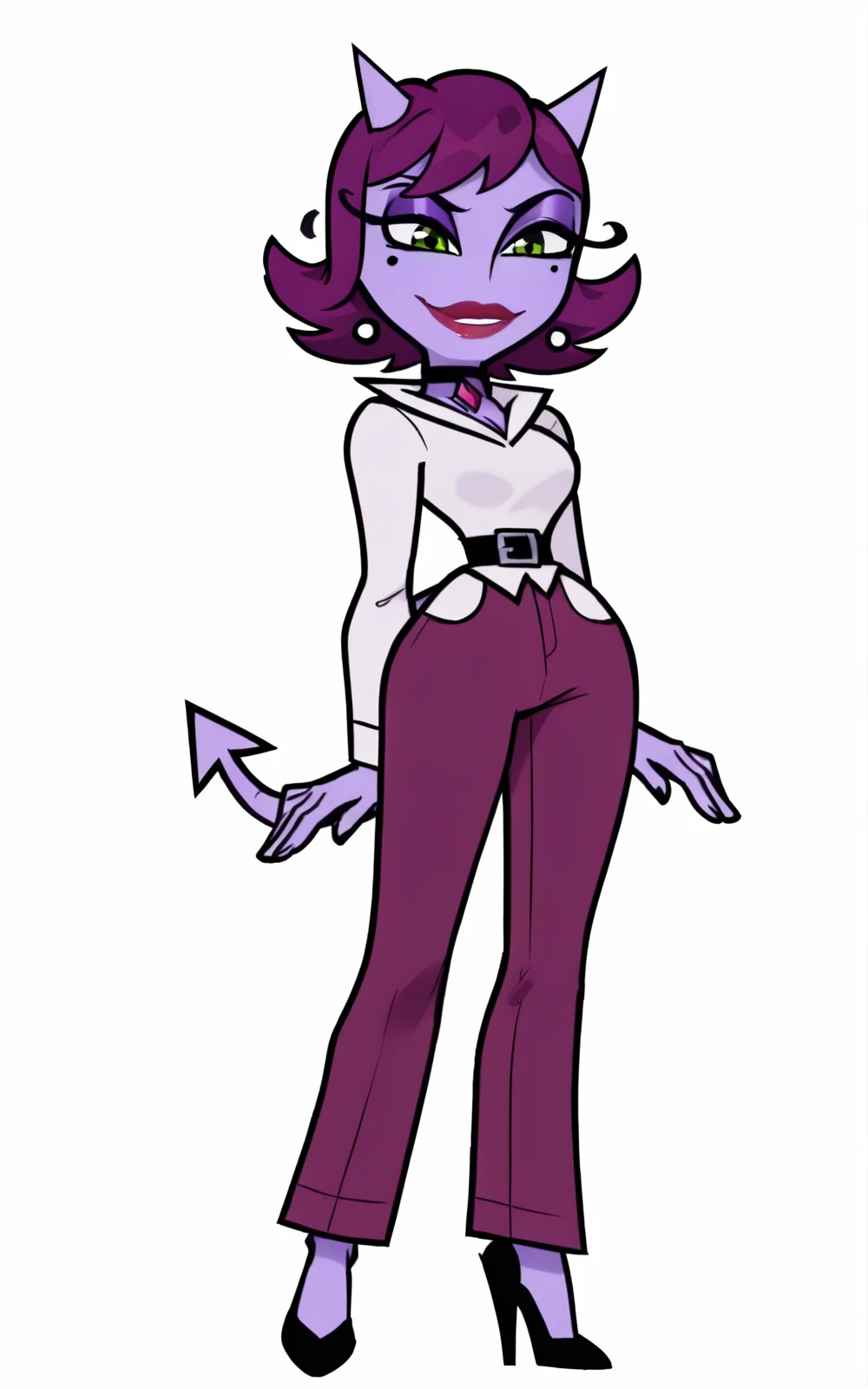 Reinforcement Tags: short hair, tail, purple hair, horns, mole, mole under eye, makeup, colored skin, demon girl, lipstick, demon tail, purple skin, green eyes