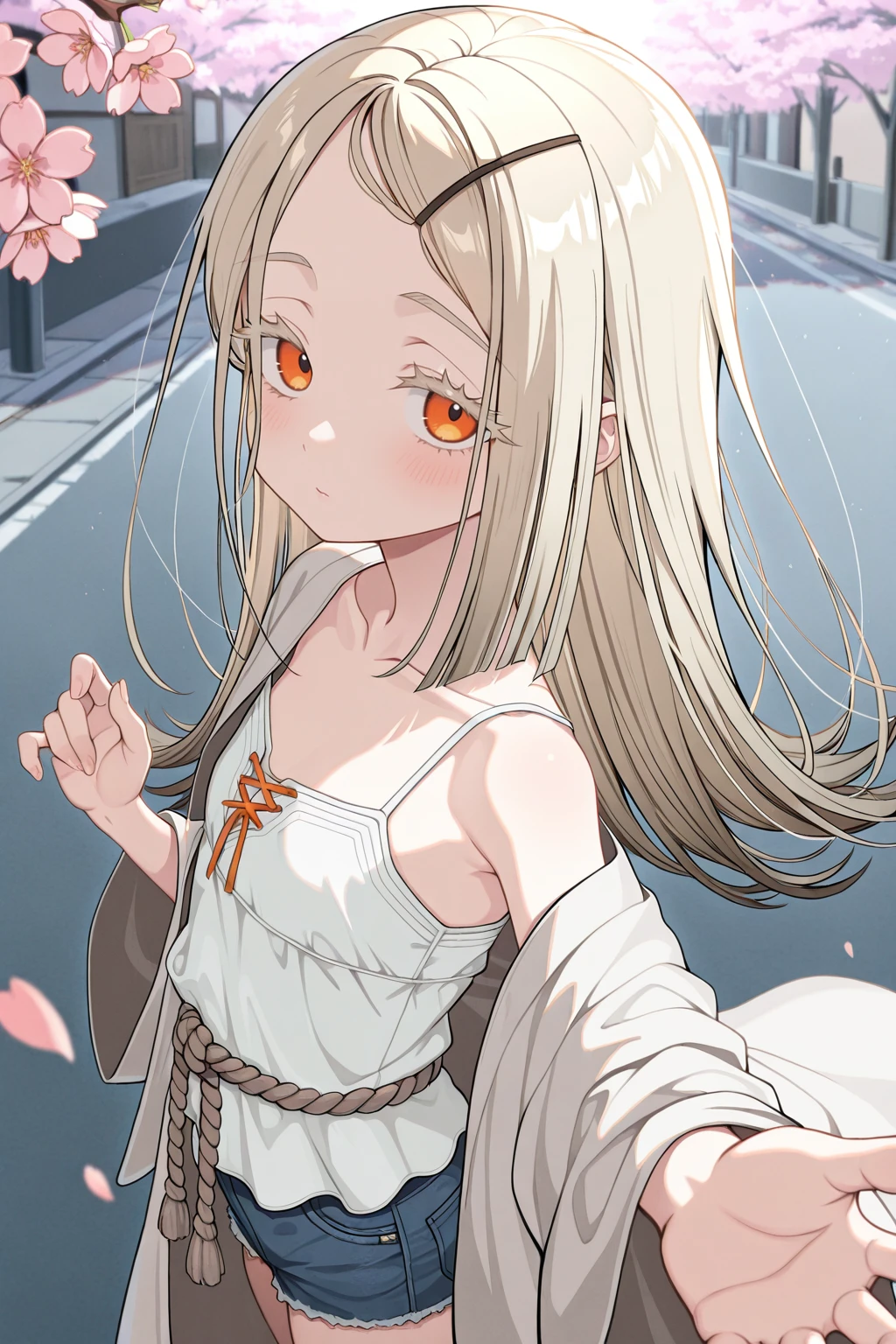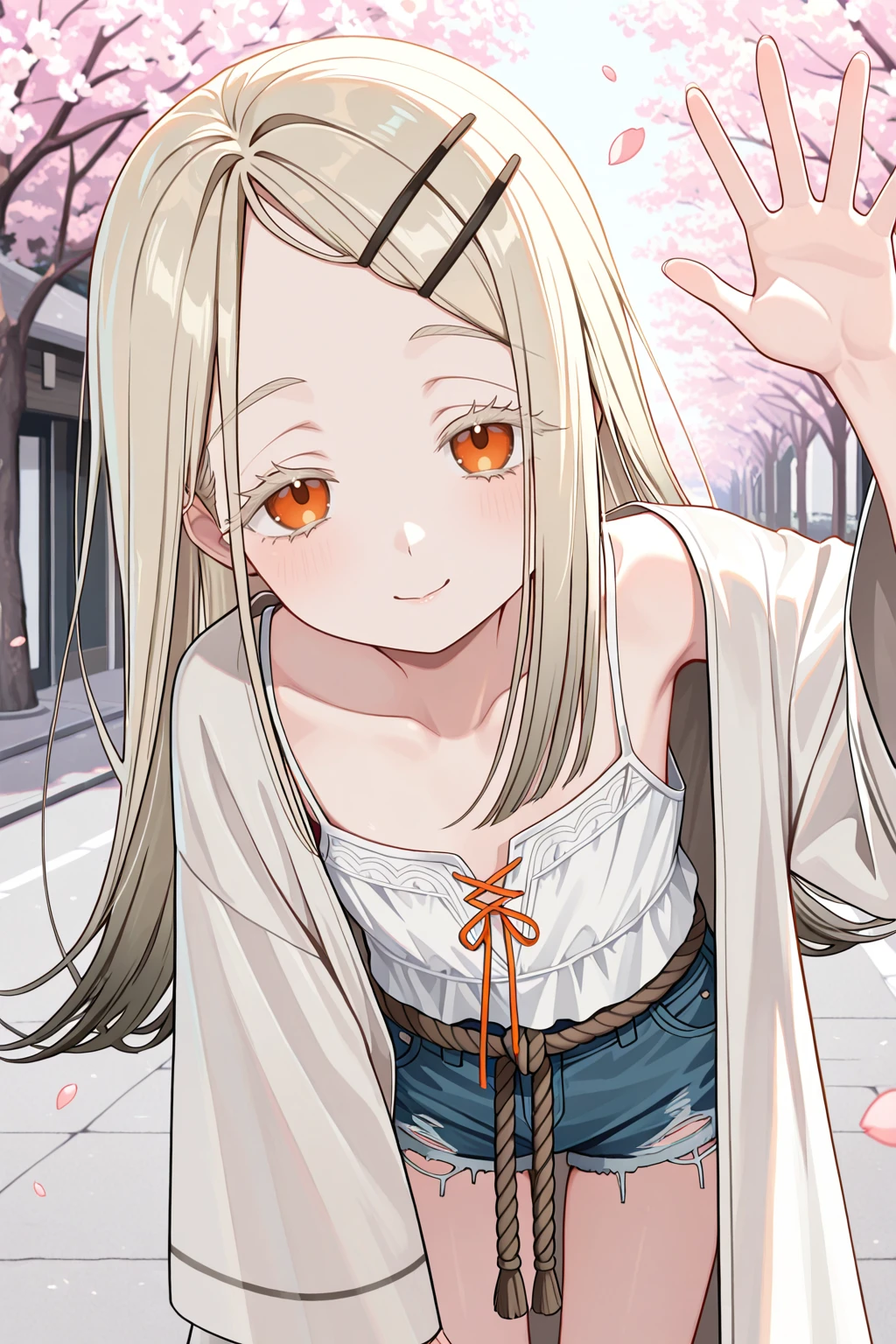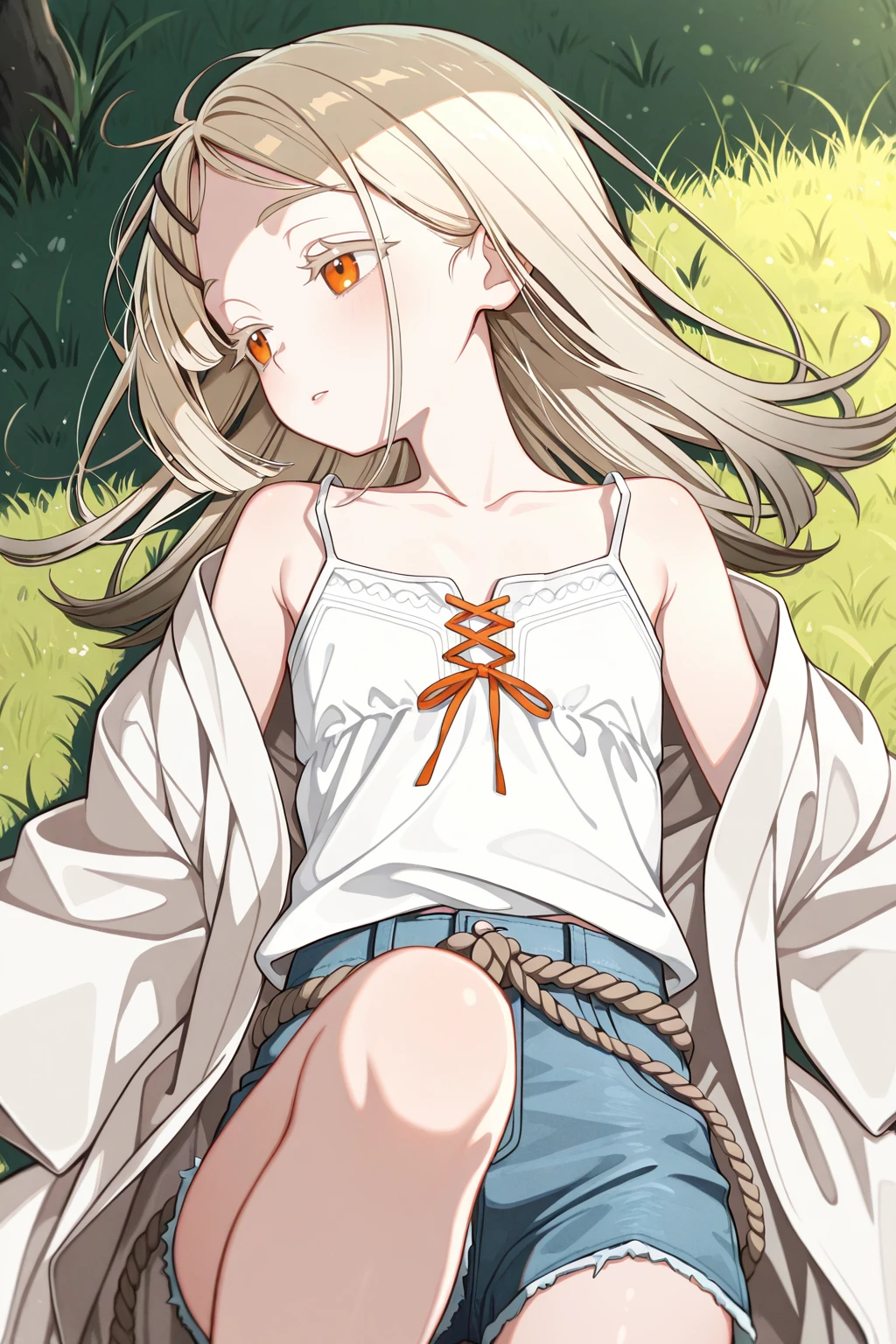 camisole, collarbone, denim shorts, robe, rope belt, short shorts, white camisole, white robeDescription