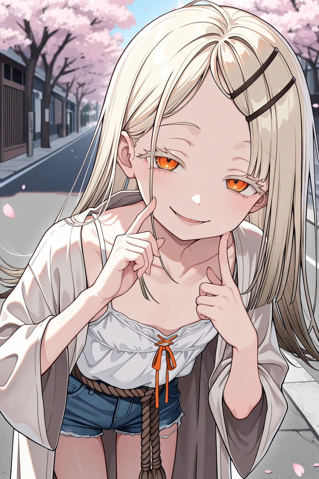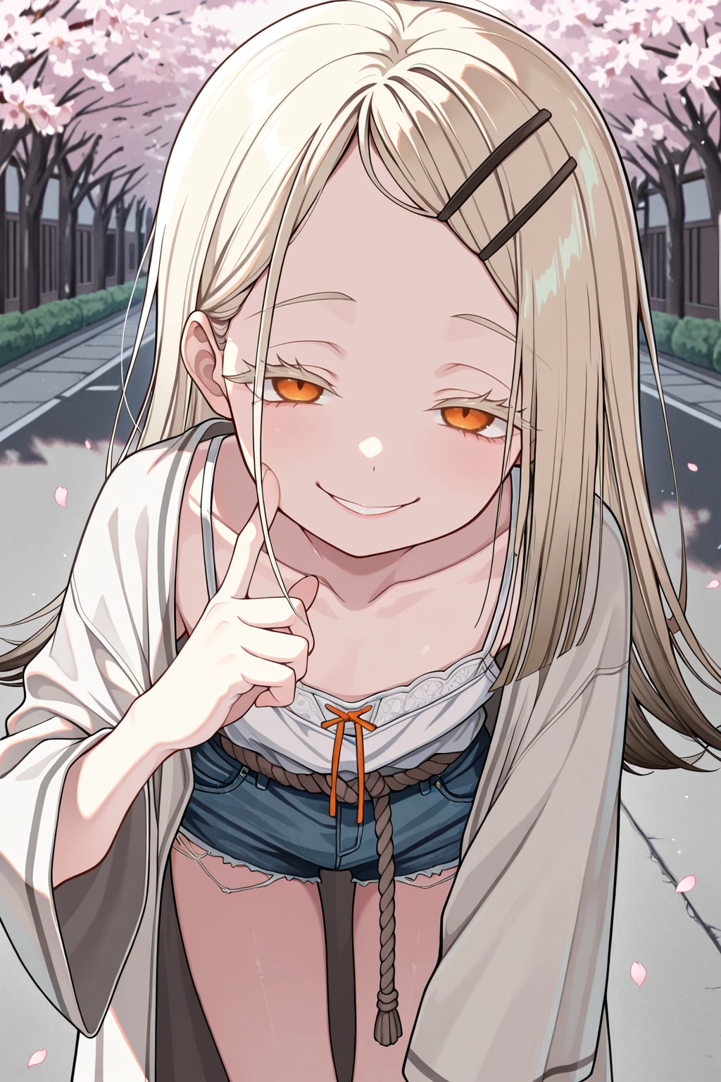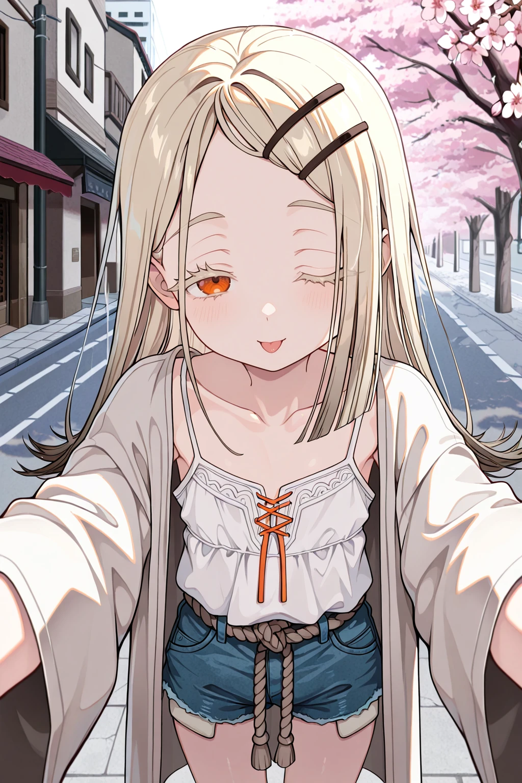 camisole, collarbone, denim shorts, robe, rope belt, short shorts, white camisole, white robeDescription