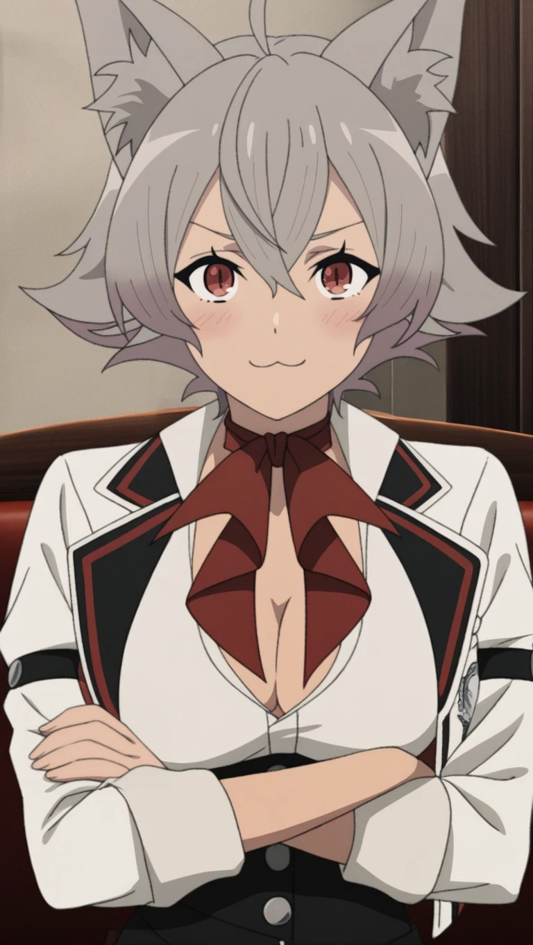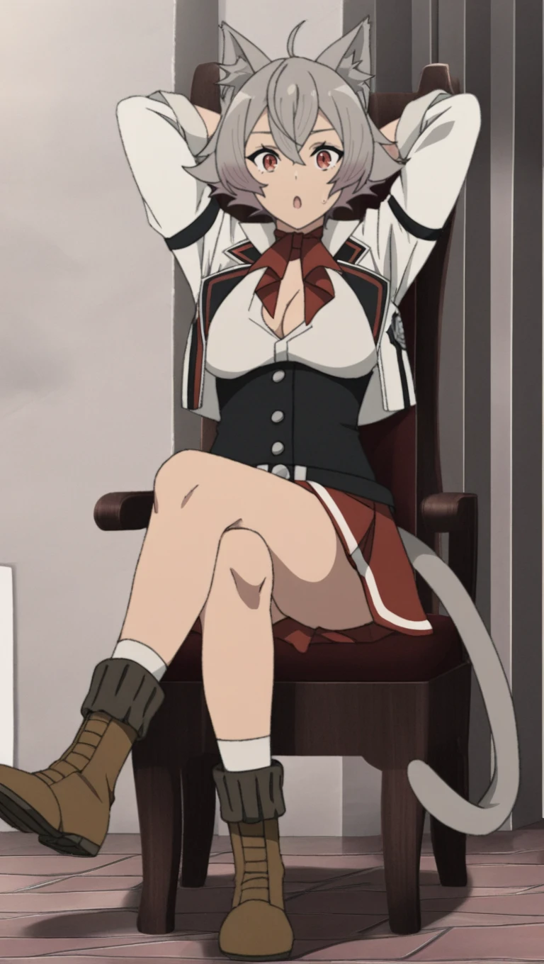 l1n14, red eyes, grey short hair, grey cat ears, grey cat tail,