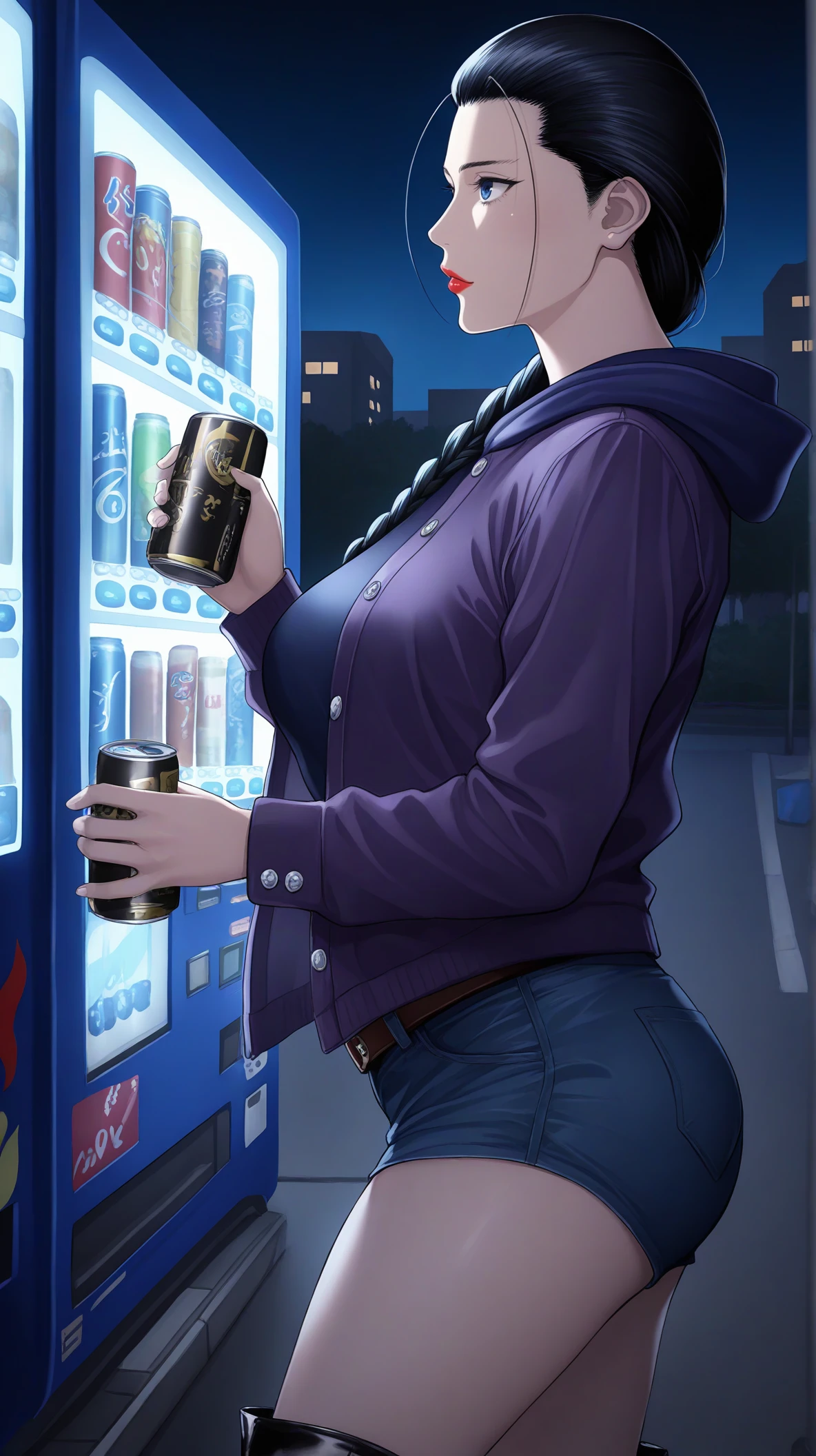sei_sakuraoka, blue eyes, black hair, long hair, hair slicked back, antenna hair, single braid, red lips, straps, dark blue hoodie, short shorts, boots, hood, casual, belt, cowboy shot, cowboy shot, college jacket, purple jacket,
