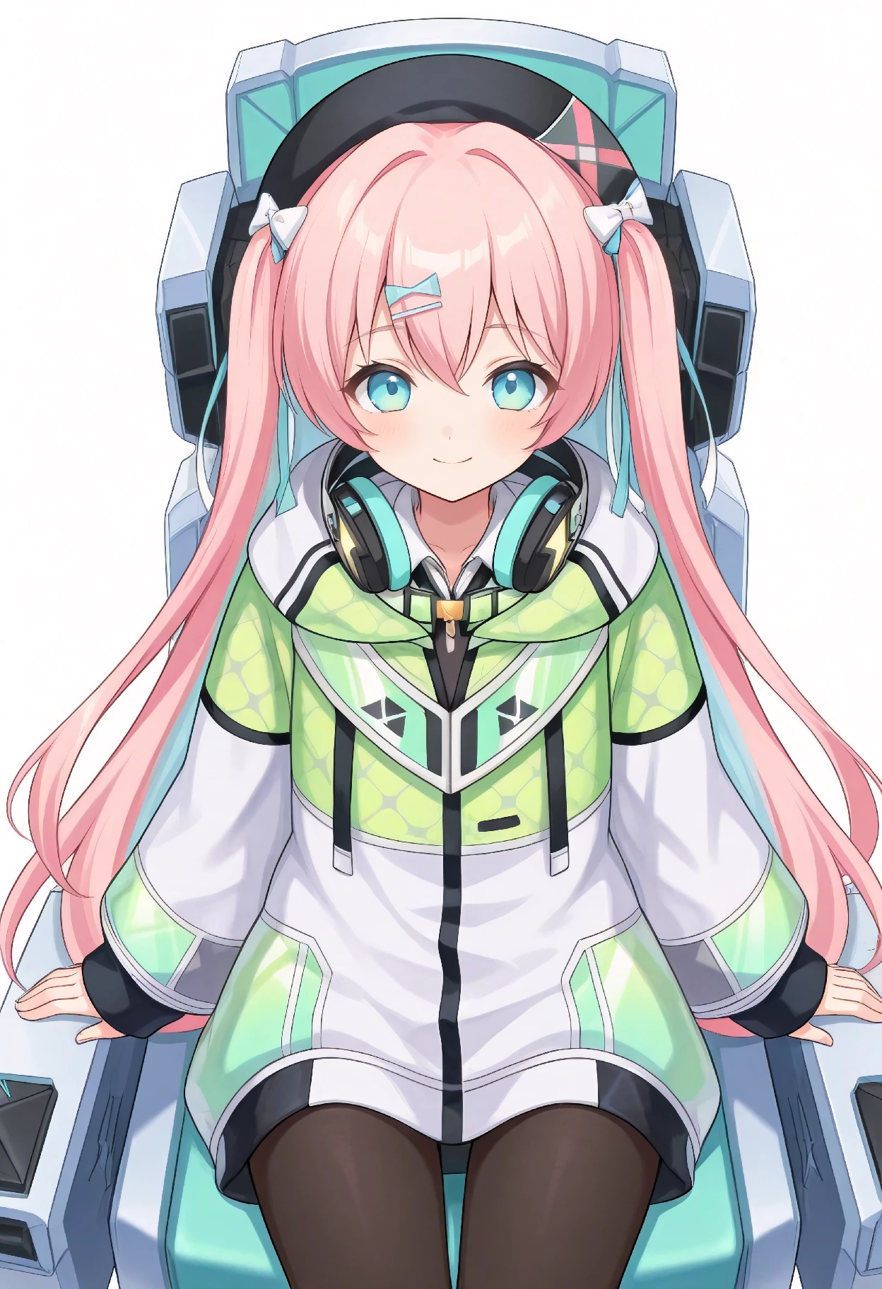 SiennaClark (Muv-Luv), multicolored hair, two-tone hair, colored inner hair, pink hair, blue hair, twintails, two side up, hair between eyes, blue eyes, black headwear, beret, x hair ornament, triangle hair ornament, hairclip, hair bow, white bow, headphones around neck, necktie, collared shirt, multicolored jacket, two-tone jacket, green jacket, white jacket, long sleeves, sleeves past wrists, shorts, black pantyhose,