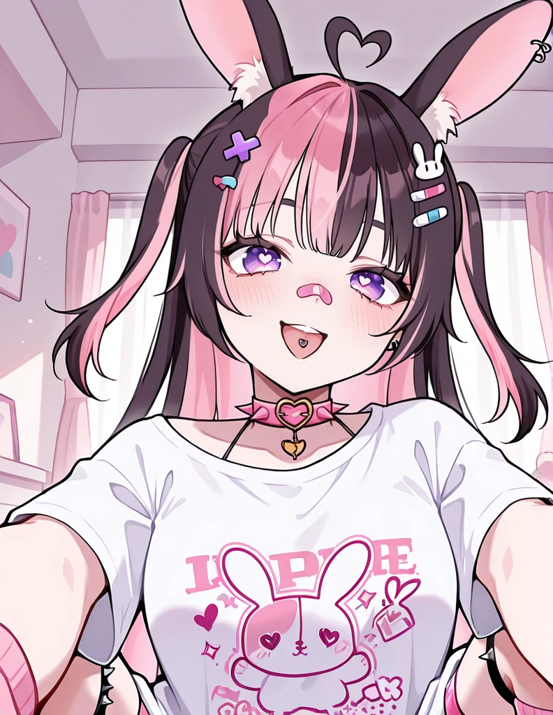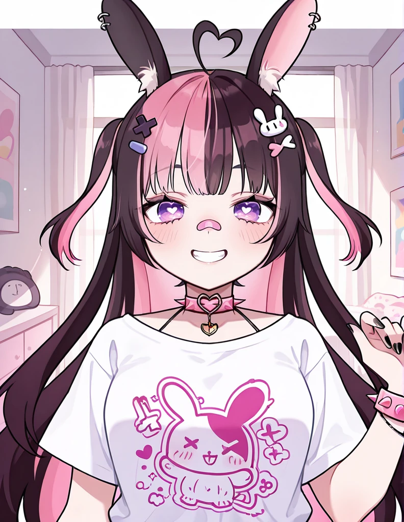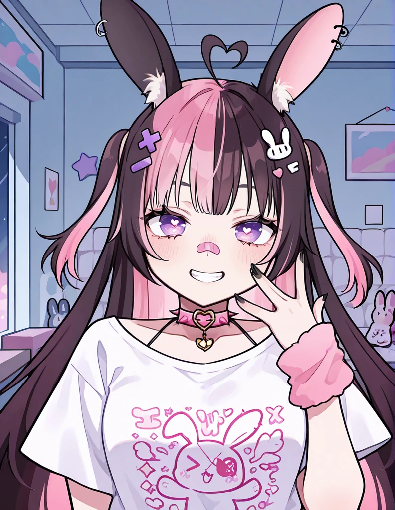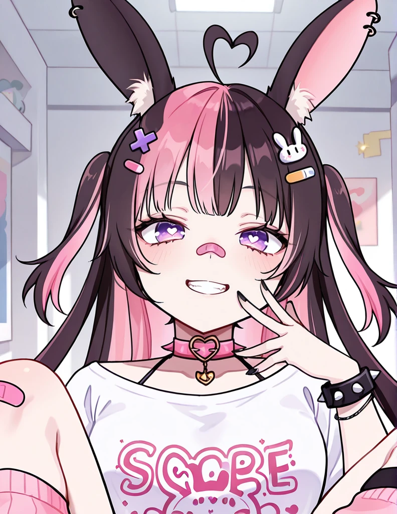 pink_ikari, 1girl, solo, long hair, breasts, black hair, hair ornament, animal ears, jewelry, medium breasts, purple eyes, pink hair, ahoge, multicolored hair, heart, choker, virtual youtuber, pink eyes, rabbit ears, two-tone hair, streaked hair, collar, bracelet, animal ear fluff, two side up, heart-shaped pupils, x hair ornament, black nails, ear piercing, bandaid, colored inner hair, star hair ornament, rabbit girl, bandaid on face, rabbit hair ornament, bandaid on leg, pink choker, heart ahoge, bandaid on nose, bandaid on knee, heart choker, pink collar, brown hair