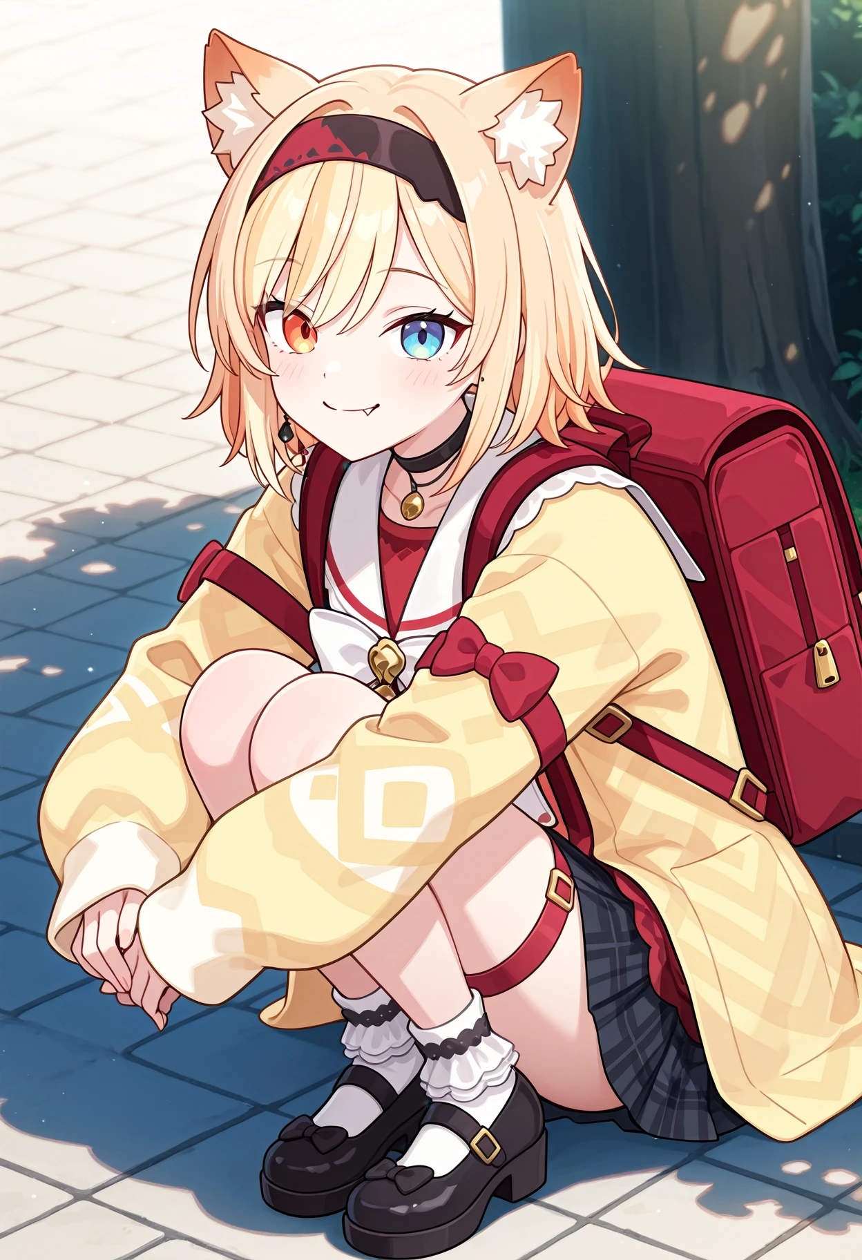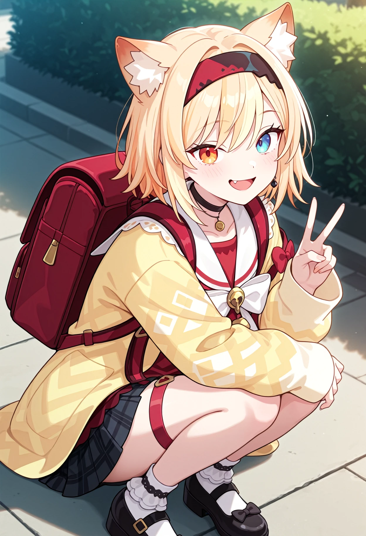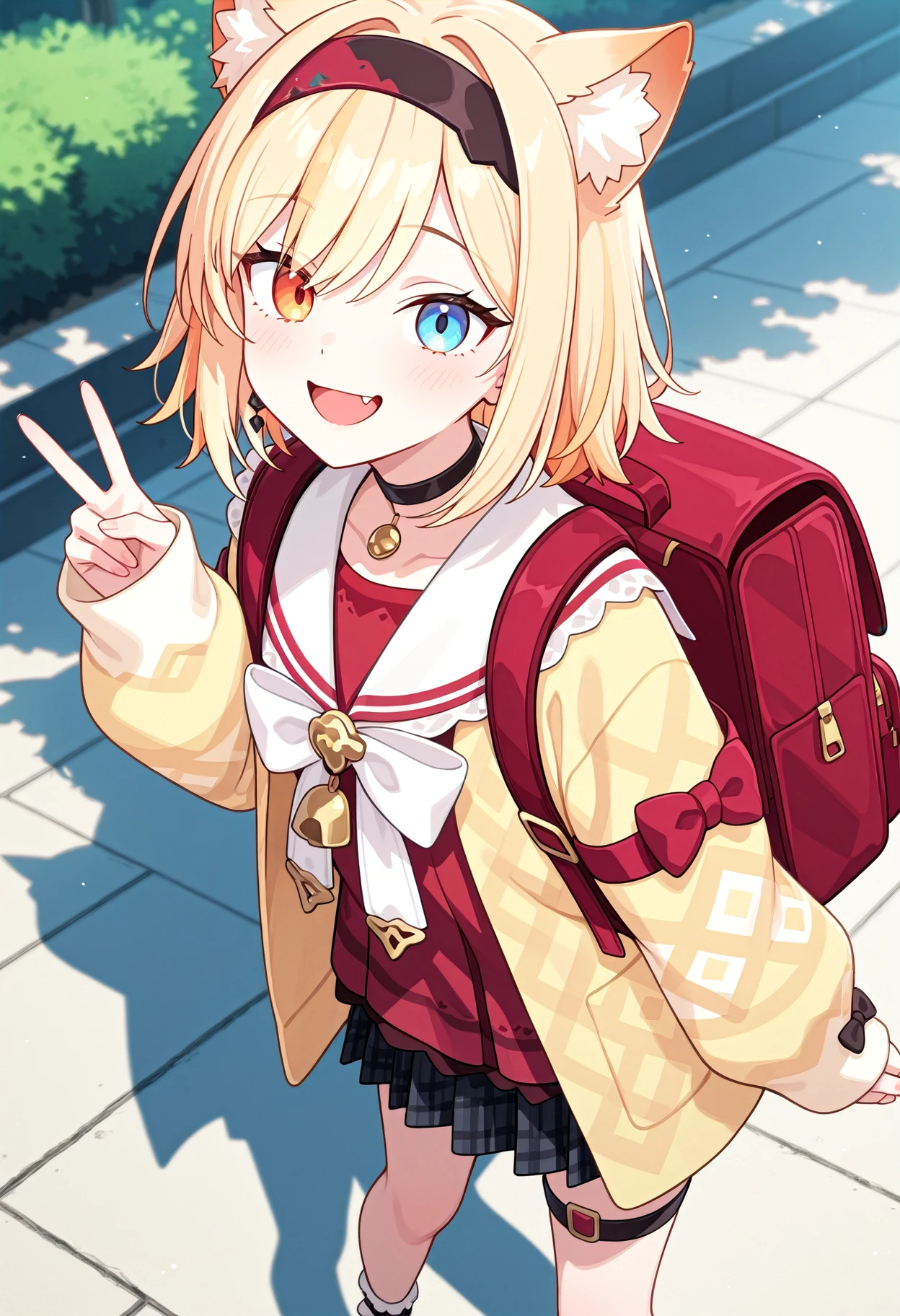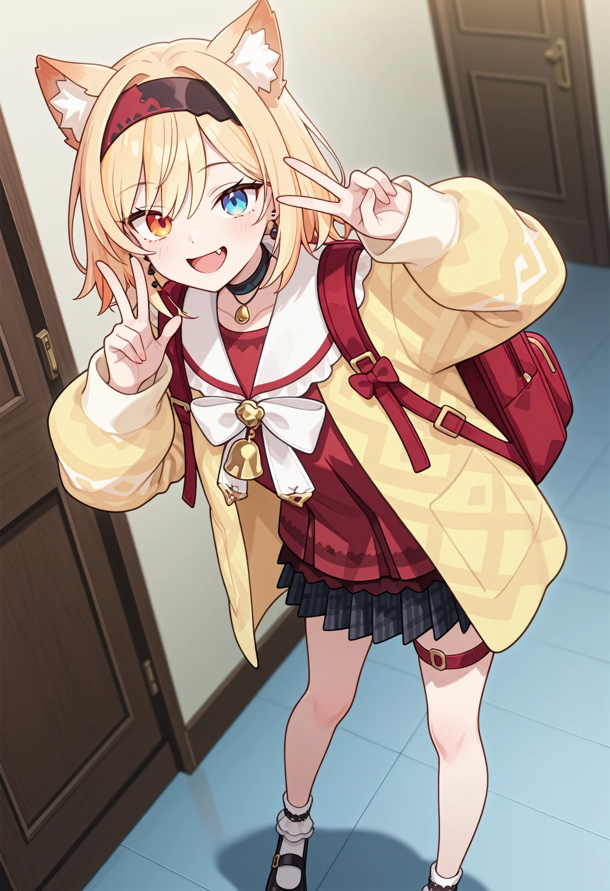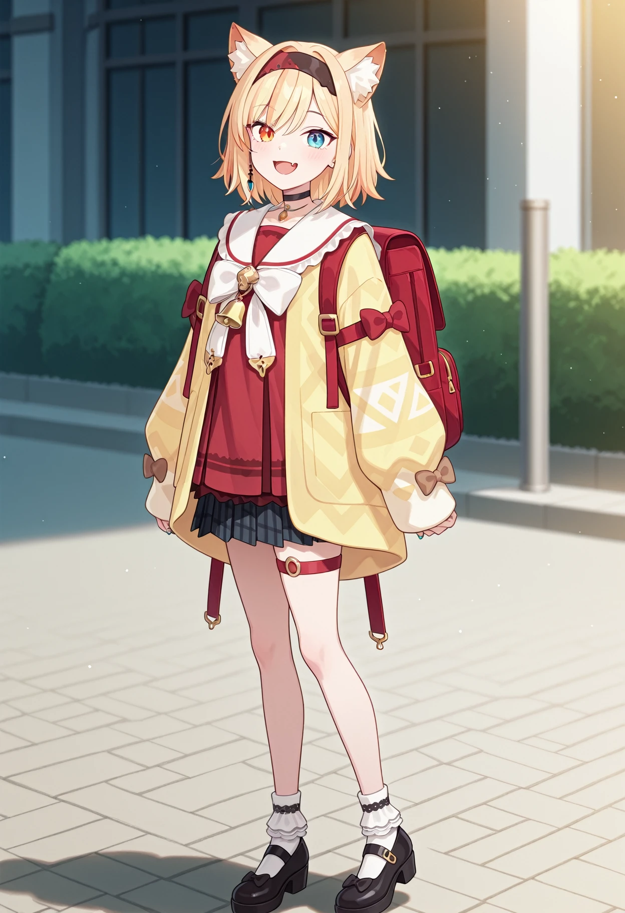 1girl, solo, heterochromia, blue eyes, orange eyes,bow, animal ears, skirt, blonde hair, hairband, animal ear fluff, choker, red shirt, yellow cardigan, frilly socks, black mary jane, thigh strap,red backpack