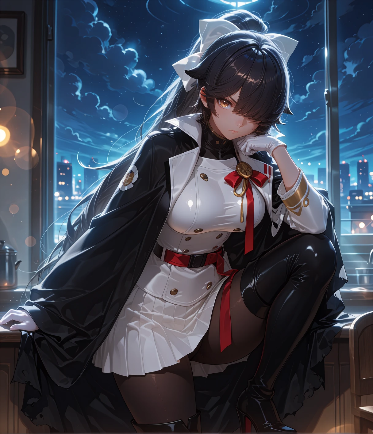 takmeta, brown eyes, black hair, long hair, high ponytail, hair over one eye, hair bow, droopy ears, animal ears, extra ears, large breasts, red sash, white military uniform, double-breasted, white gloves, torn cape, black cape, white skirt, black thighhighs, black thigh boots, high heels, black belt,
