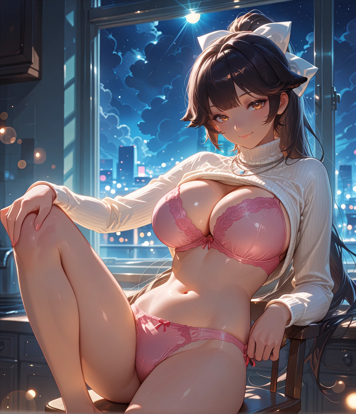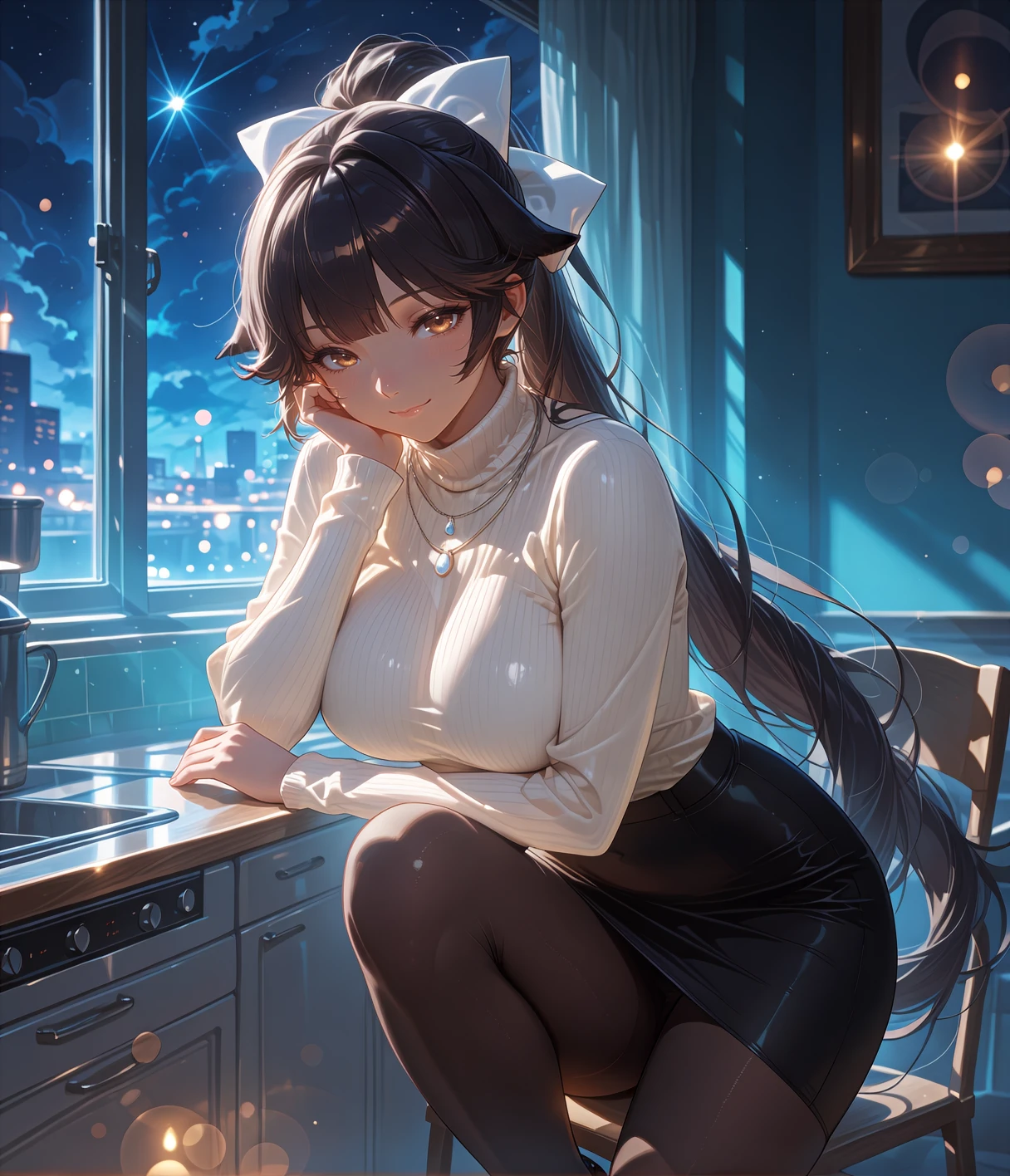 taksc4sual, brown eyes, black hair, long hair, high ponytail, hair bow, droopy ears, animal ears, extra ears, silver necklace, large breasts, white ribbed sweater, turtleneck sweater, long sleeves, black pantyhose, black pencil skirt, black high heels,