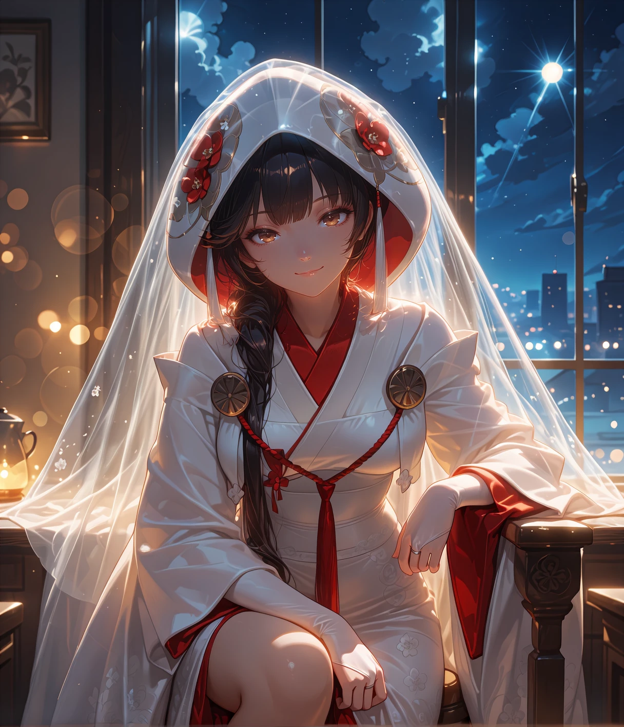 takwedd1ng, brown eyes, black hair, long hair, hair over shoulder, wataboushi, see-through veil, bridal veil, medium breasts, uchikake, two-tone kimono, white kimono, red kimono, wide sleeves, red tassel, jingle bell, bridal gauntlets, floral print,