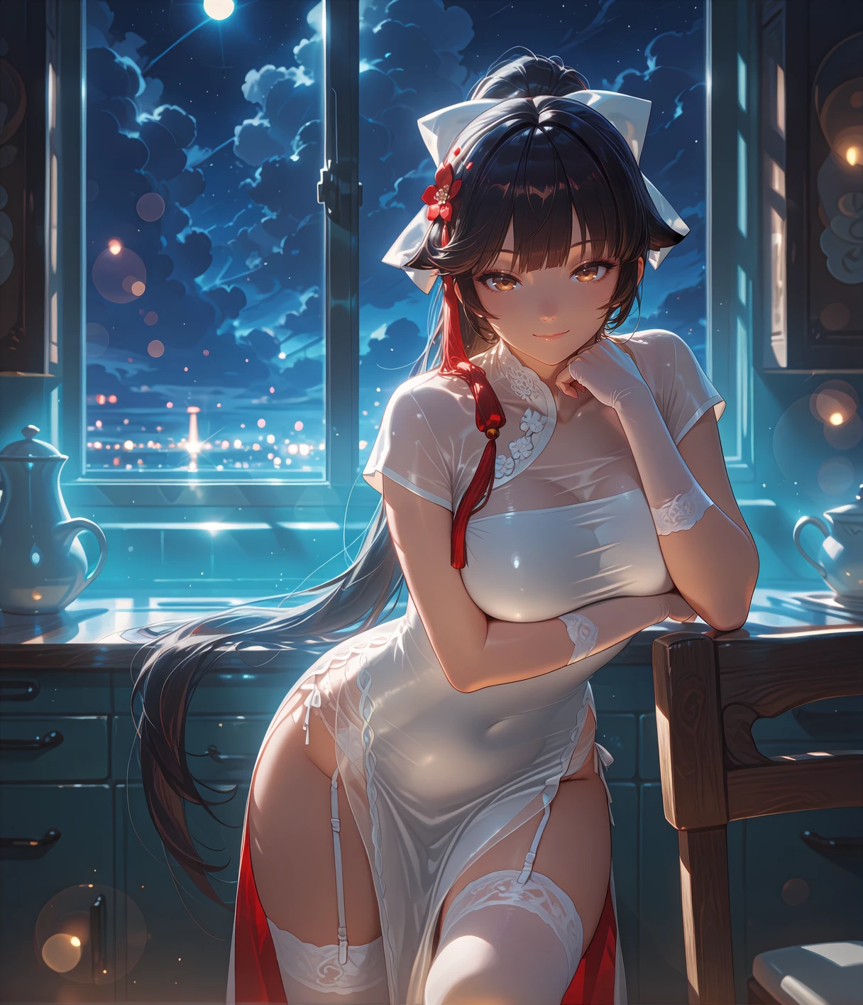 takchina, brown eyes, black hair, long hair, high ponytail, hair bow, droopy ears, animal ears, extra ears, red tassel, red hair flower, large breasts, see-through, white elbow gloves, fingerless gloves, white china dress, pelvic curtain, two-sided fabric, lace-trim, white thighhighs, white panties, garter straps, white flats,
