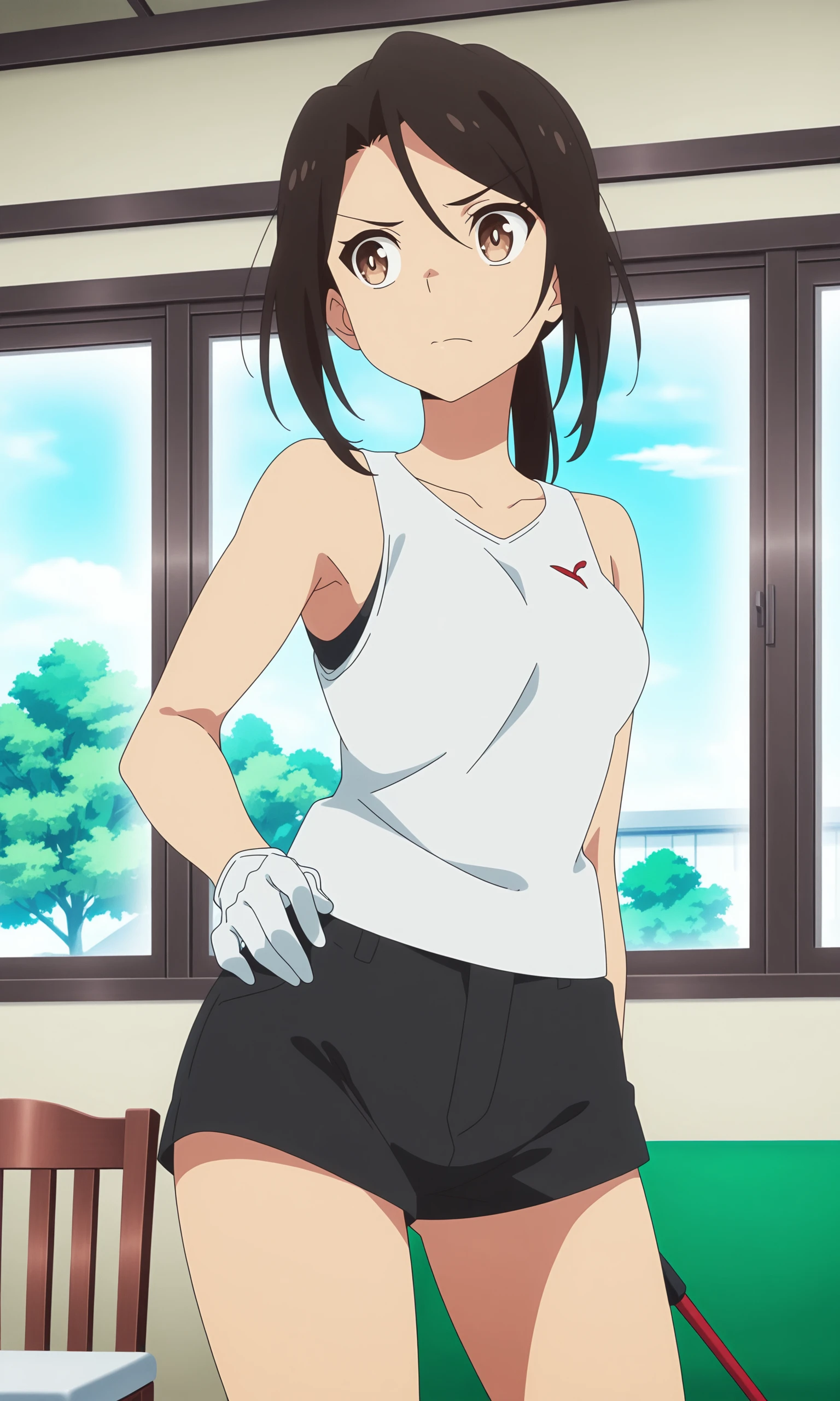 shoes, belt, black shirt, short sleeves, sneakers, white gloves, single glove, baseball cap, white pants,