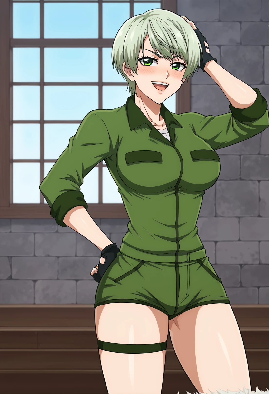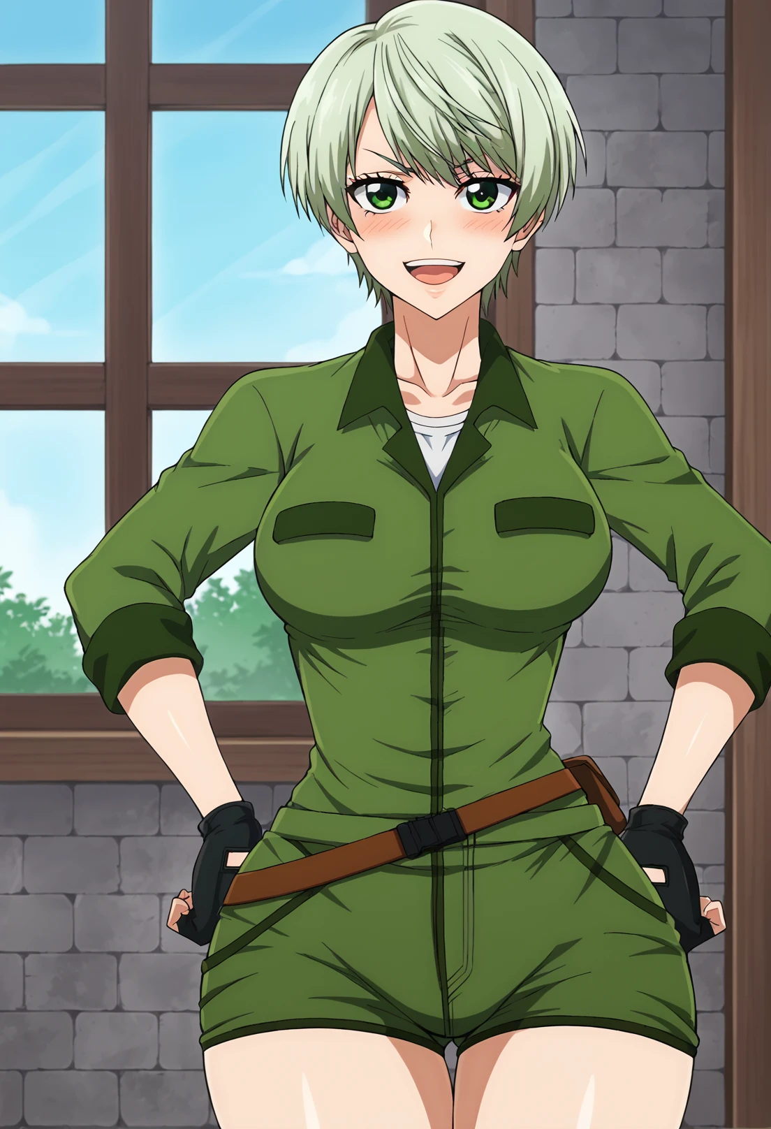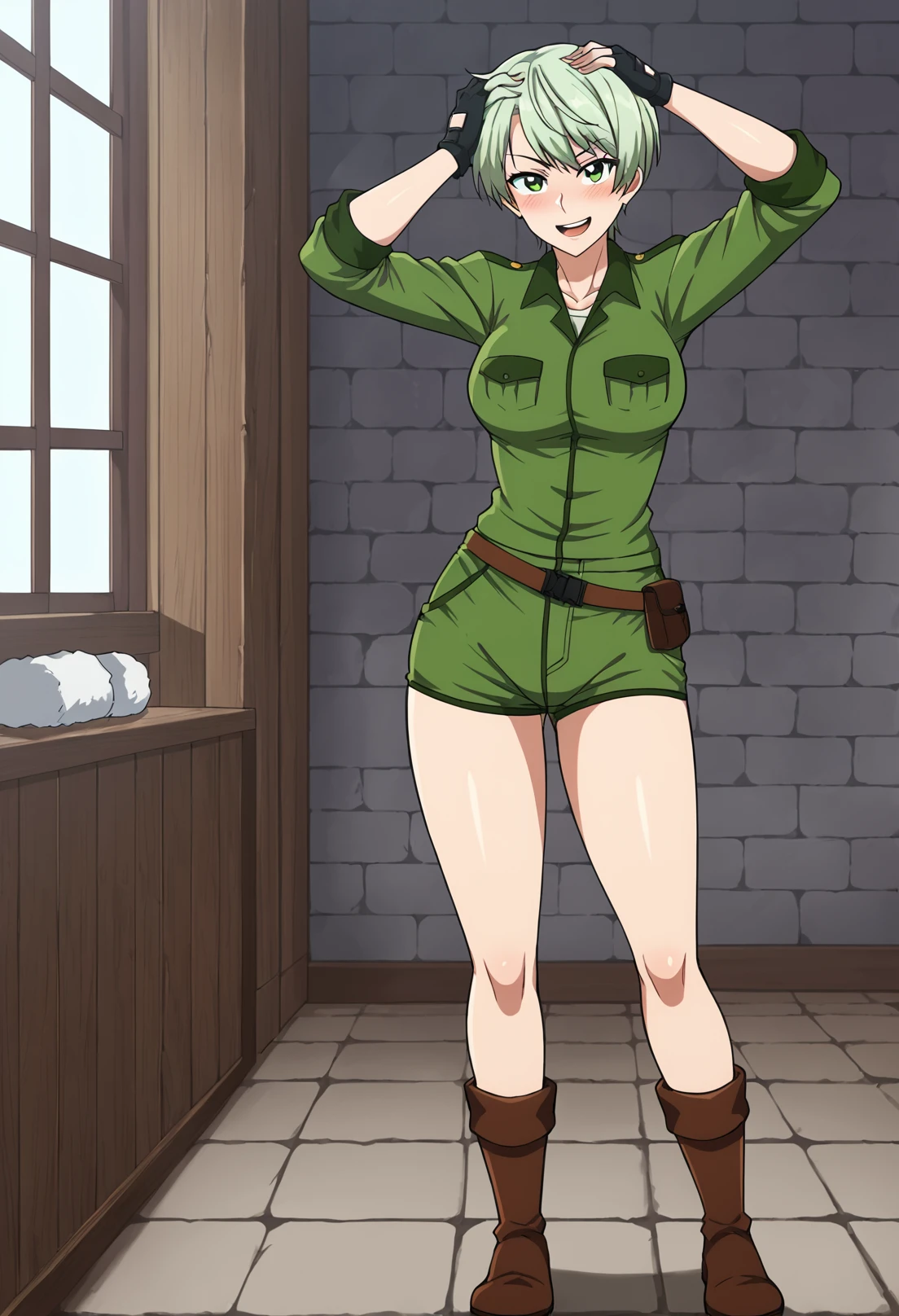 Trigger words: 1girl, solo, light green hair, green eyes, military, green uniform, green shorts, thigh strap, brown pouch, brown footwear, brown boots