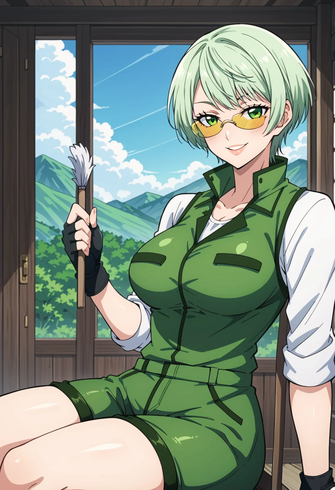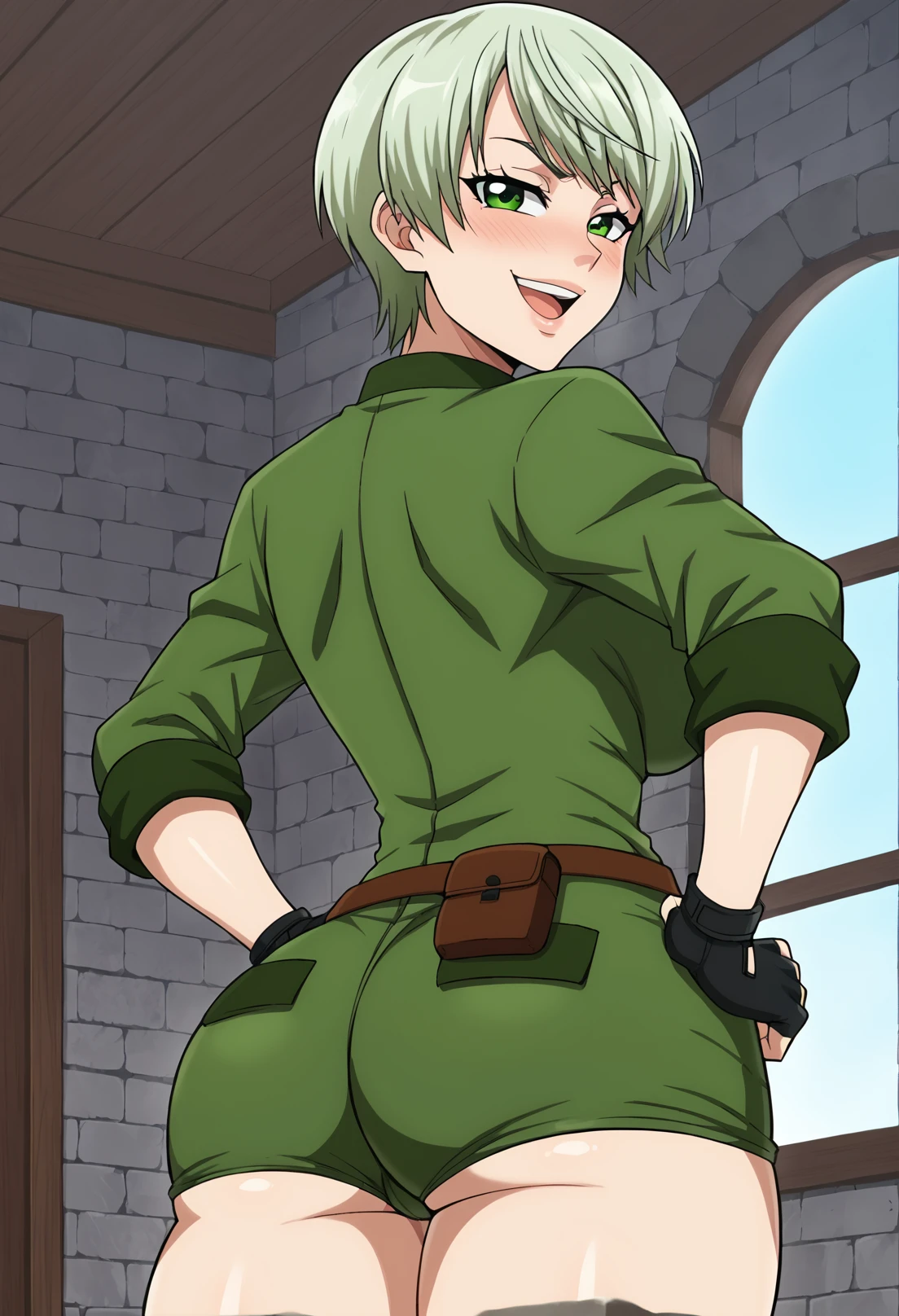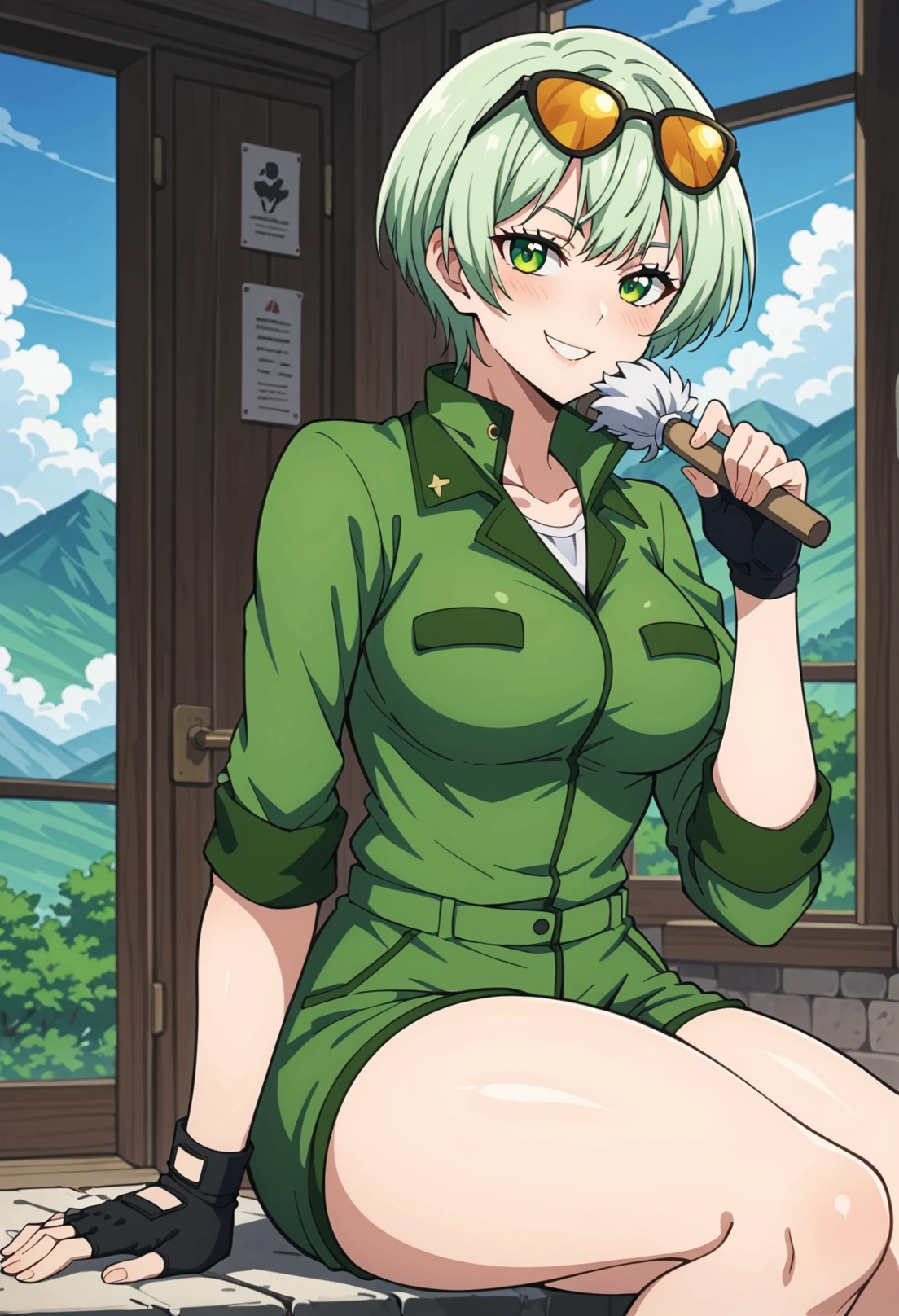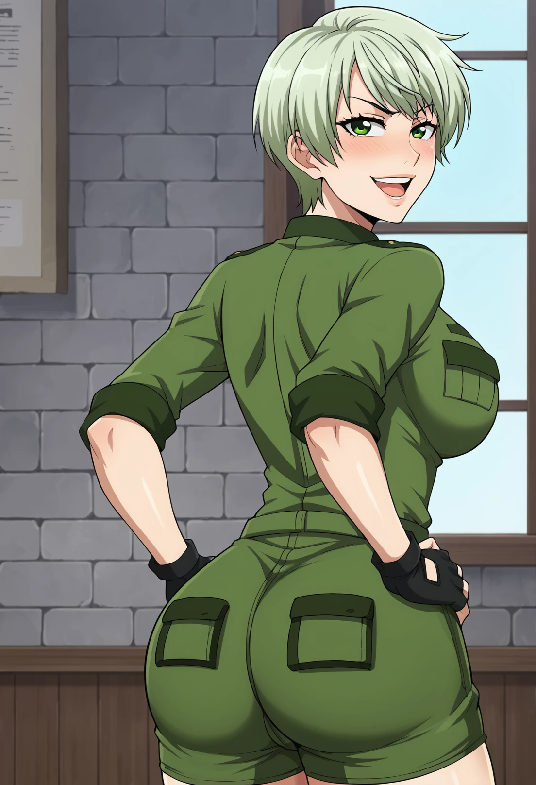 Trigger words: 1girl, solo, light green hair, green eyes, military, green uniform, green shorts, thigh strap, brown pouch, brown footwear, brown boots