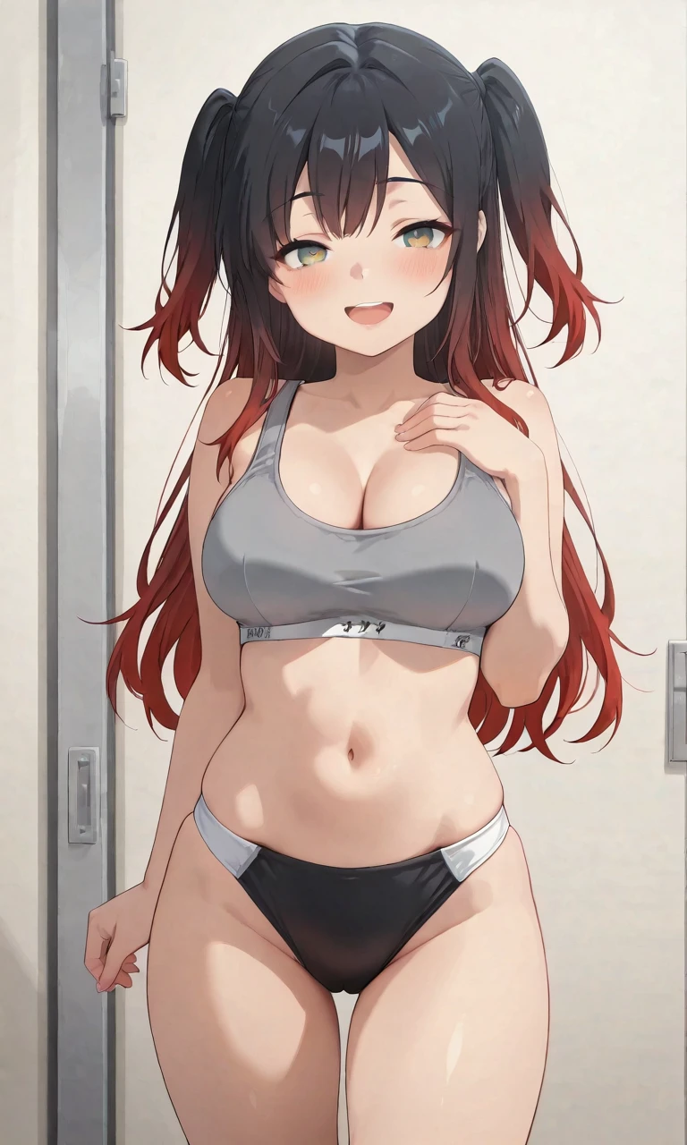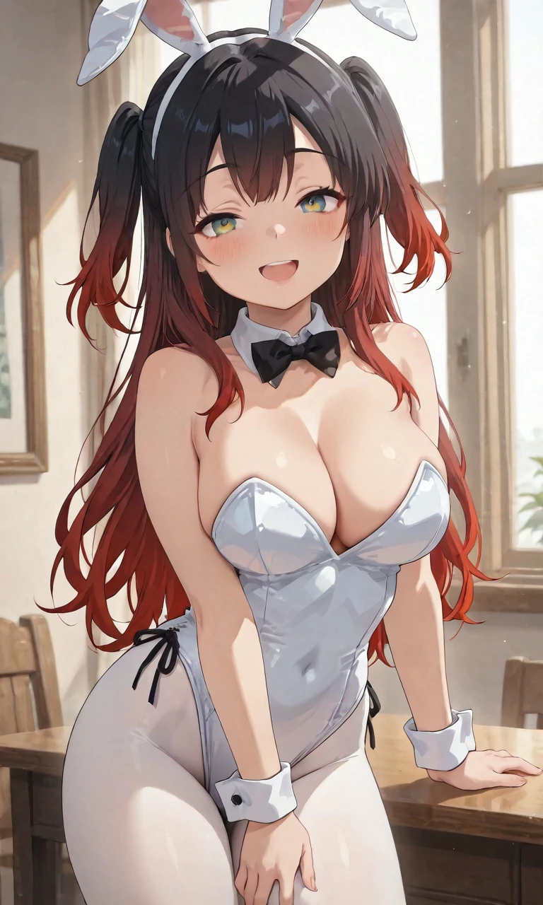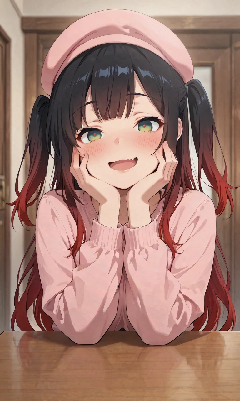 high gradient eyes, long hair, green eyes, (red and black hair), very long red hair, streaked hair, multicolored hair, gradient hair, two side up, sidelocks