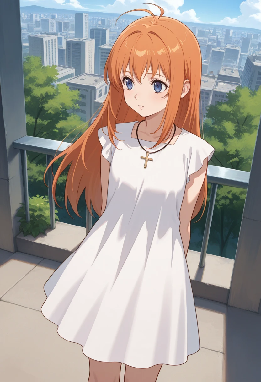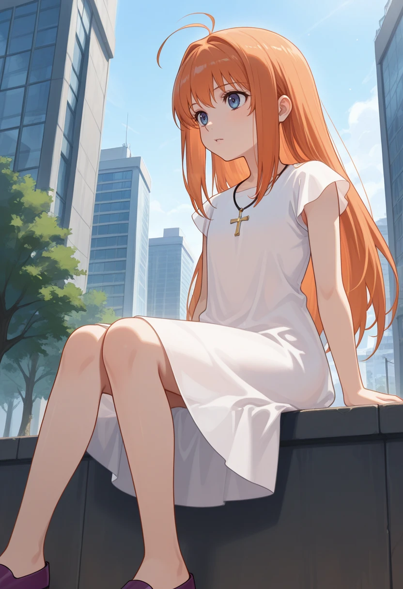 xnephilim, sidelocks, orange hair, long hair, ahoge, white dress, blue eyes, cross necklace, sleeveless, flat shoes, purple footwear,