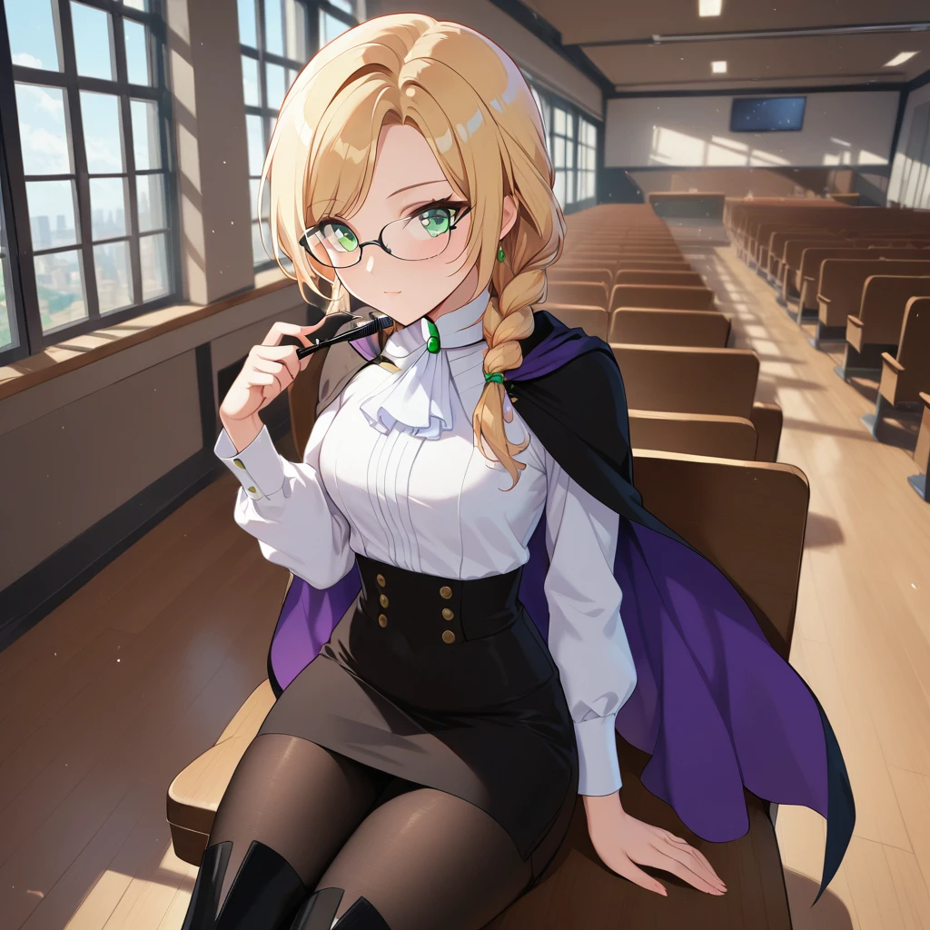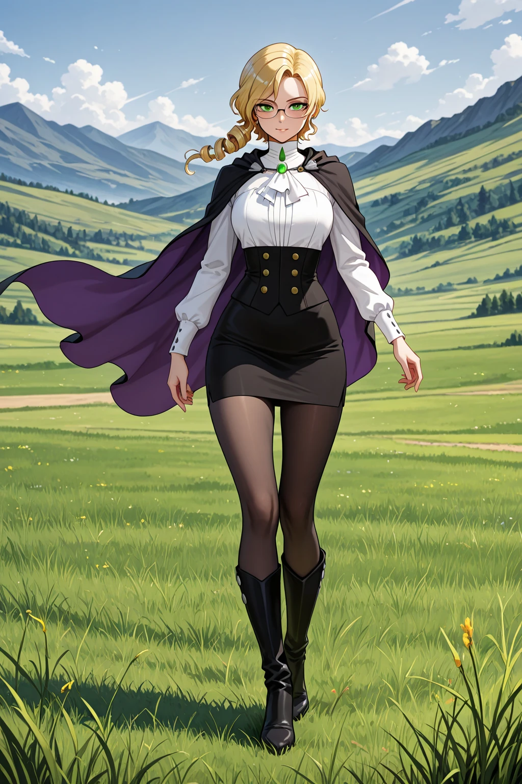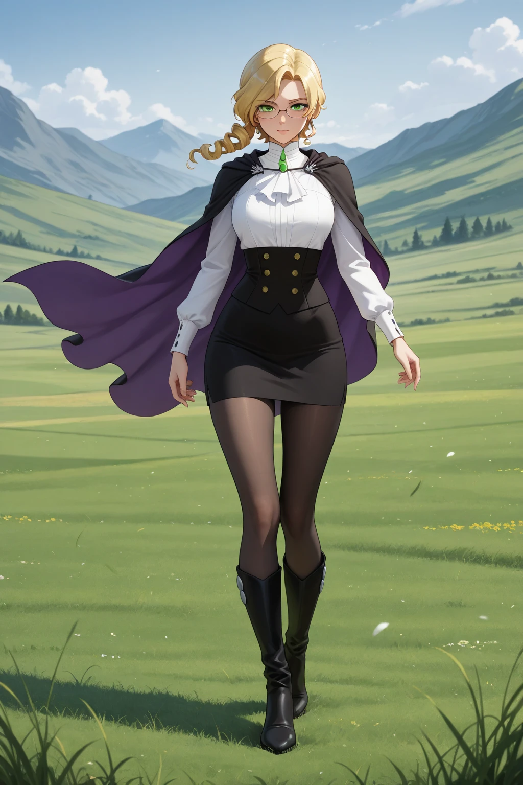 Glynda Goodwitch, Blonde hair, green eyes, white shirt, pencil skirt, glasses, black knee-high heels, pantyhose, black cape, purple inner cape