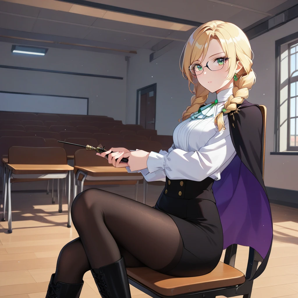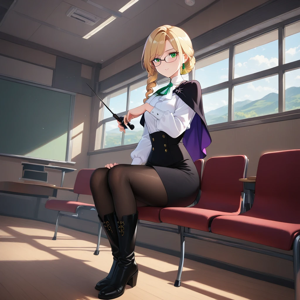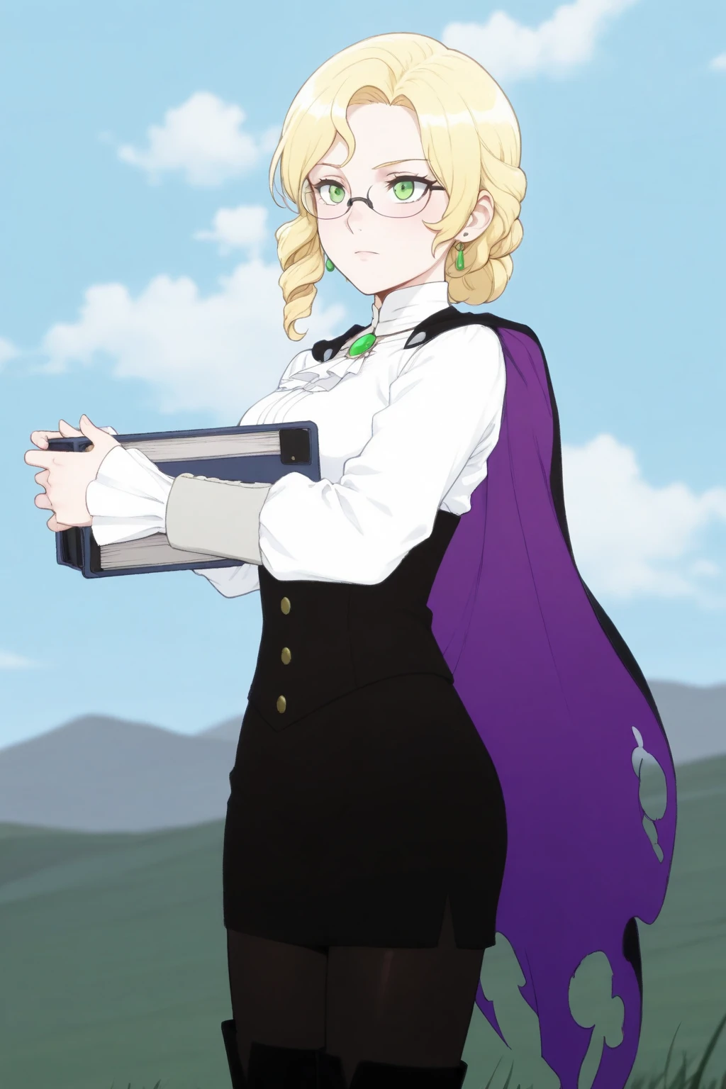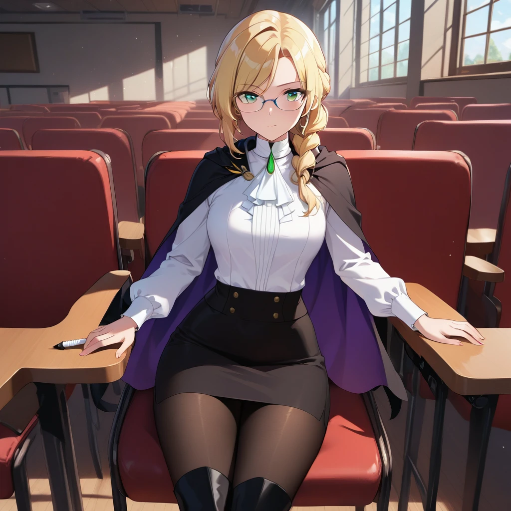 Glynda Goodwitch, Blonde hair, green eyes, white shirt, pencil skirt, glasses, black knee-high heels, pantyhose, black cape, purple inner cape