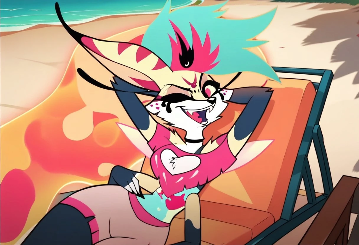 QueenB, Anthro Fennec Fox, Furry Female, Mohawk Hair, Ethereal Hair, Multicolored Hair, Pink Eyes, Yellow Sclera, Long Eyelashes, Running Mascara, Yellow Fur, White Fur, Striped Ears, Multicolored Midriff, Pixie Wings, Four Arms