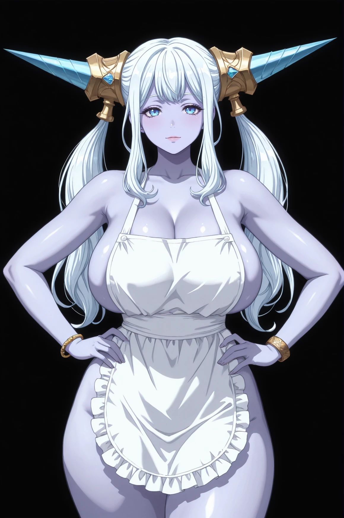 griselda_hw_thd,white hair,long hair,twintails,headgear,sidelocks,horns,mature female,blue horns,blue eyes,colored skin,purple skin,huge breasts,thick thighs