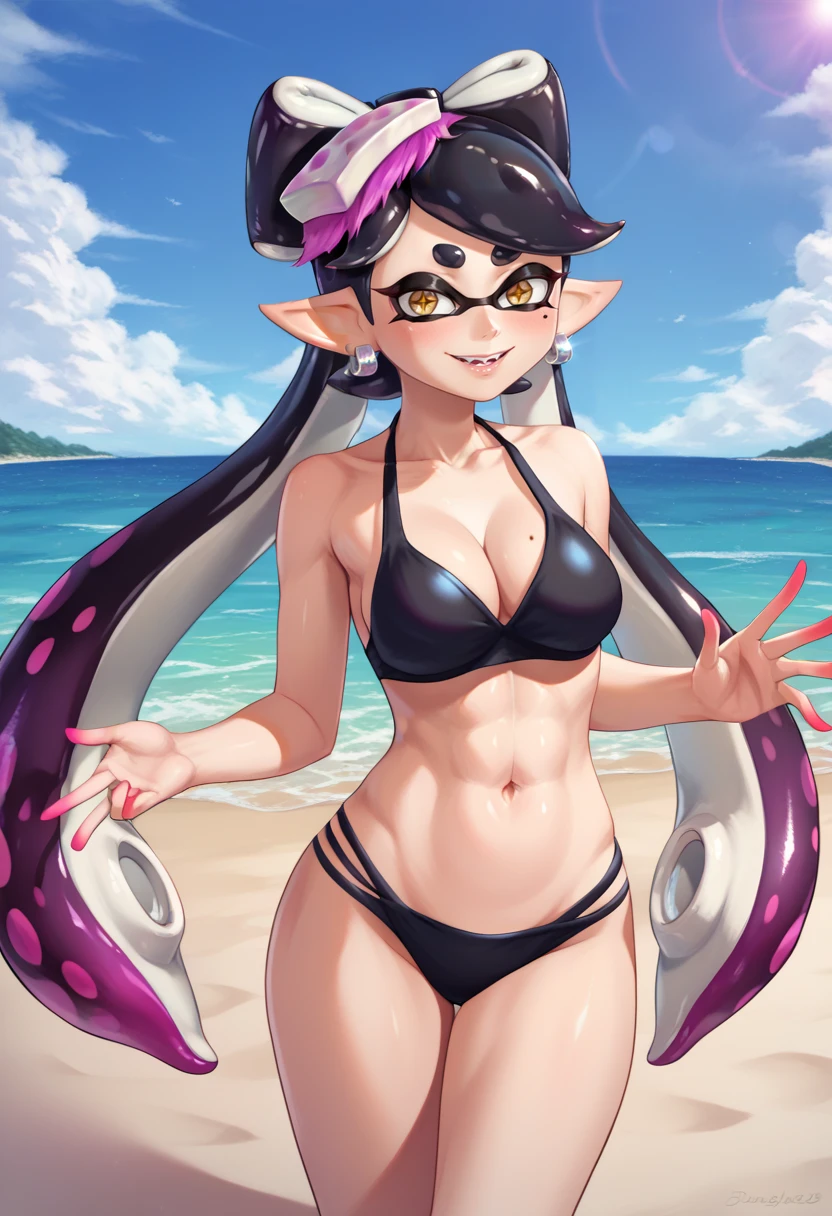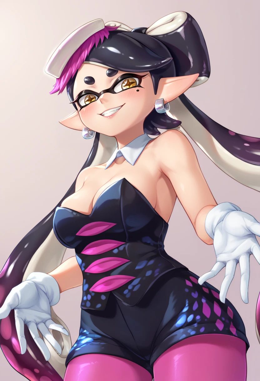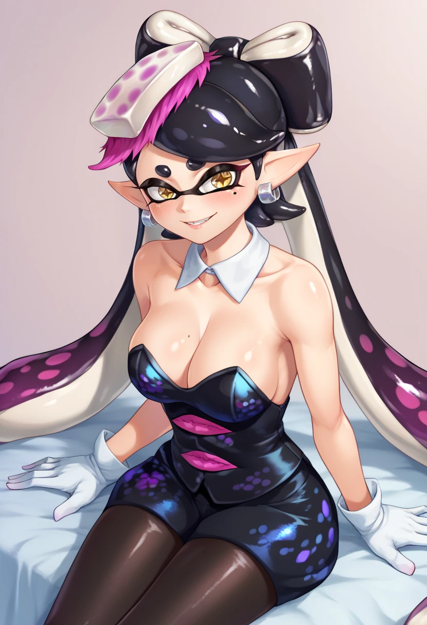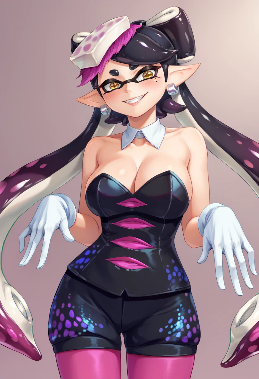 callieSDXL,1girl,solo,long hair,looking at viewer,smile,black hair,gloves,cleavage,bare shoulders,jewelry,yellow eyes,purple hair,pantyhose,earrings,pointy ears,white gloves,mole,mole under eye,detached collar,+_+,tentacle hair,callie (splatoon),