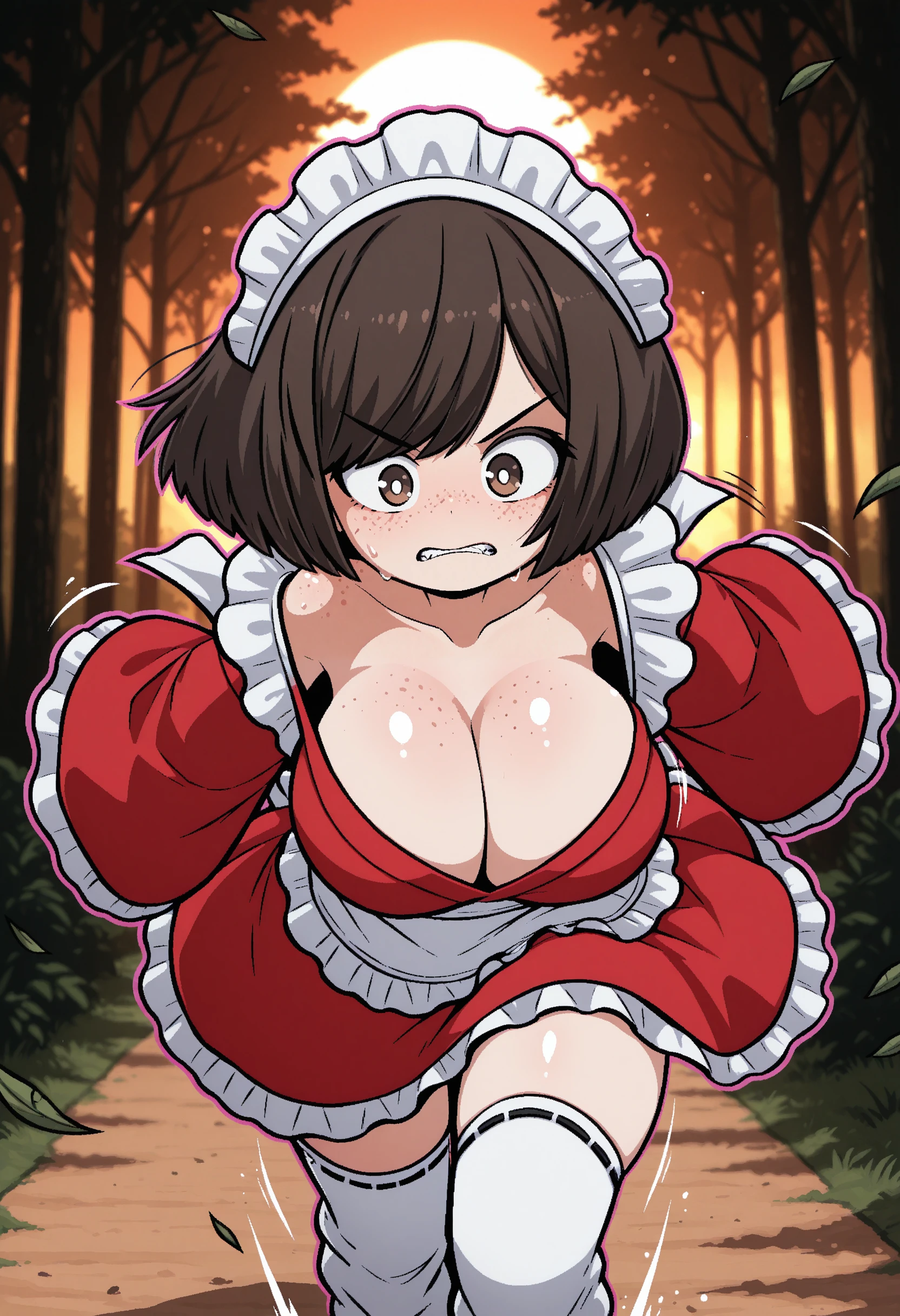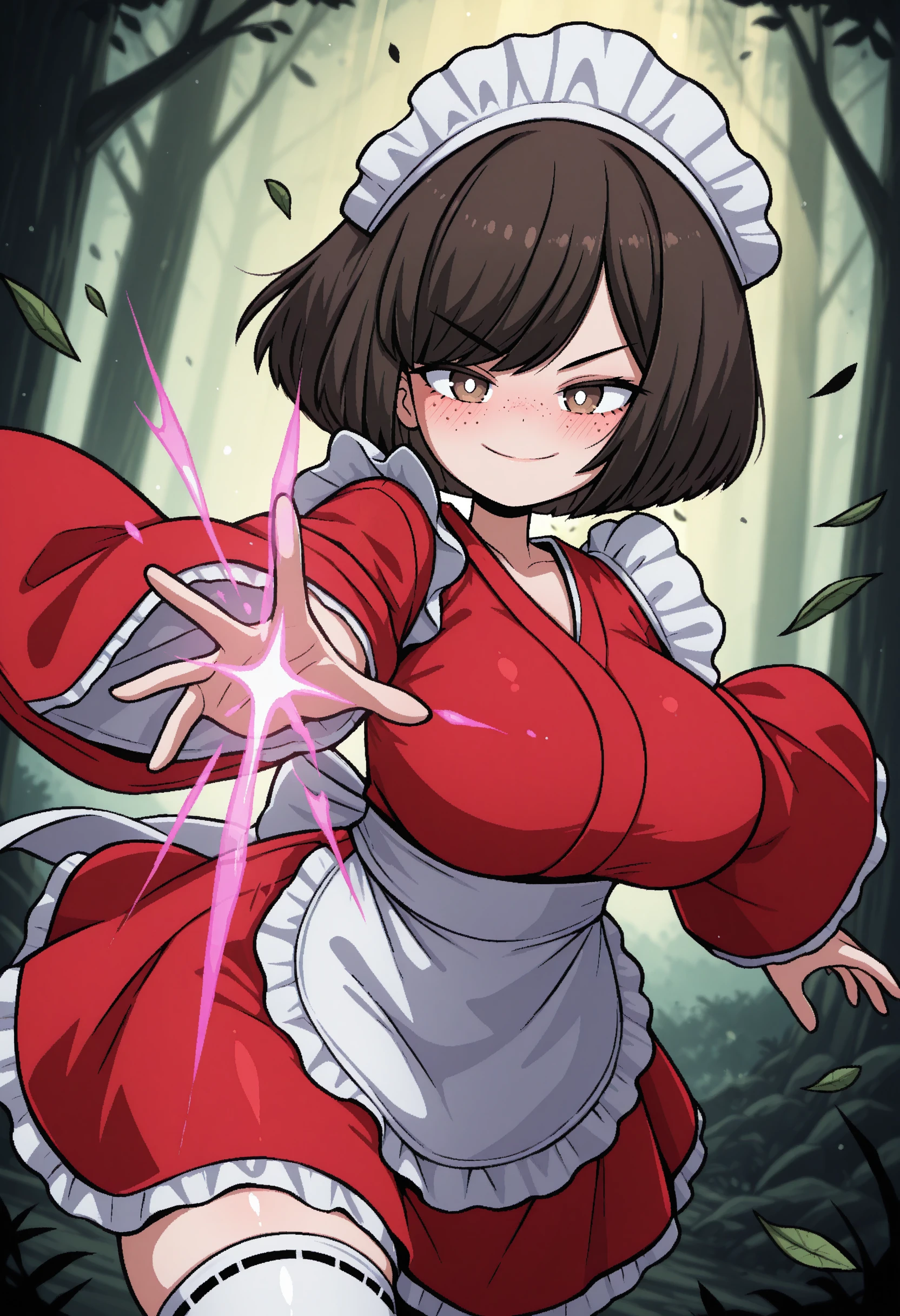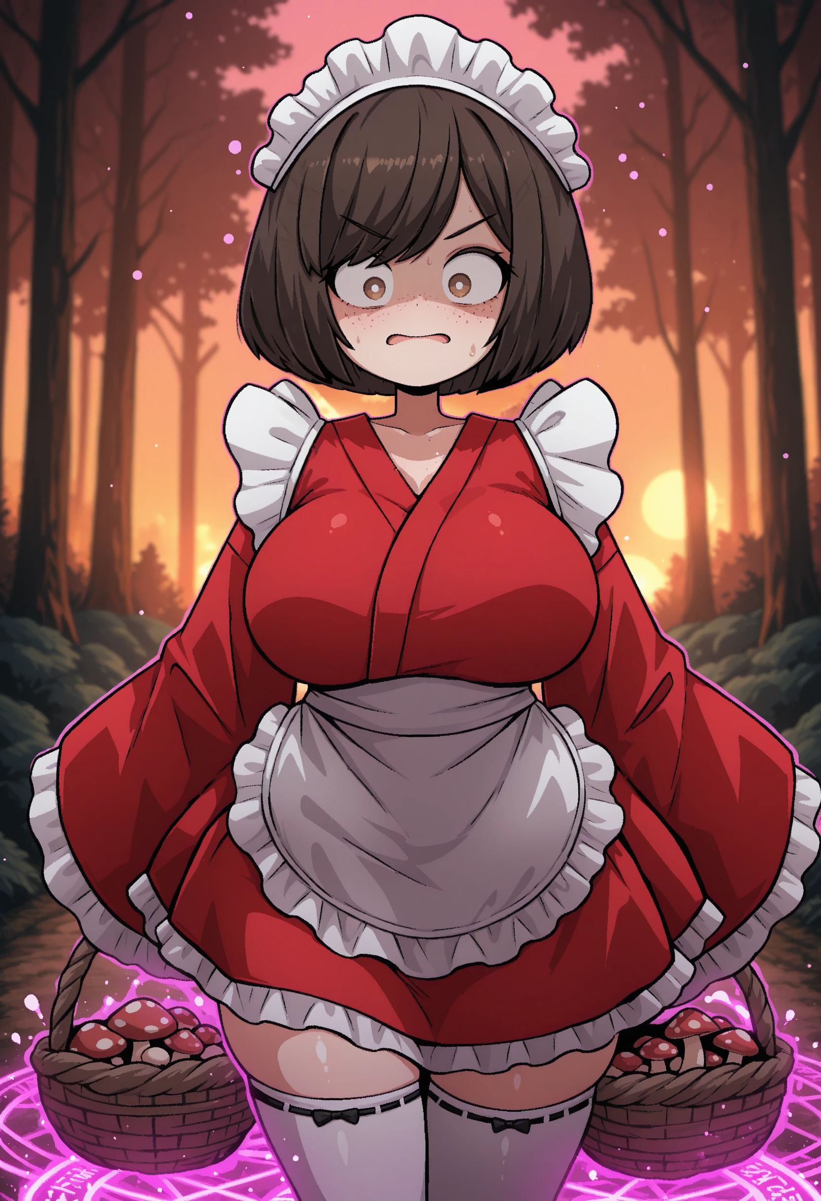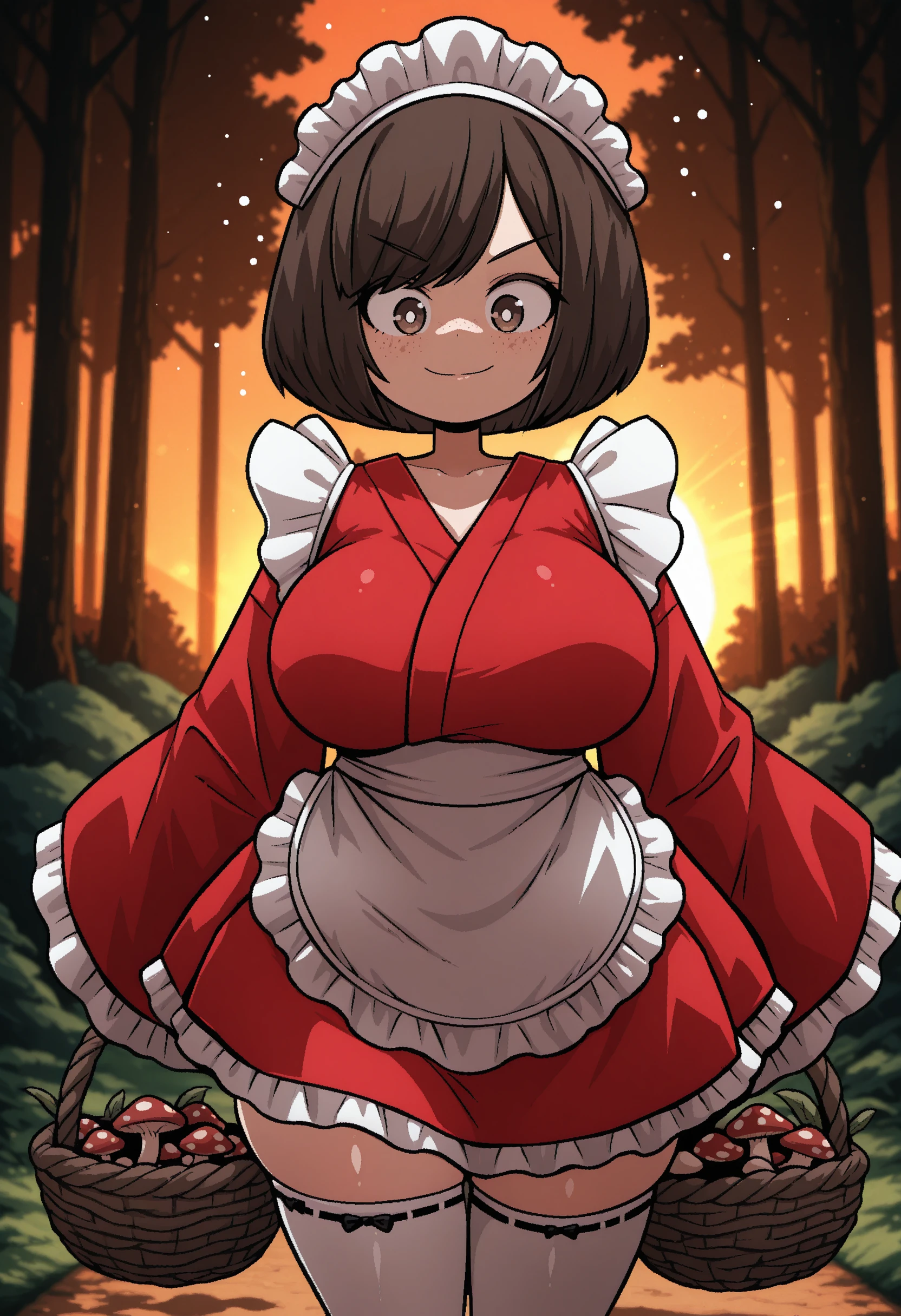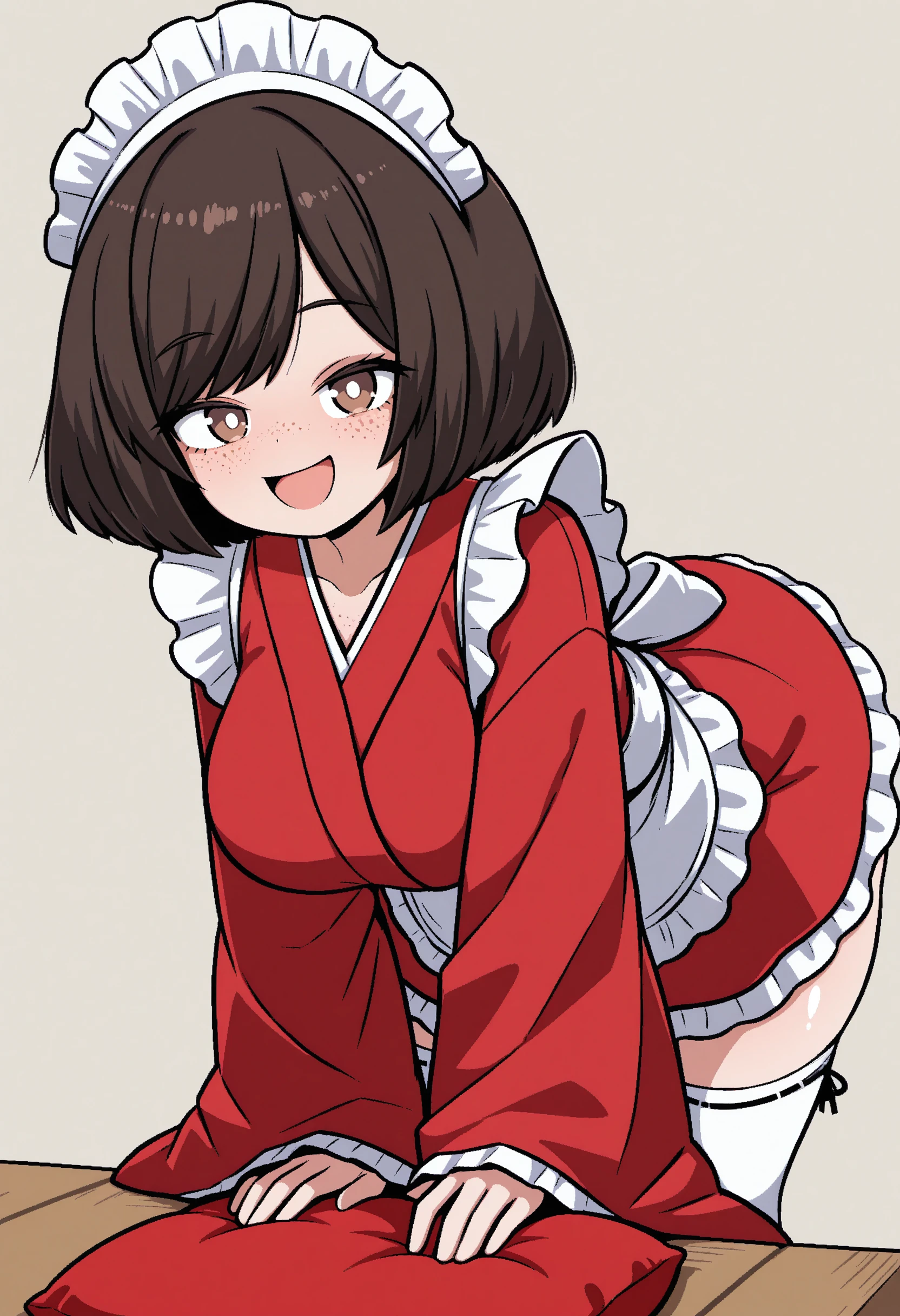 t1lde, 1girl, freckles, red kimono, red wa maid, brown eyes, bob cut, swept bangs, brown hair, maid headdress, white thighhighs, waist apron, wide sleeves, large breasts