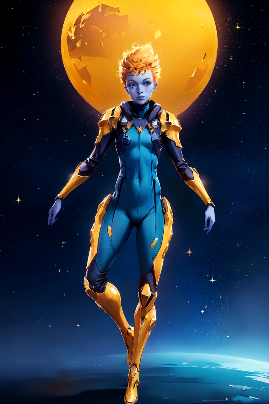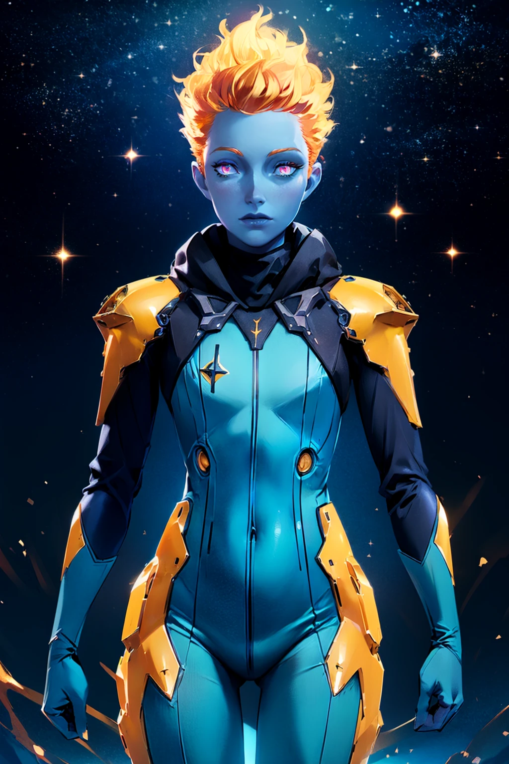 Prompt alternate form: nikkigotg, blue skin, 1girl, orange hair, flame hair, alternate outfit, bodysuit, pilot suit, shoulder armor