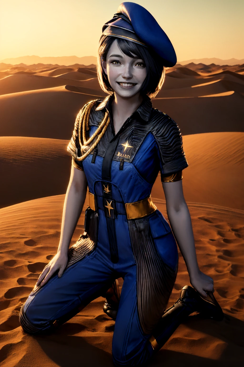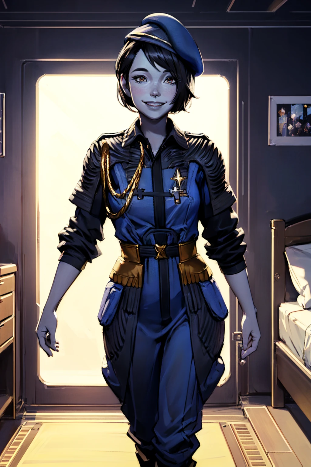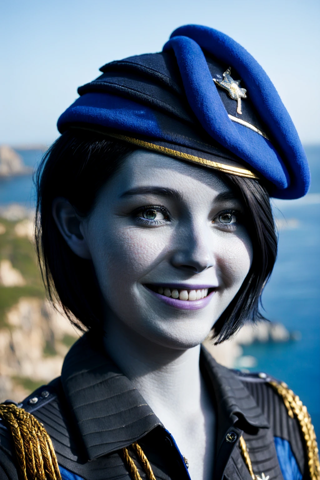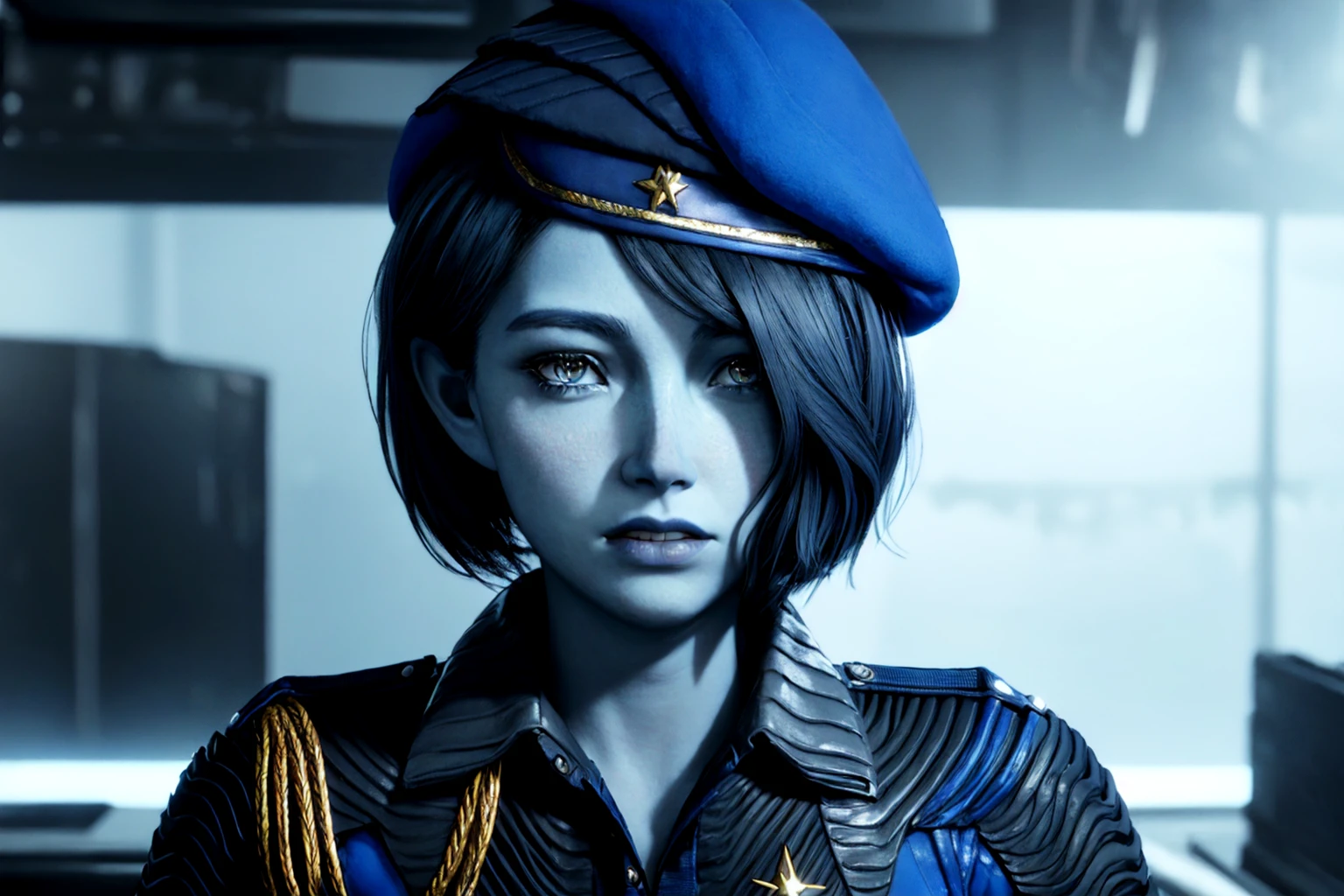 Prompt cadet uniform: nikkigotg, blue skin, black hair, 1girl, beret, short hair, hat, blue headwear, uniform, police uniform