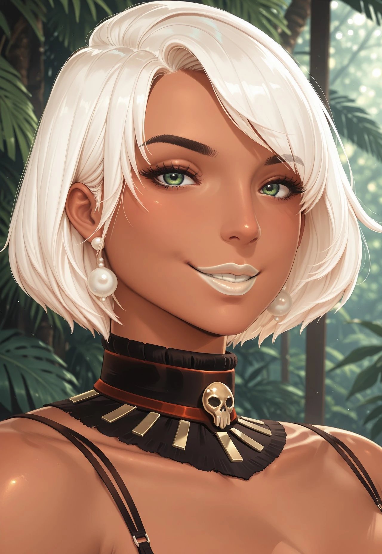 KhulanTower, 1girl, muscular, short hair, white hair, asymmetrical bangs, brown eyes, white lipstick,