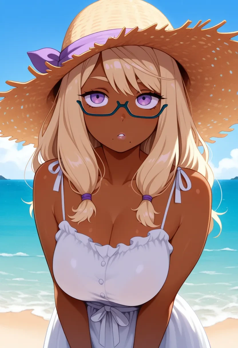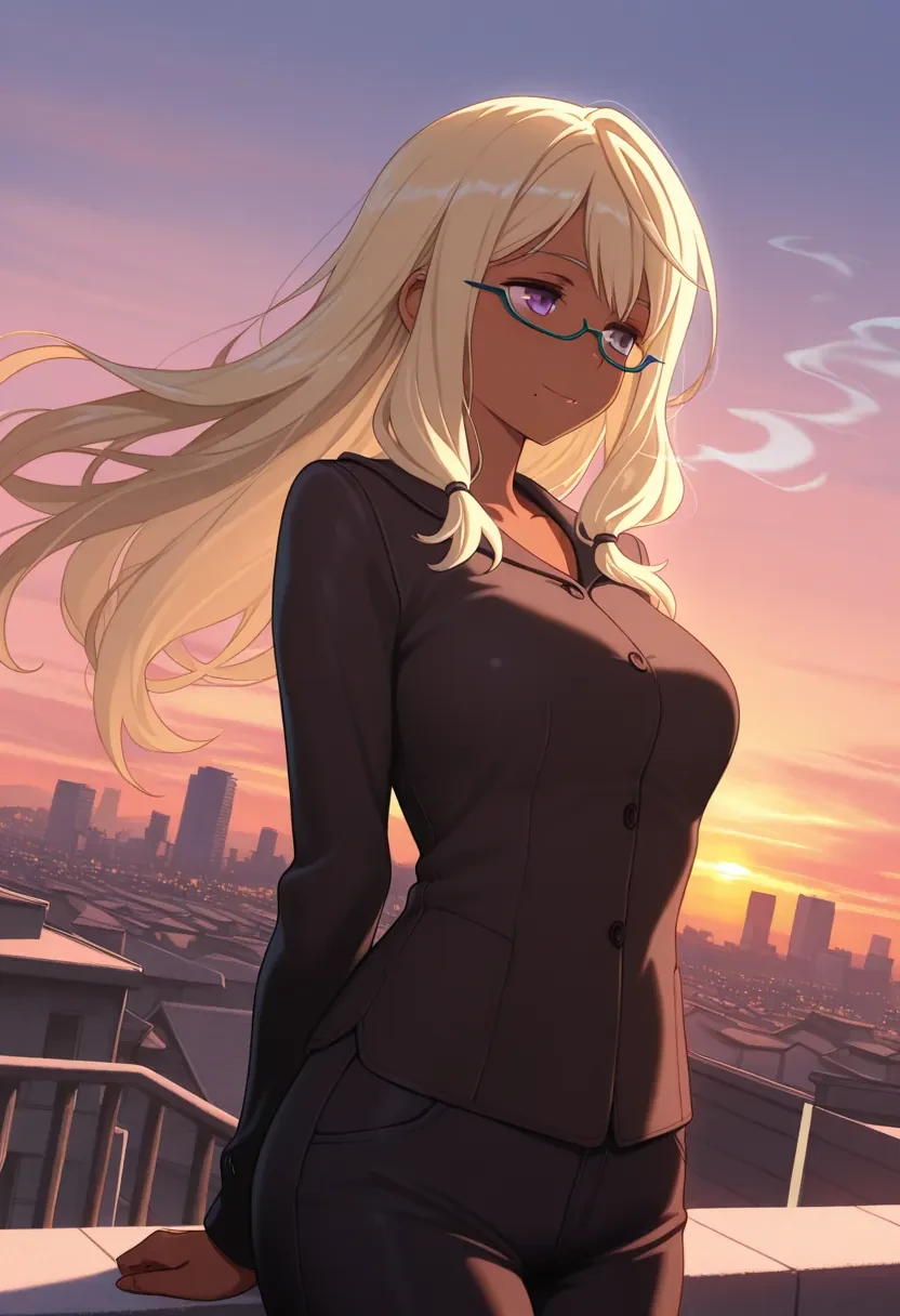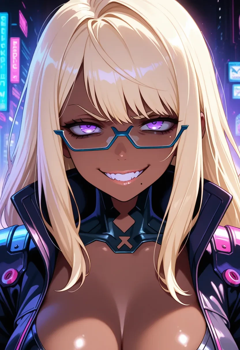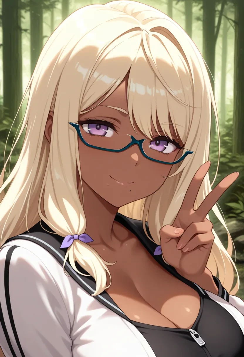 D5, long hair, purple eyes, glasses, dark skin, dark-skinned female, blonde hair, under-rim eyewear, mole, mole under mouth,