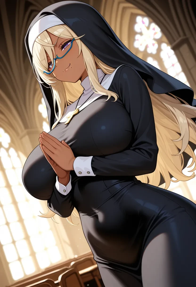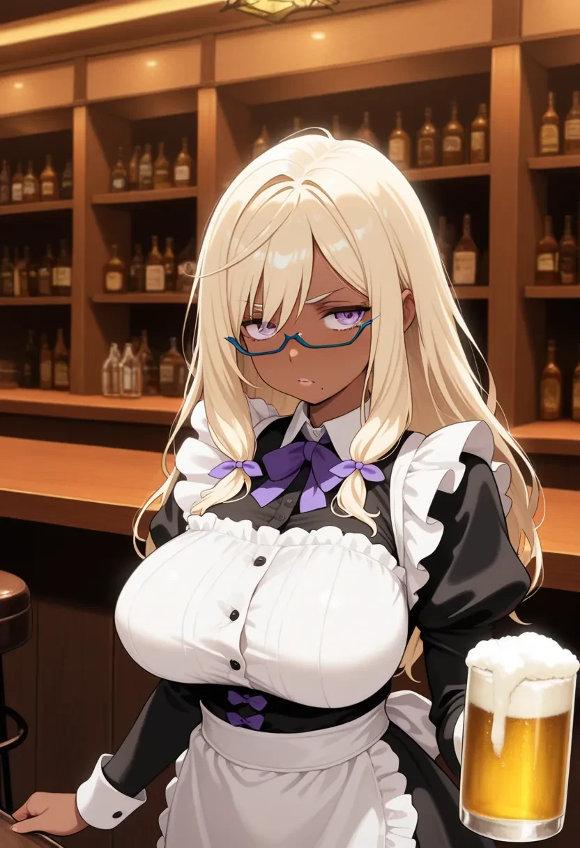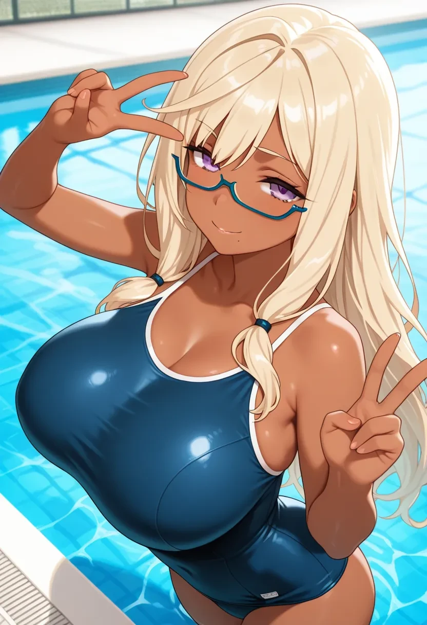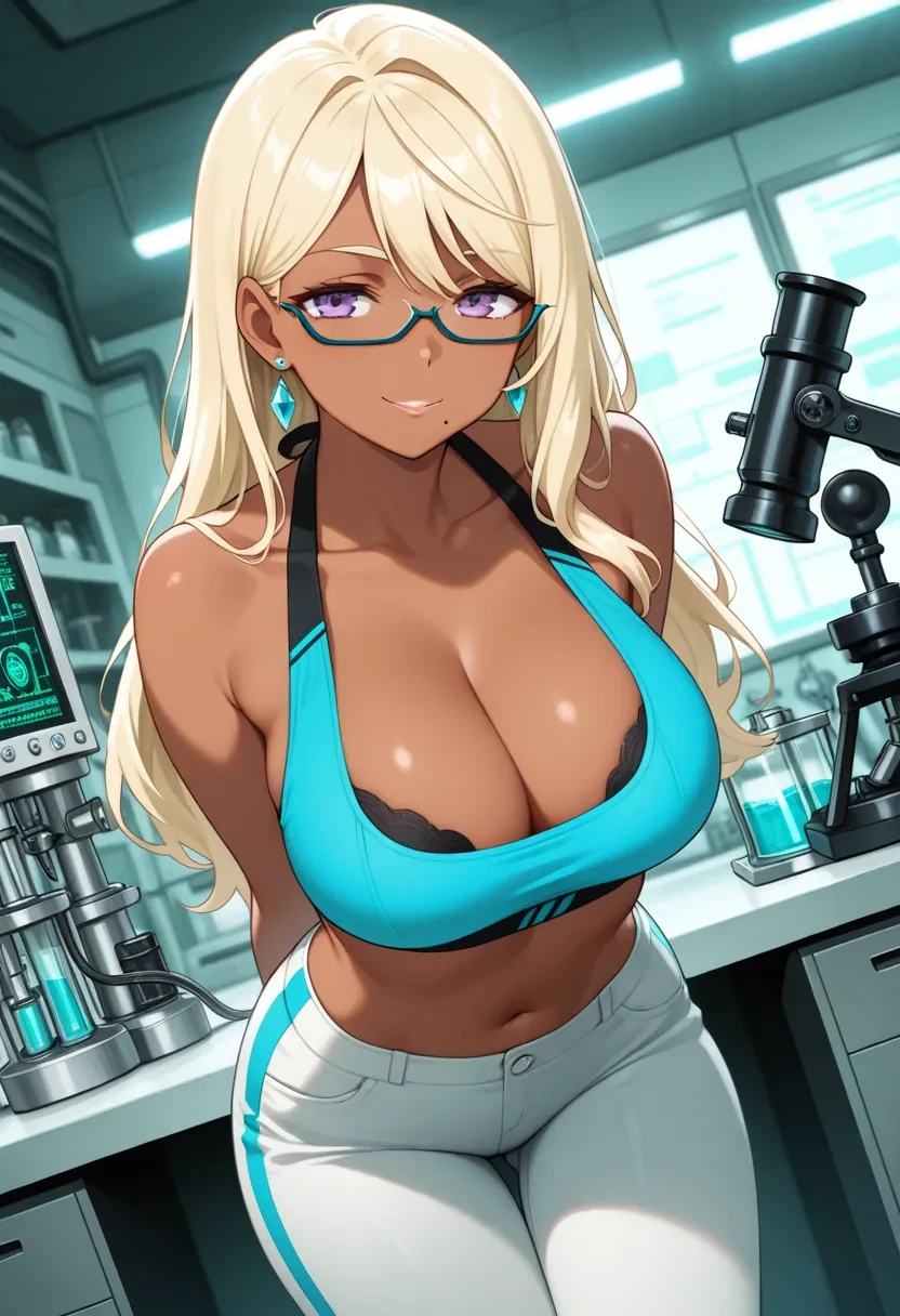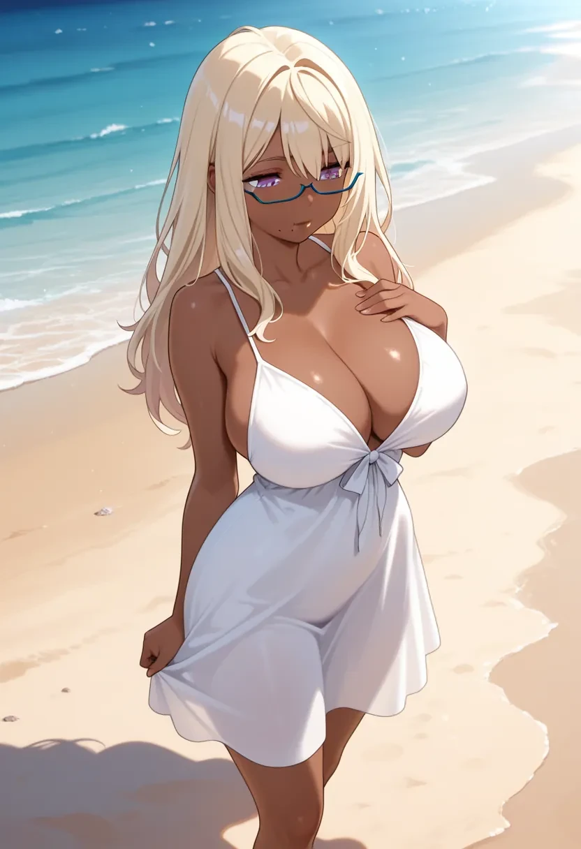 D5, long hair, purple eyes, glasses, dark skin, dark-skinned female, blonde hair, under-rim eyewear, mole, mole under mouth,