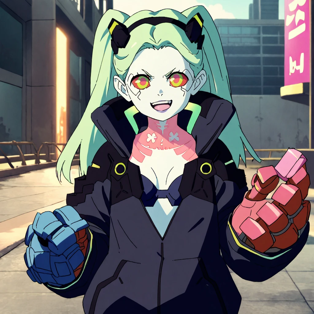 Trigger with big hands: RebeccaBigHands, 1girl, rebecca (cyberpunk), twintails, black jacket, red sclera, green hair, neck tattoo, colored skin, black bra, underwear, oversized limbs, headgear, black hairband, cyborg, partially unzipped, mechanical eye, artificial eye, long hair, mechanical hands, red pupils, cowboy shot