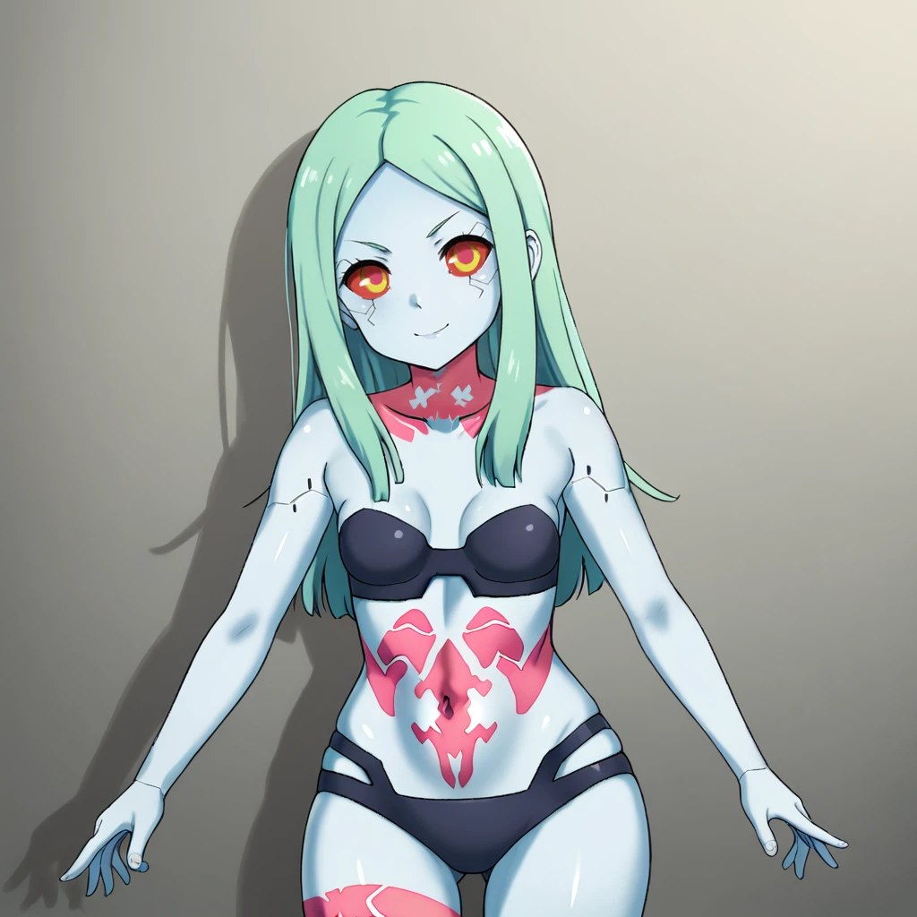 Trigger with long hair: RebeccaLongHair, 1girl, rebecca (cyberpunk), small breasts, underwear only, black bra, navel, long hair, stomach tattoo, black panties, colored skin, red sclera, leg tattoo, straight hair, artificial eye, mechanical eye, neck tattoo, green hair, strapless bra, blue skin, collarbone, red eyes, cyborg, cowboy shot