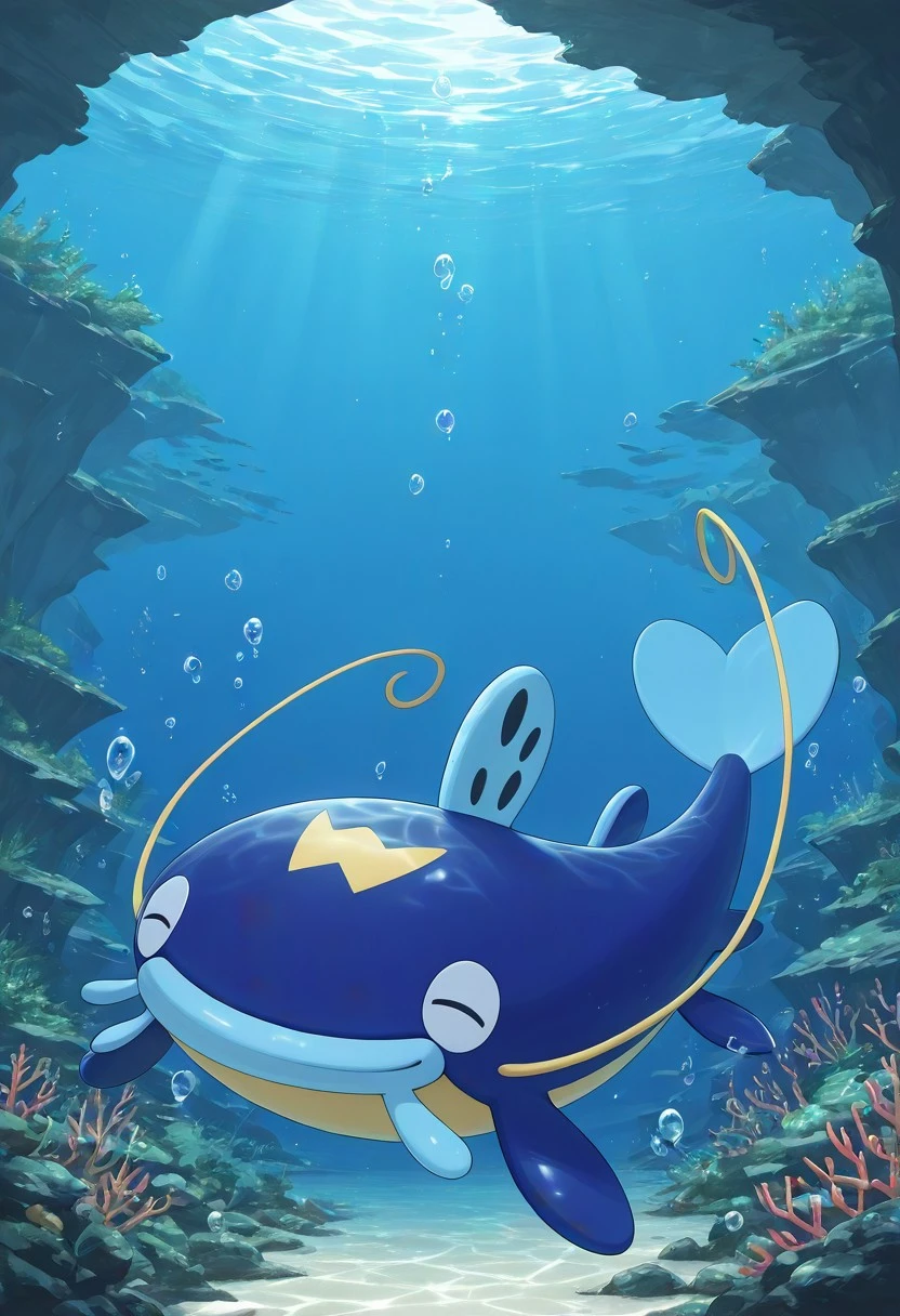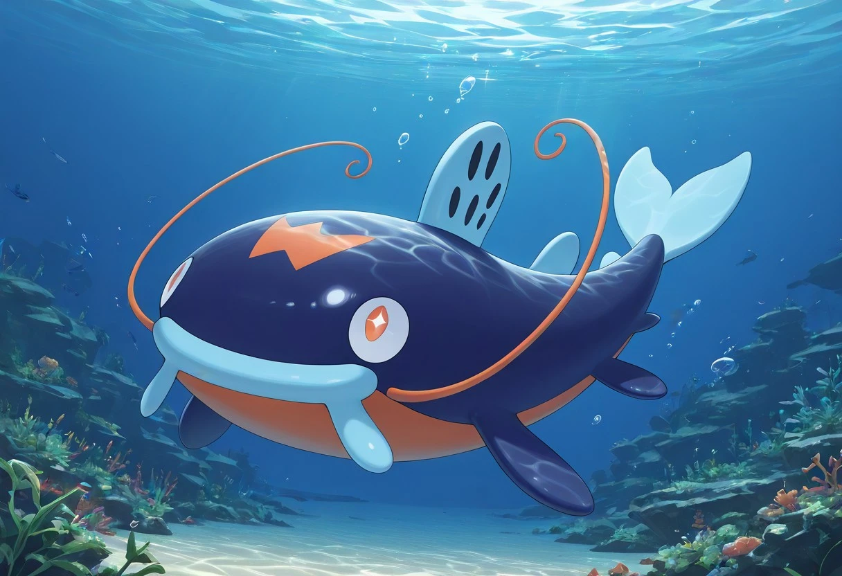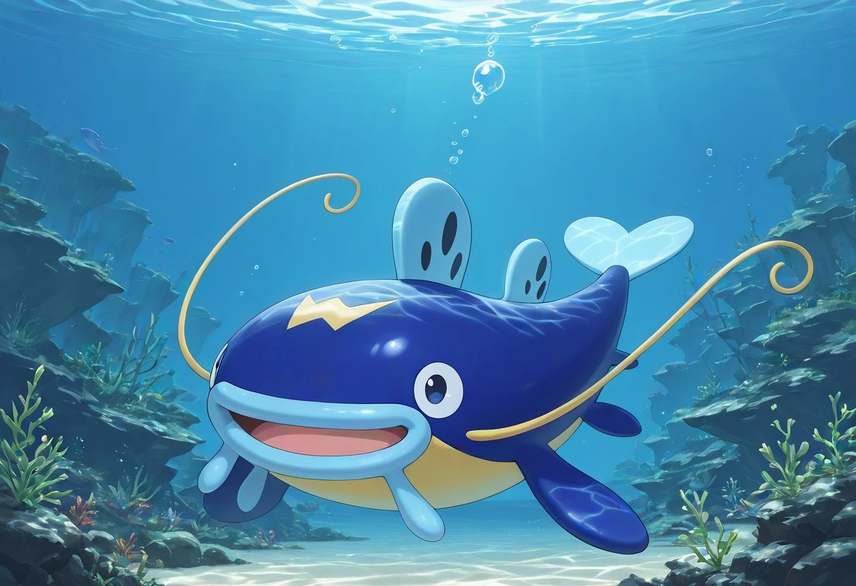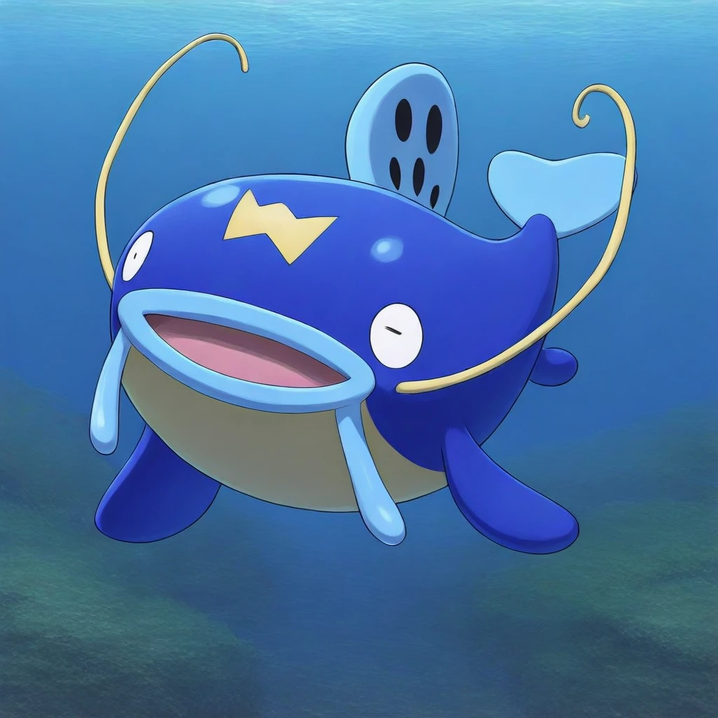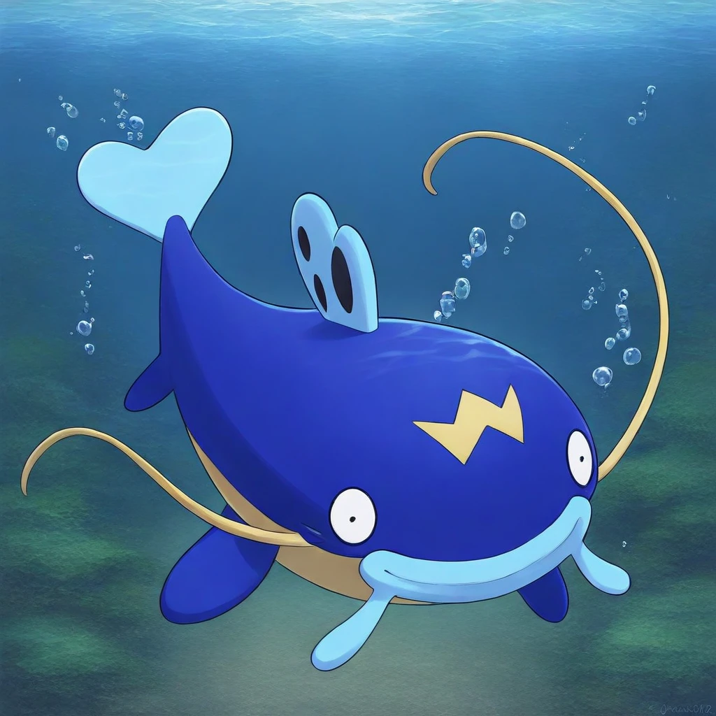 Whiscash_pkmn, royal blue scales, yellow whiskers, yellow underbelly, yellow forehead mark, light blue dorsal fin, light blue tailfin, light blue mouth