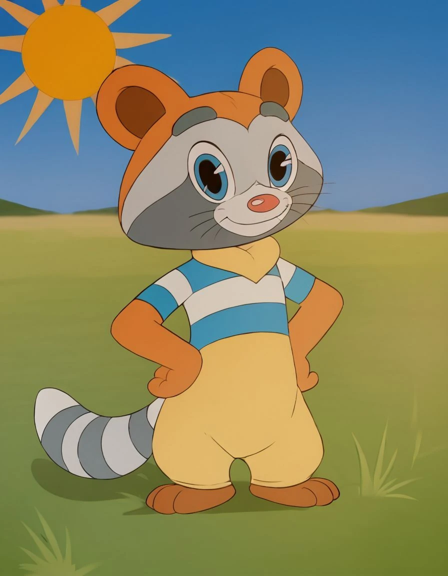 kroshkaenot, raccoon, 1boy, grey face, tail, orange fur, blue eyes, grey eyebrows, whiskers, pink nose