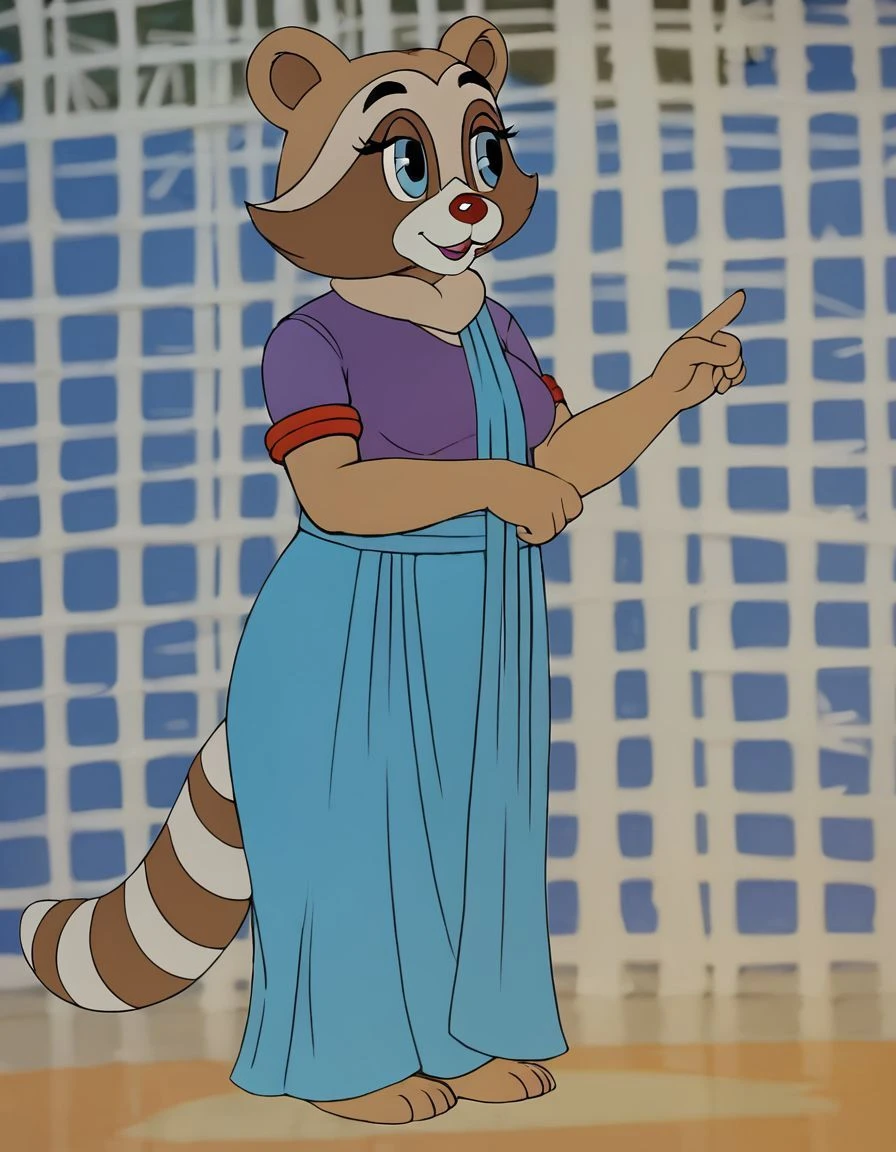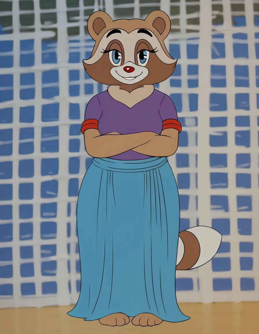 kroshkaenot_mama, raccoon, brown fur, blue eyes, black eyebrows, red nose, 1girl,