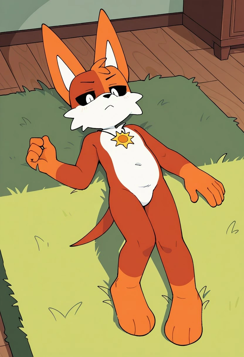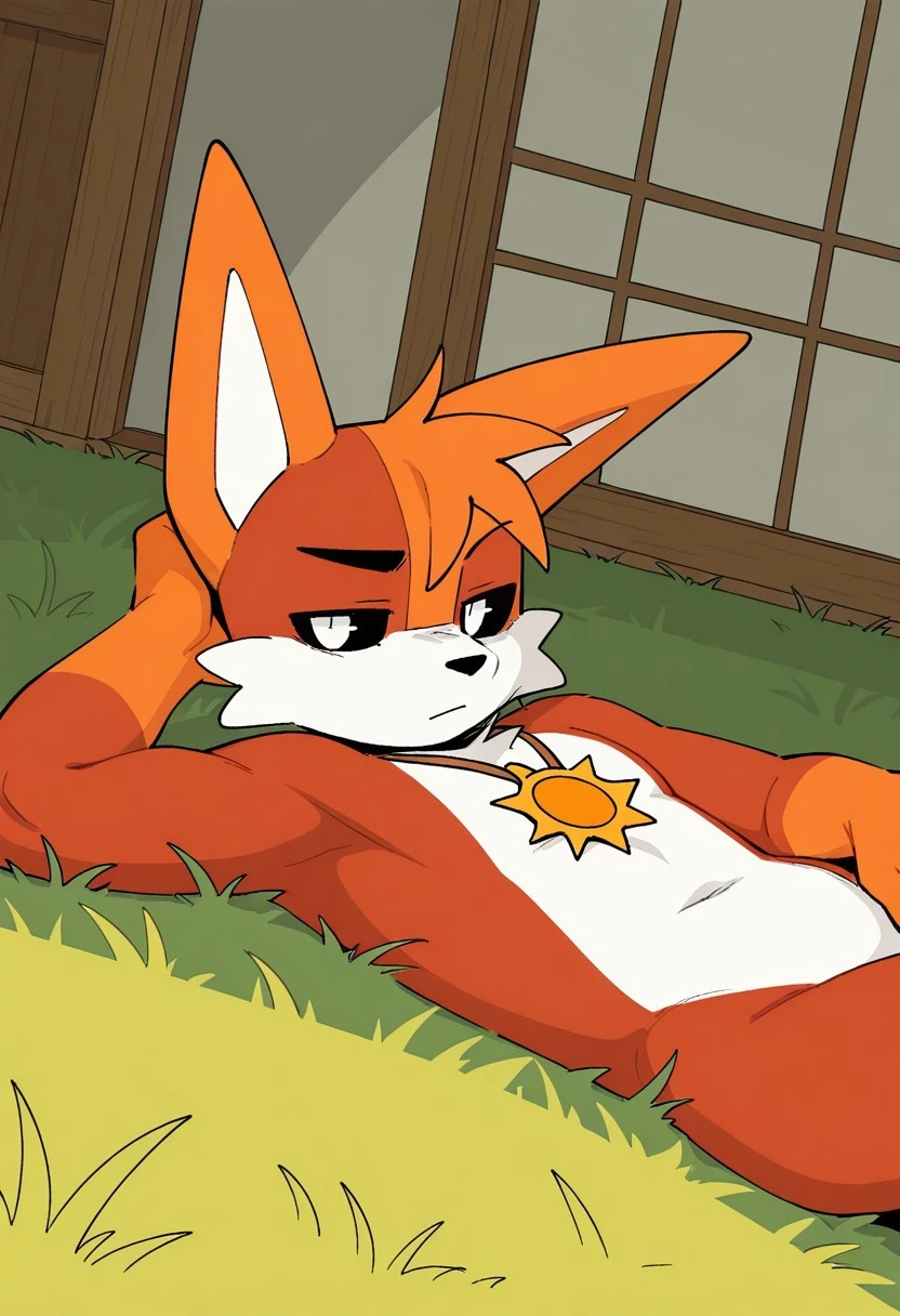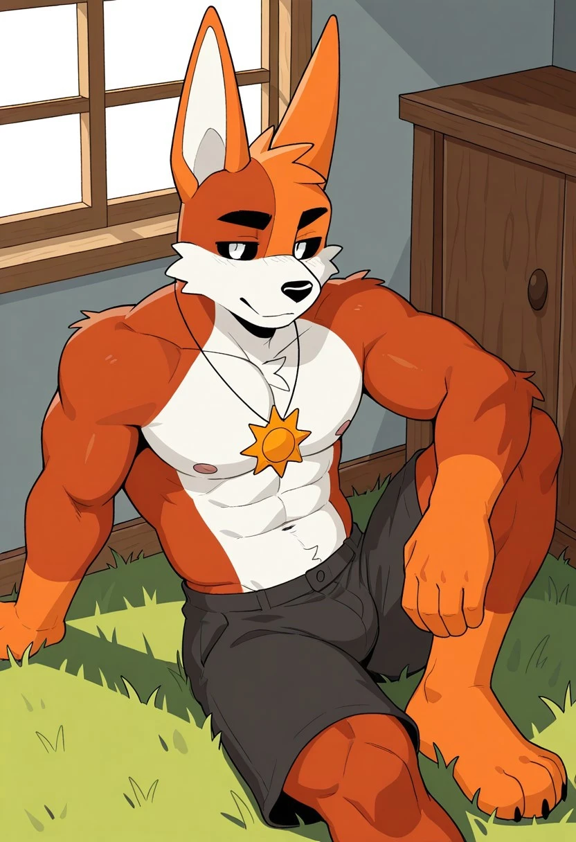 solo, furry, anthro, male, doberman, canine, canine, reddish fur, light-orange hands, light-orange paws, split orange head color, left side Reddish face, white mouth, white cheek tufts, white stomach, light-orange ears, black sclera, white eyes, sun necklace
