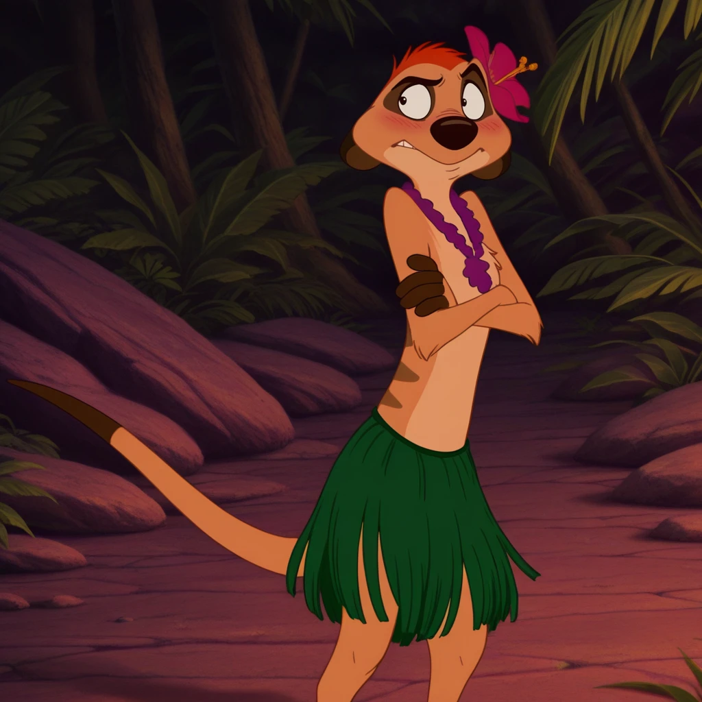 flower in hair, purple flower necklace, grass skirt