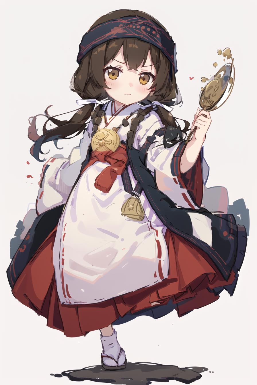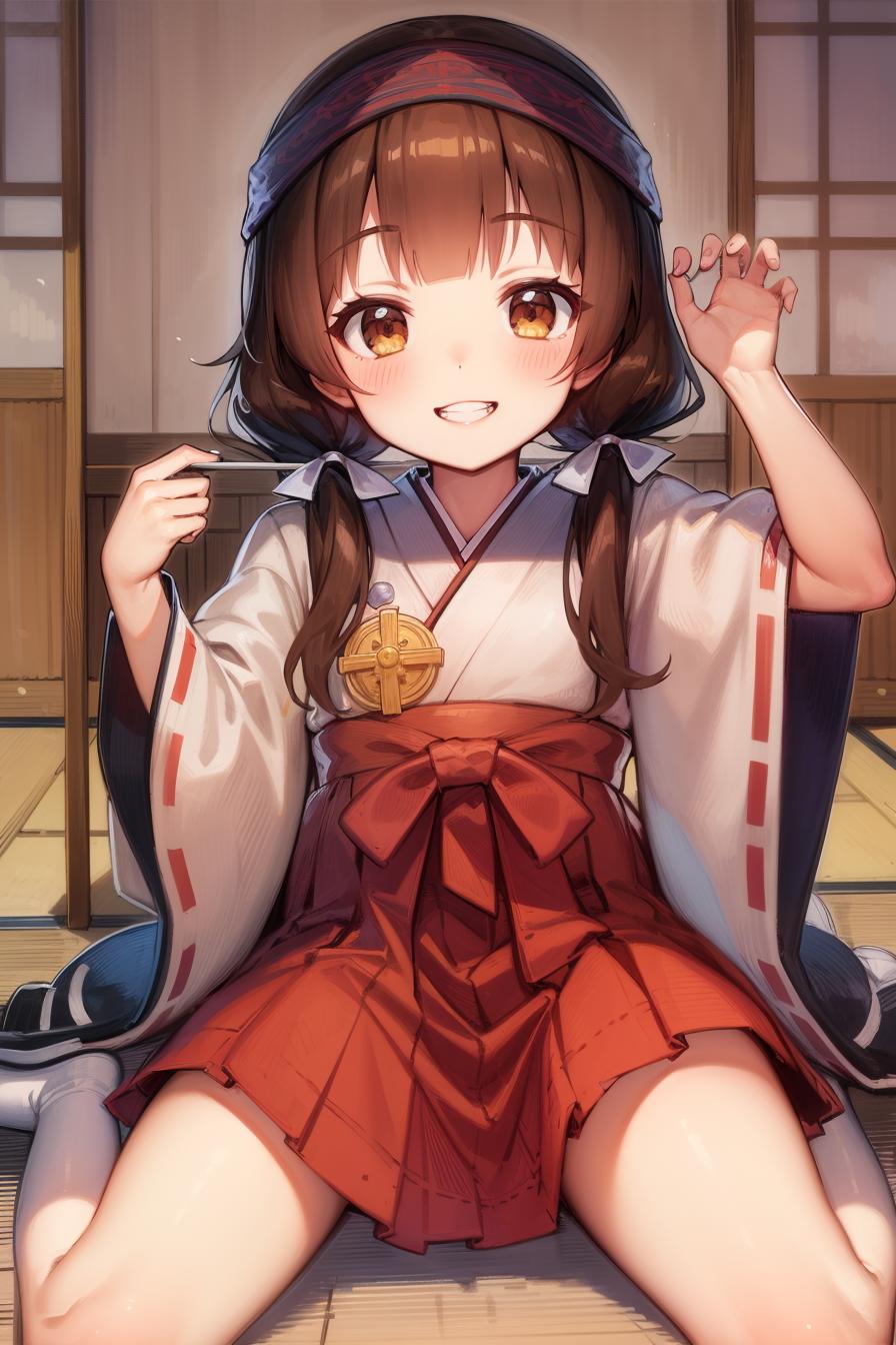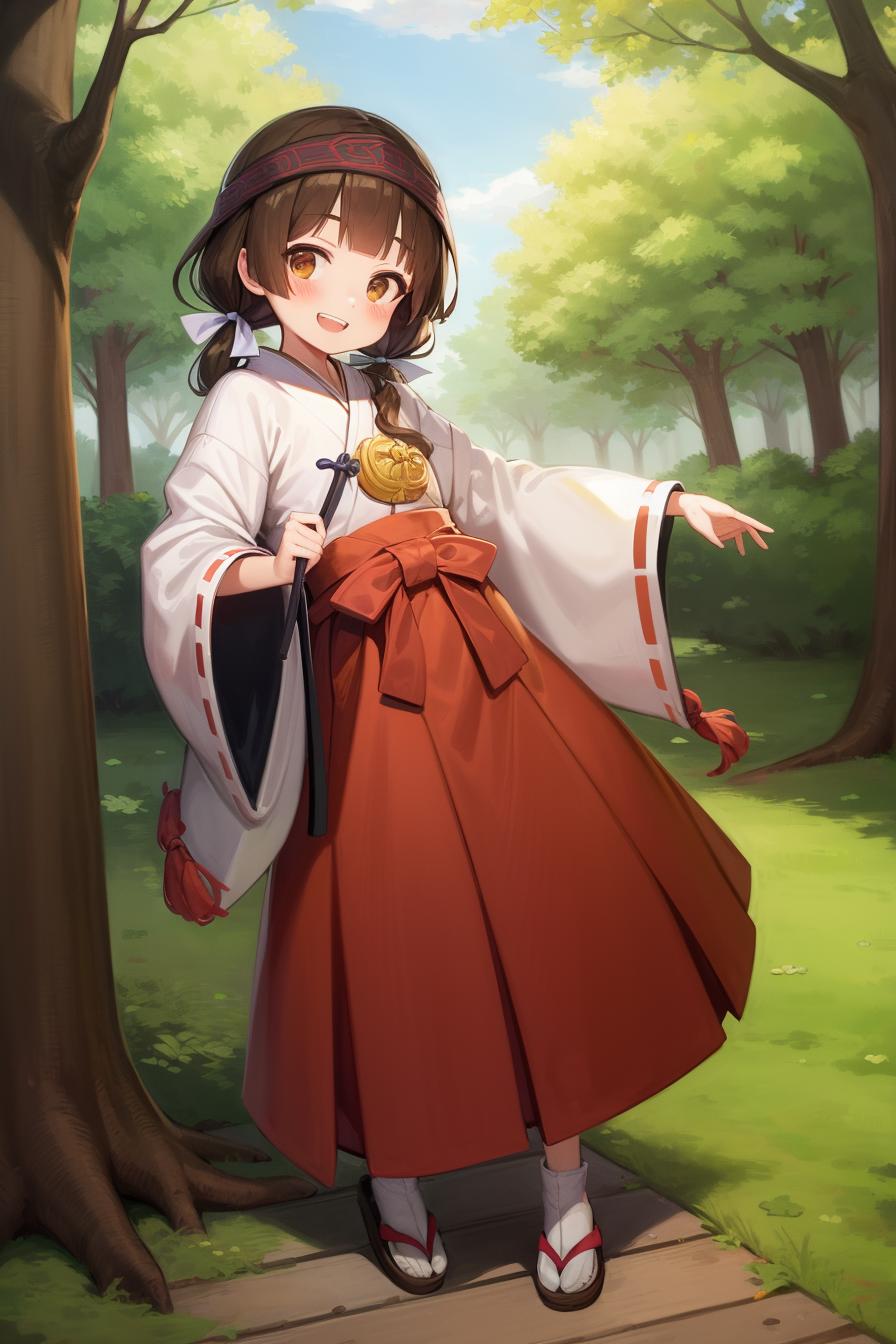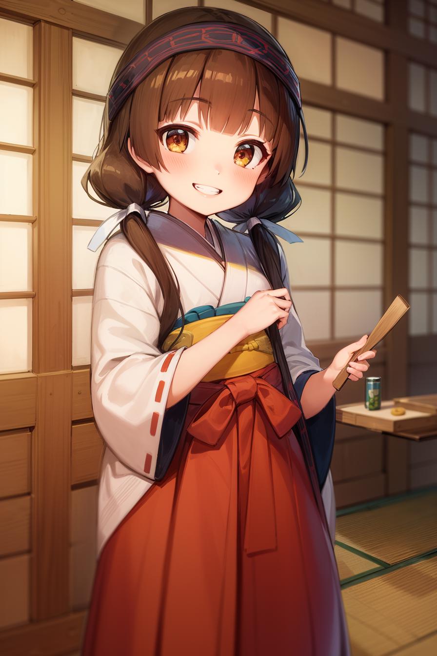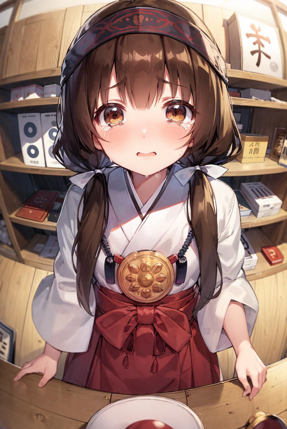 amayadori machi, blush, brown eyes, brown hair, hair ribbon, hakama, hakama skirt, headband, holding, japanese clothes, kumamiko, low twintails, miko, red hakama, ribbon, skirt, twintails, white ribbon, <lora:AmayadoriMachi_civit:1>