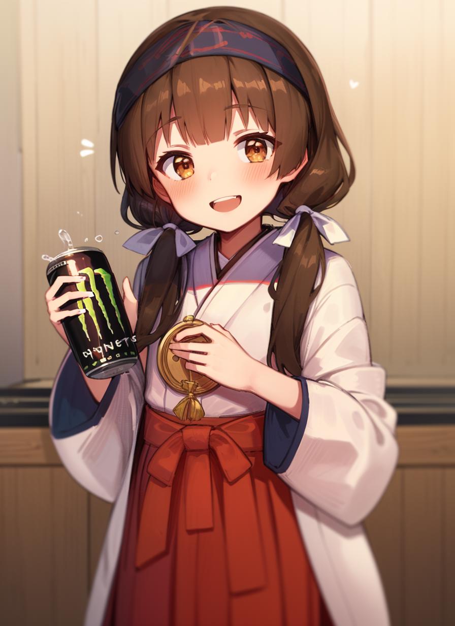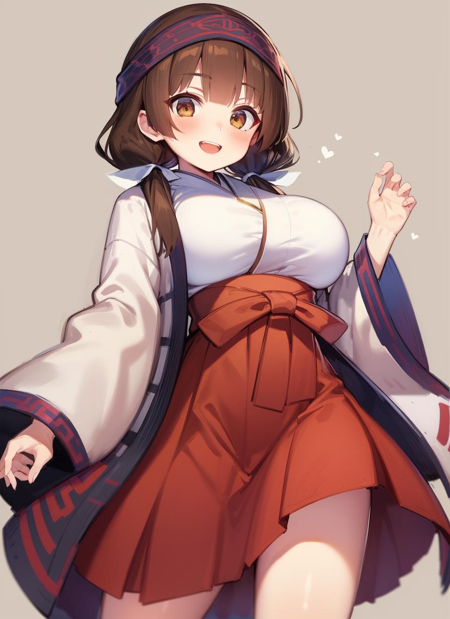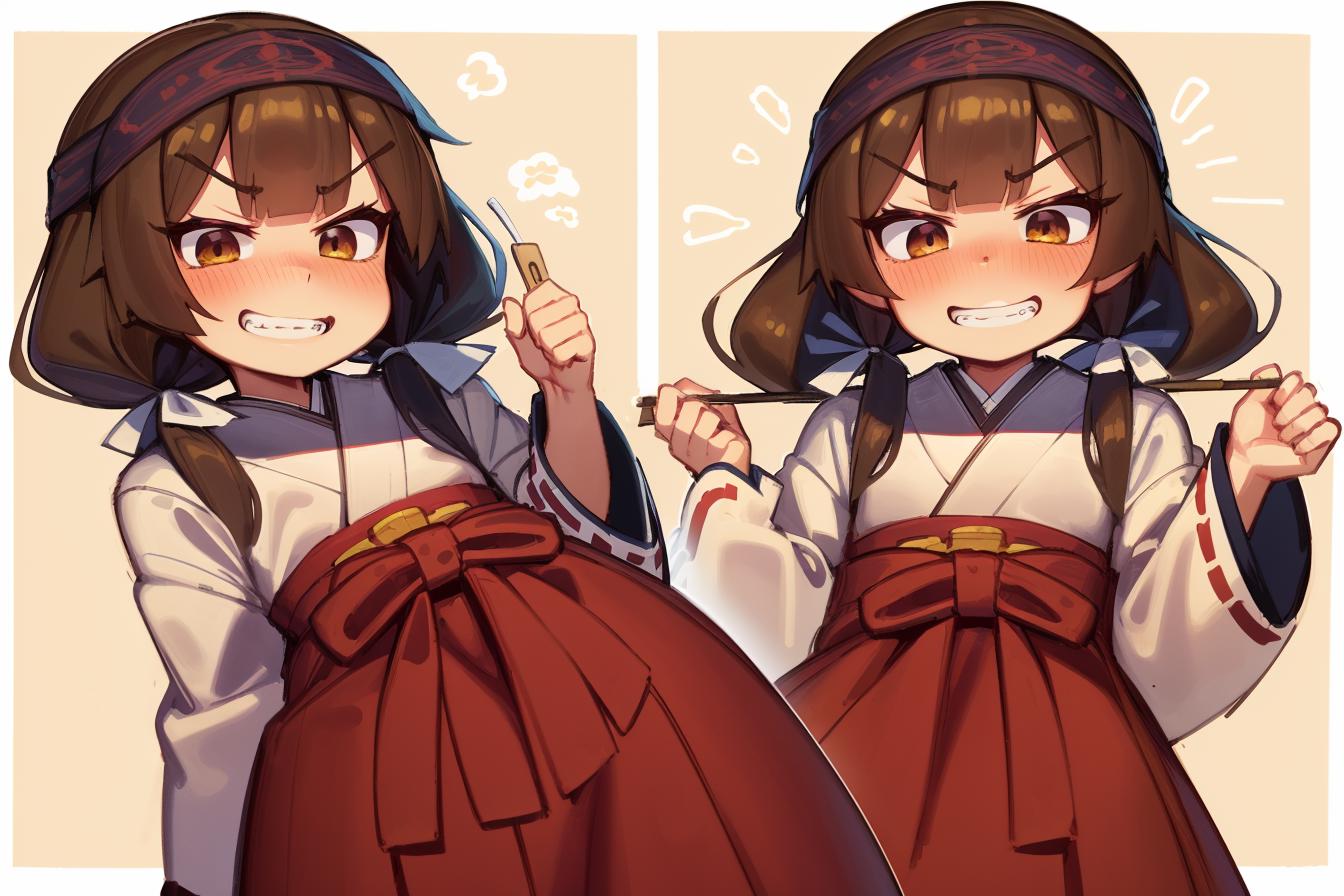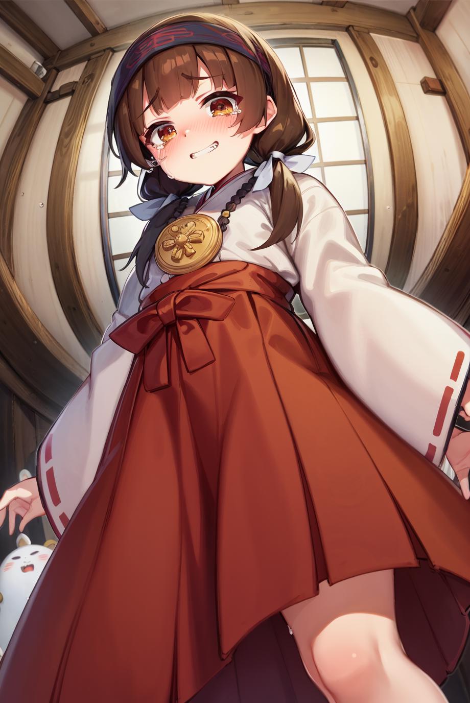 amayadori machi, blush, brown eyes, brown hair, hair ribbon, hakama, hakama skirt, headband, holding, japanese clothes, kumamiko, low twintails, miko, red hakama, ribbon, skirt, twintails, white ribbon, <lora:AmayadoriMachi_civit:1>