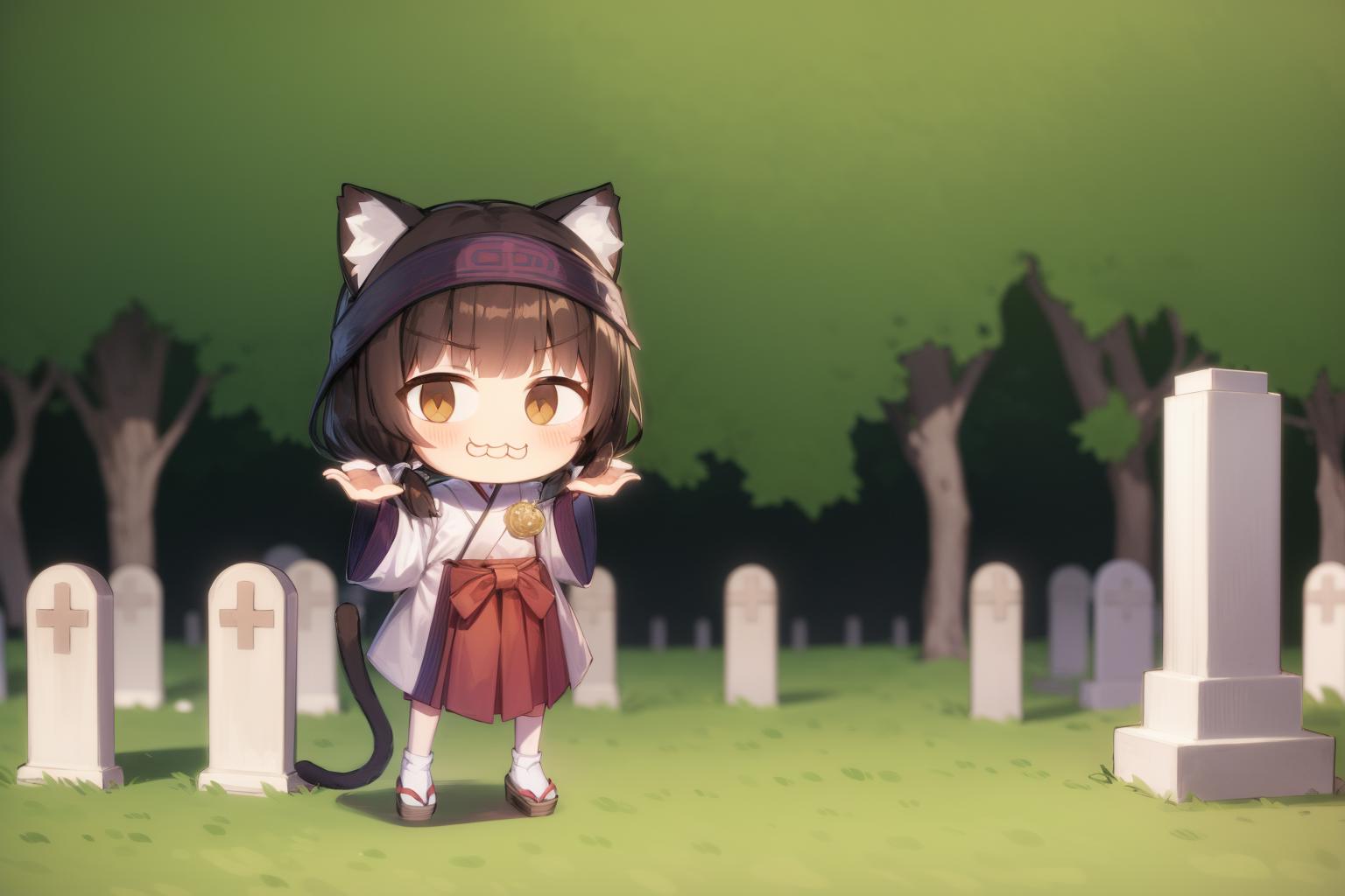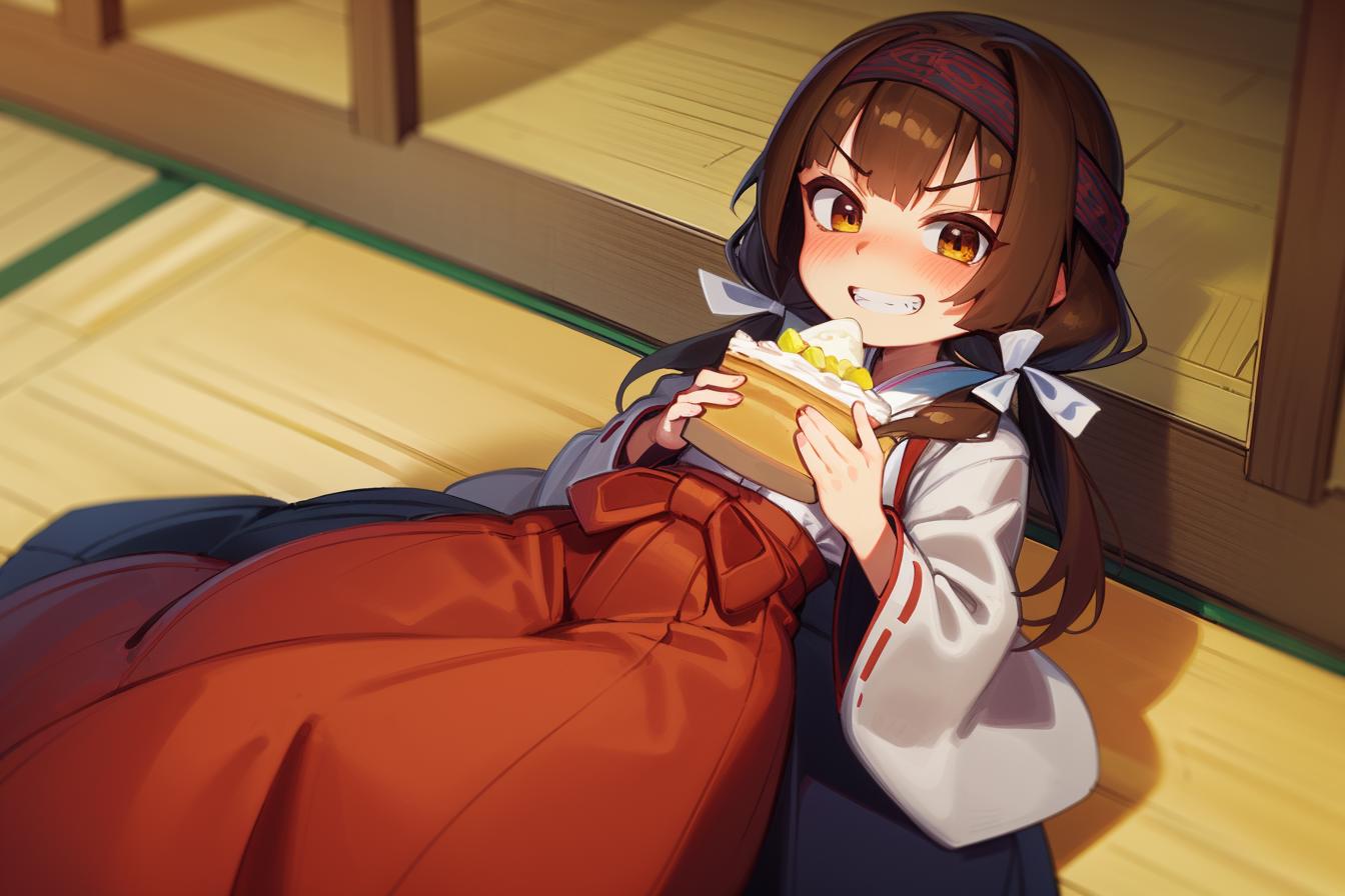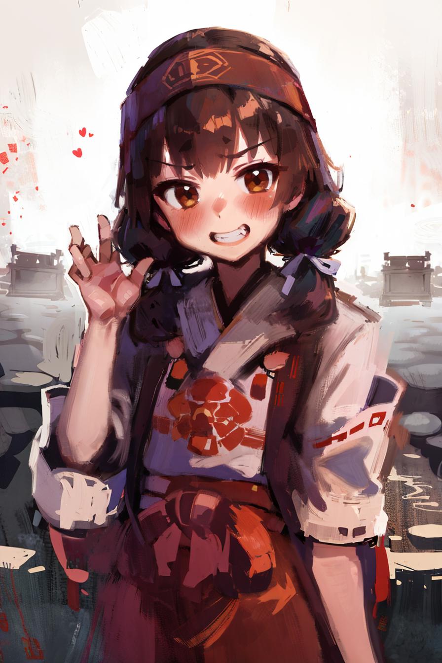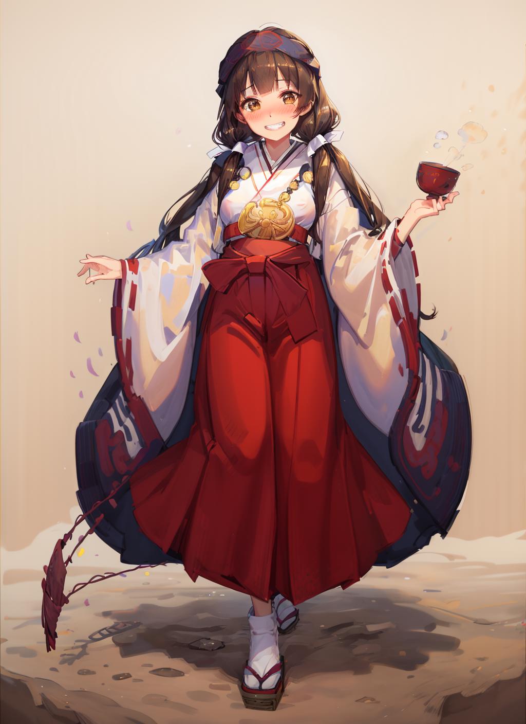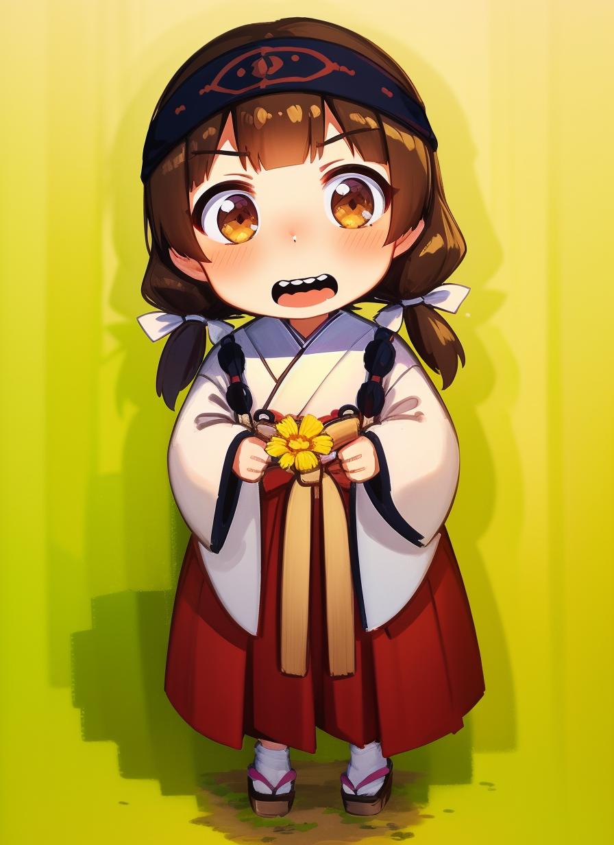amayadori machi, blush, brown eyes, brown hair, hair ribbon, hakama, hakama skirt, headband, holding, japanese clothes, kumamiko, low twintails, miko, red hakama, ribbon, skirt, twintails, white ribbon, <lora:AmayadoriMachi_civit:1>