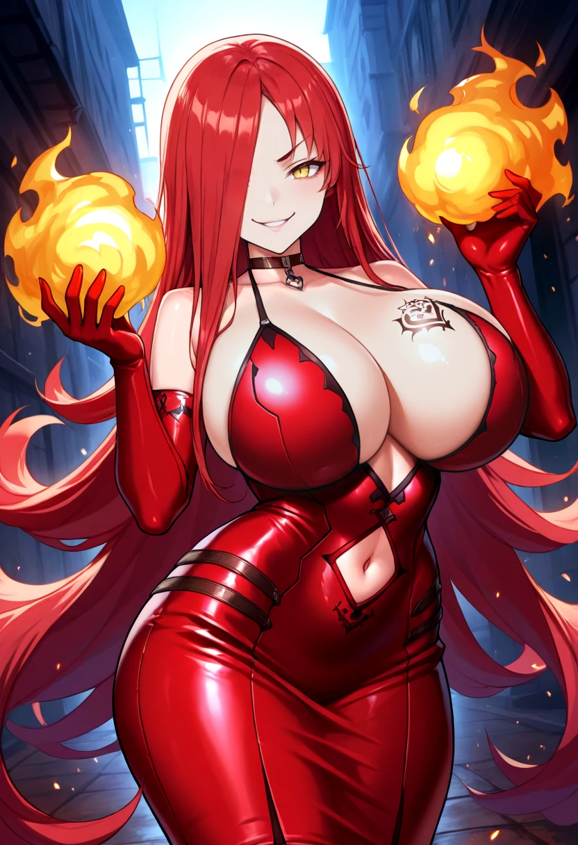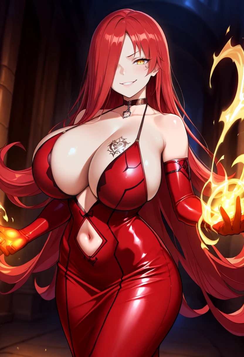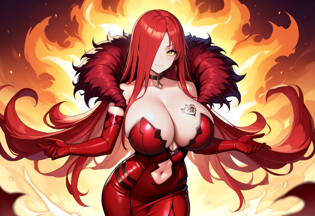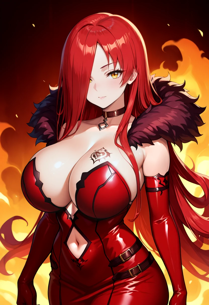 Default Outfit: ml-astarog, cleavage, curvy, elbow gloves, fur trim , hair over one eye, navel cutout, red dress, red gloves, red hair, tight dress, very long hair, yellow eyes, huge breasts, strapless dress, breast tattoo, leather choker