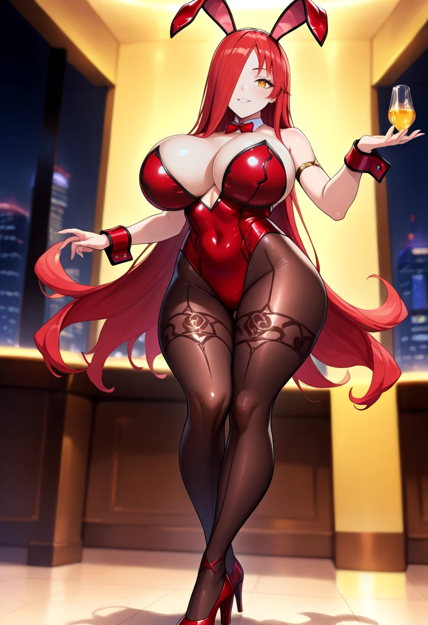 Bunny Suit: astabun, fake animal ears, high heels, huge breasts, pantyhose, playboy bunny, rabbit ears, red hair, red leotard, very long hair, wrist cuffs yellow eyes, hair over one eye, red hair, red shoes,