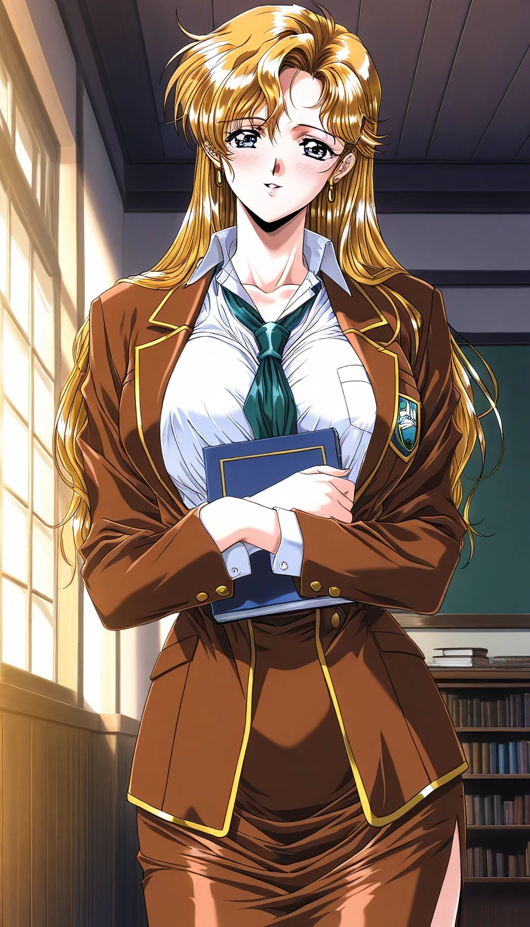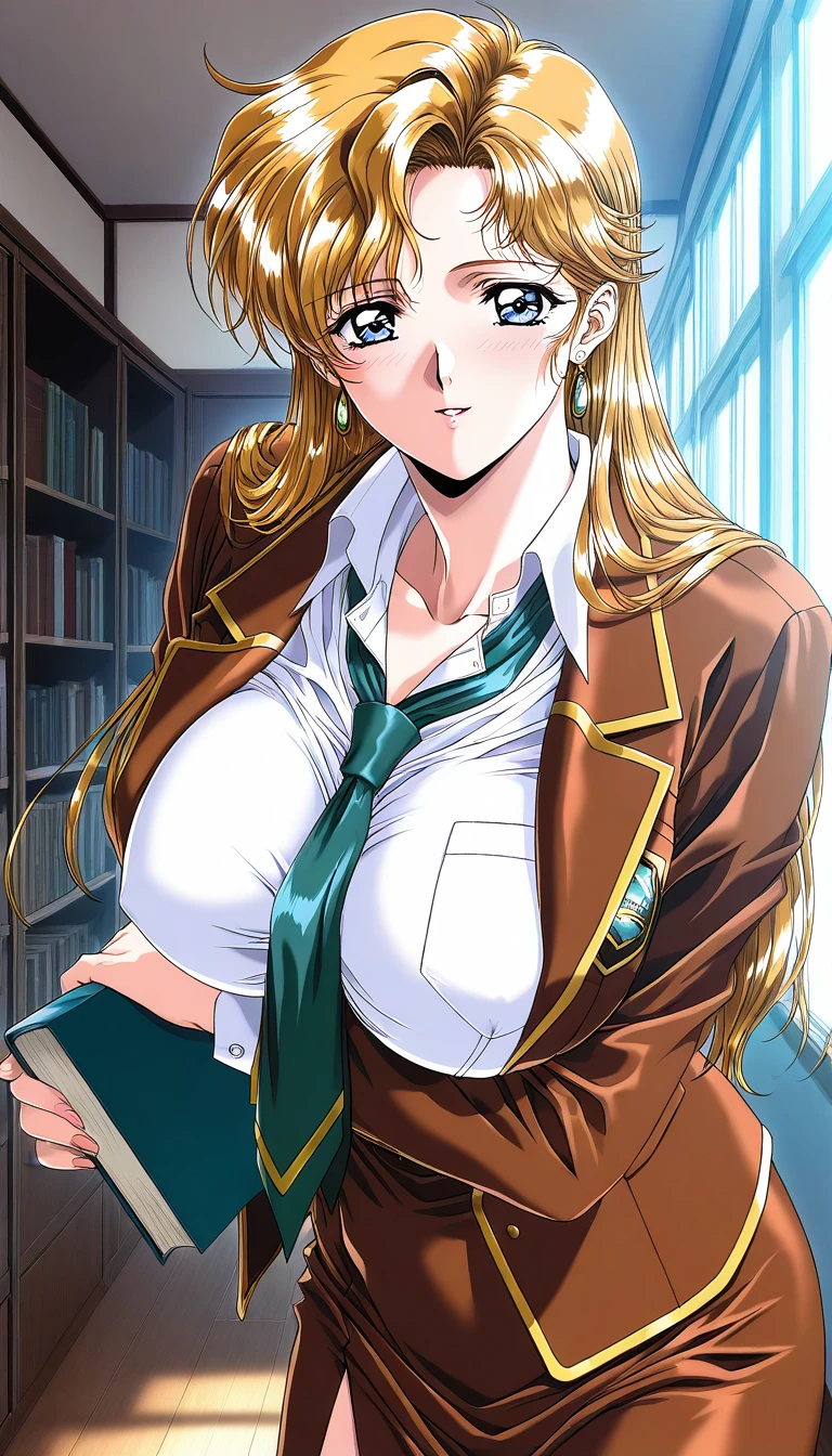 Andou_Kaori, blonde hair, long hair, blue eyes, earrings, huge breasts, 1990s (style), yokota mamoru style,